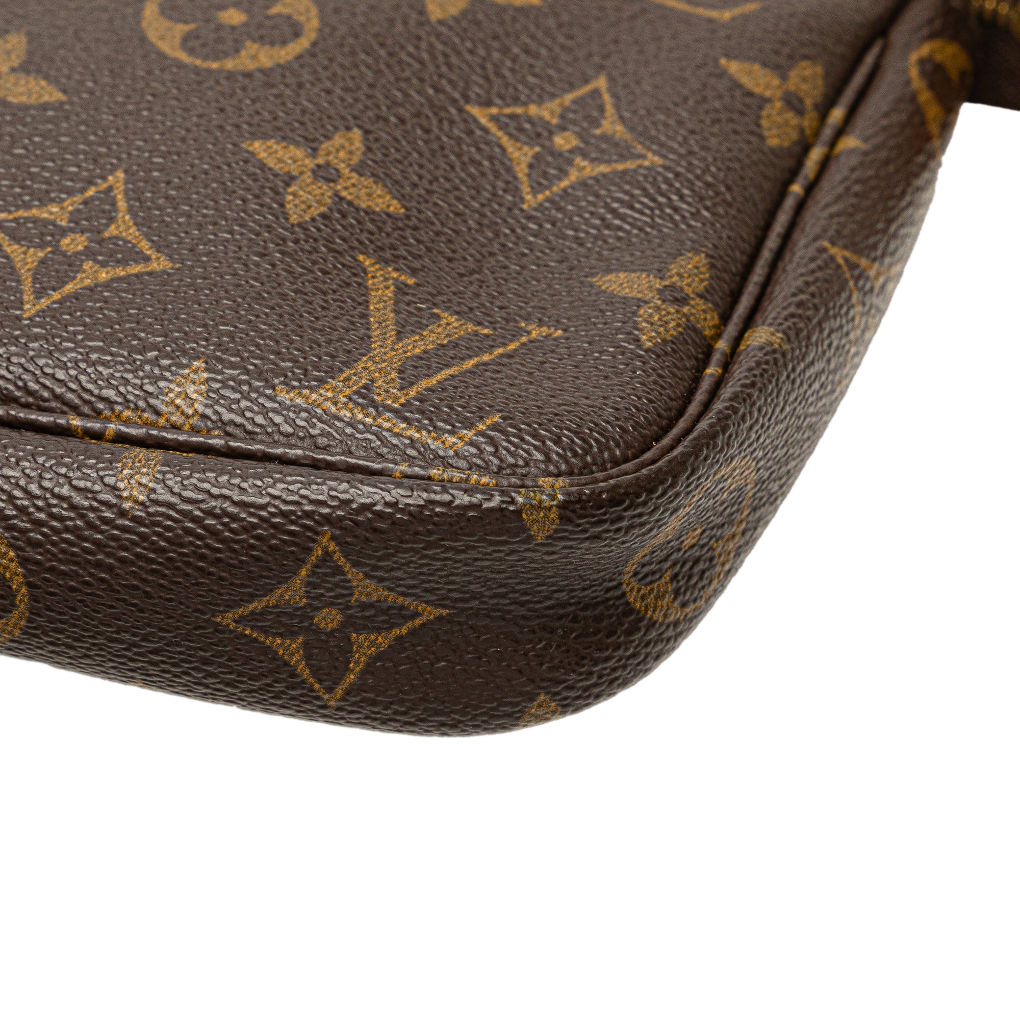 The Pochette Accessoires features a monogram canvas body, a flat vachetta leather top handle, and a top zip closure. Retail Price: 1290.00