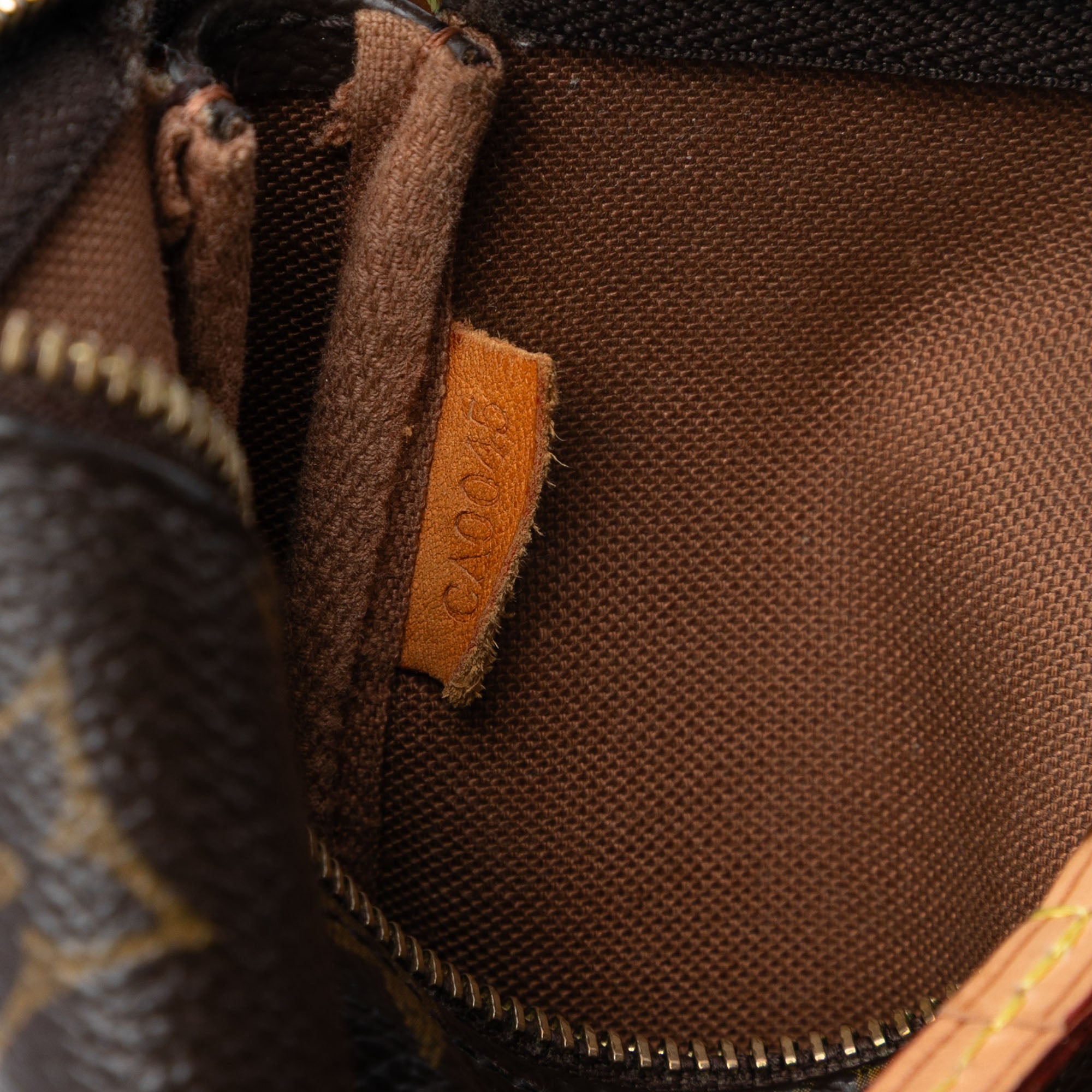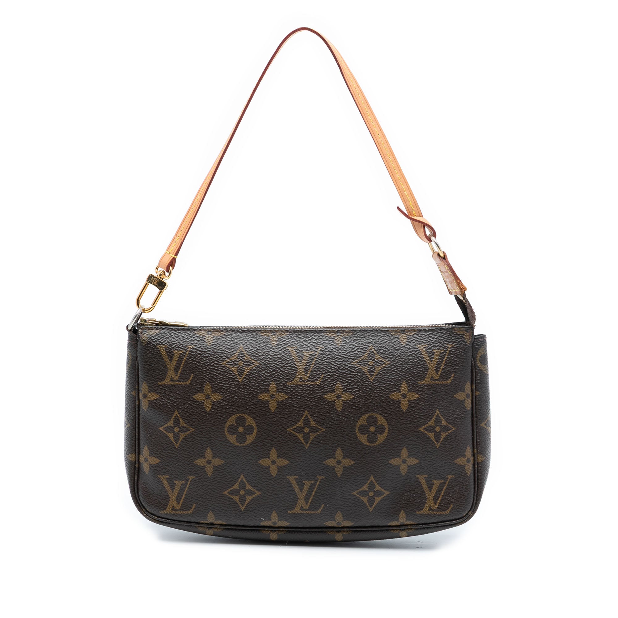 The Pochette Accessoires features a monogram canvas body, a flat vachetta leather handle, and a top zip closure. Retail Price: 1290.00