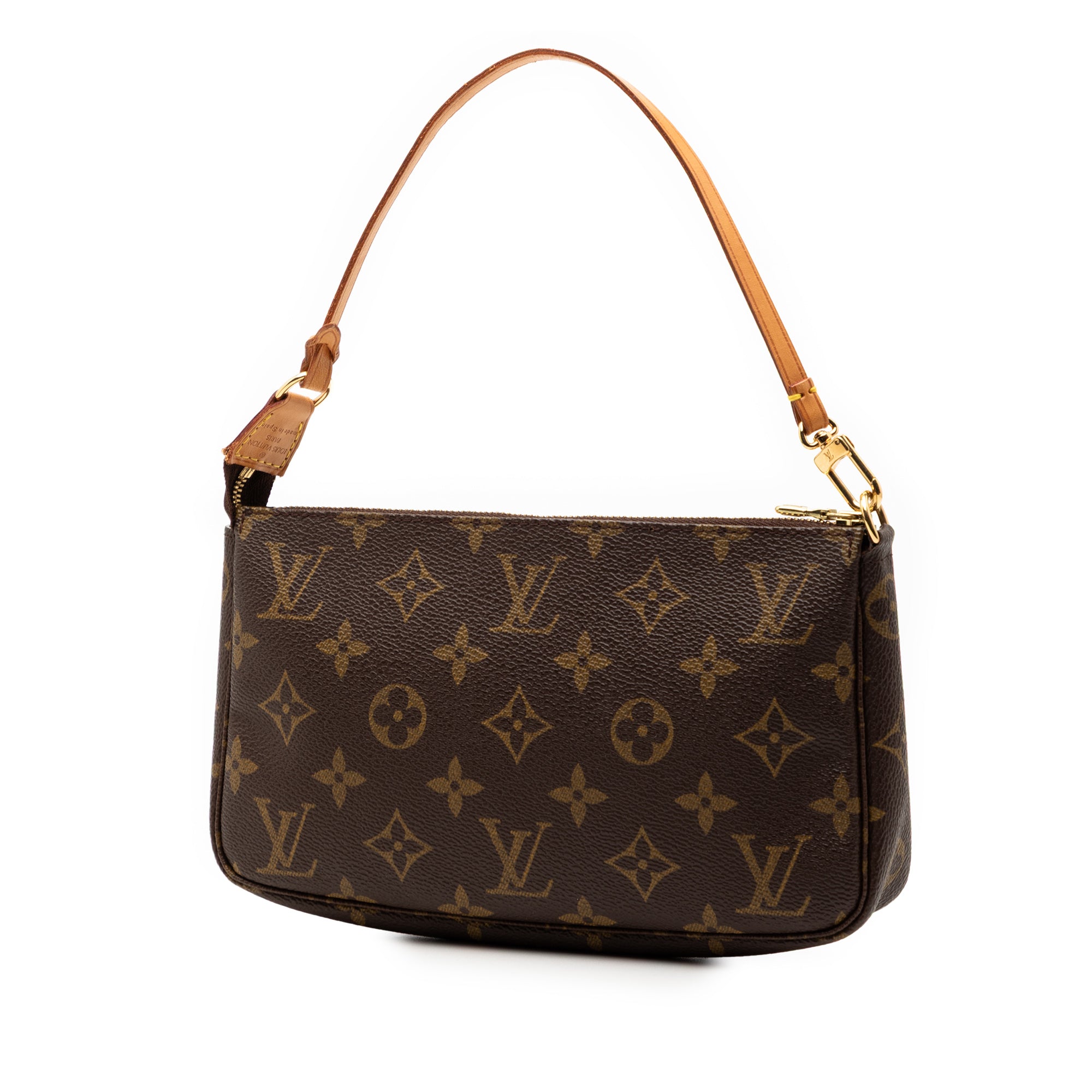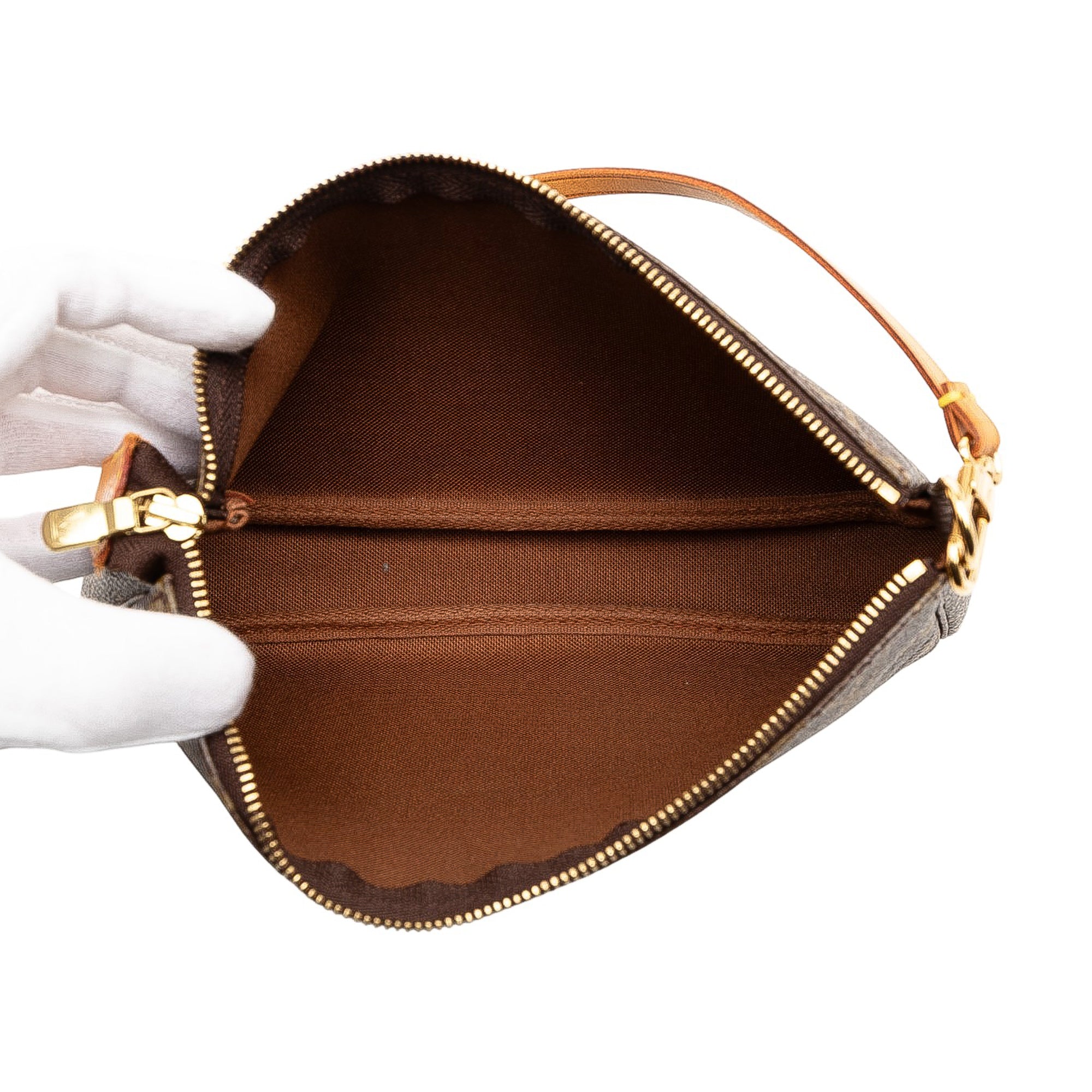 The Pochette Accessoires features a monogram canvas body, a flat vachetta leather strap, and a top zip closure. Retail Price: 1290.00