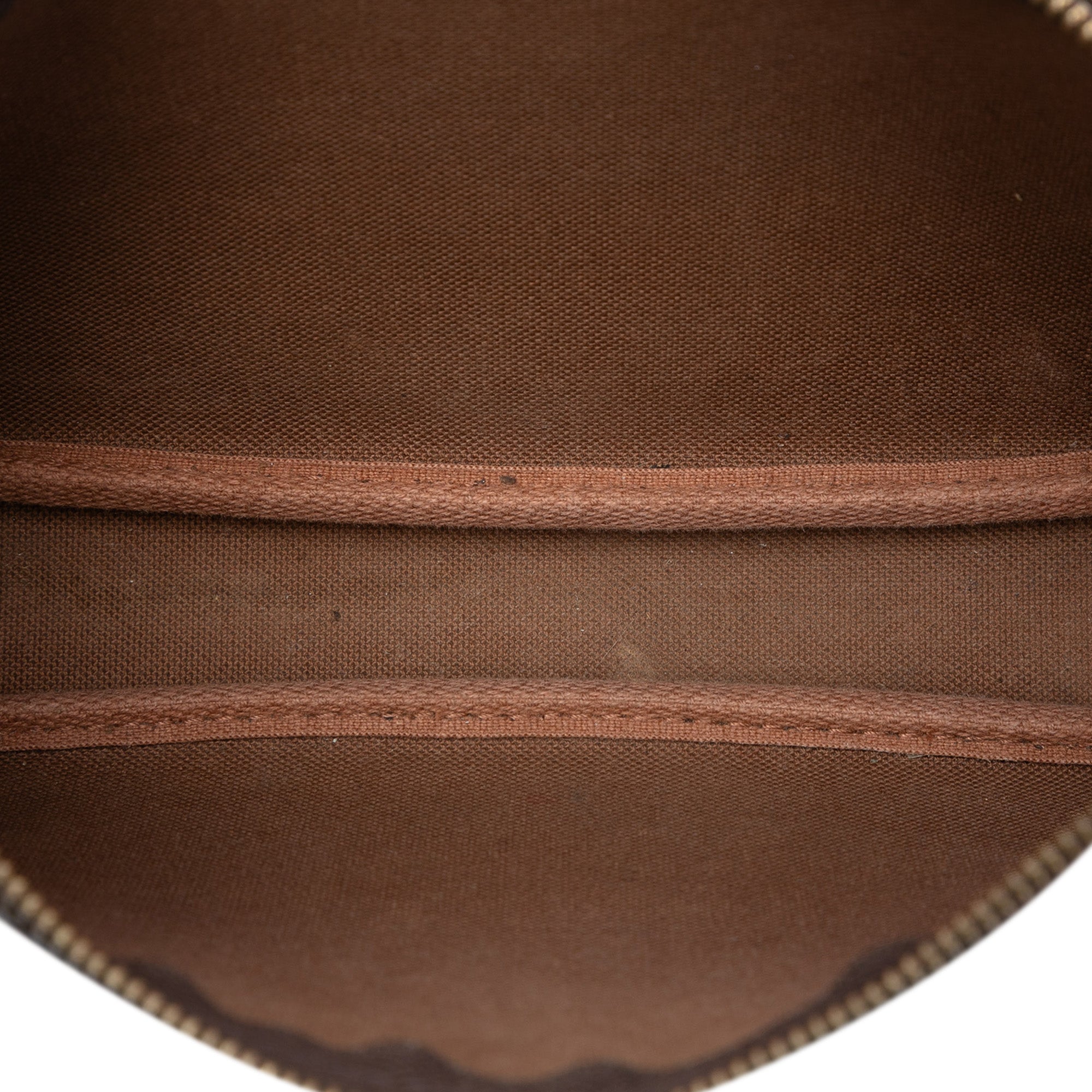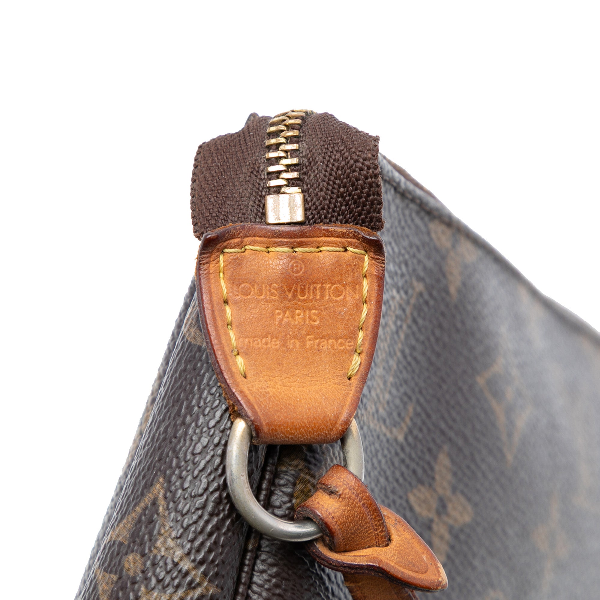 The Pochette Accessoires features a monogram canvas body, a flat vachetta leather strap, and a top zip closure. Retail Price: 1290.00