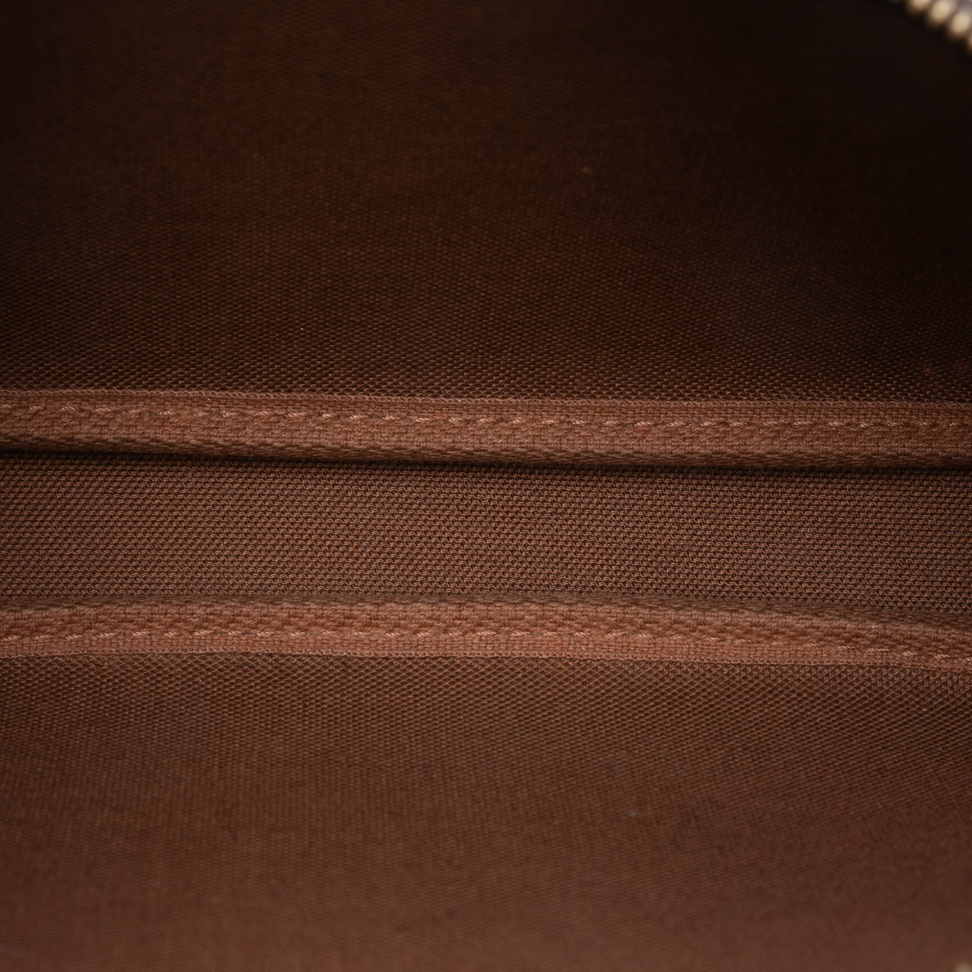 The Pochette Accessoires features a monogram canvas body, a flat vachetta leather handle, and a top zip closure. Retail Price: 1290.00