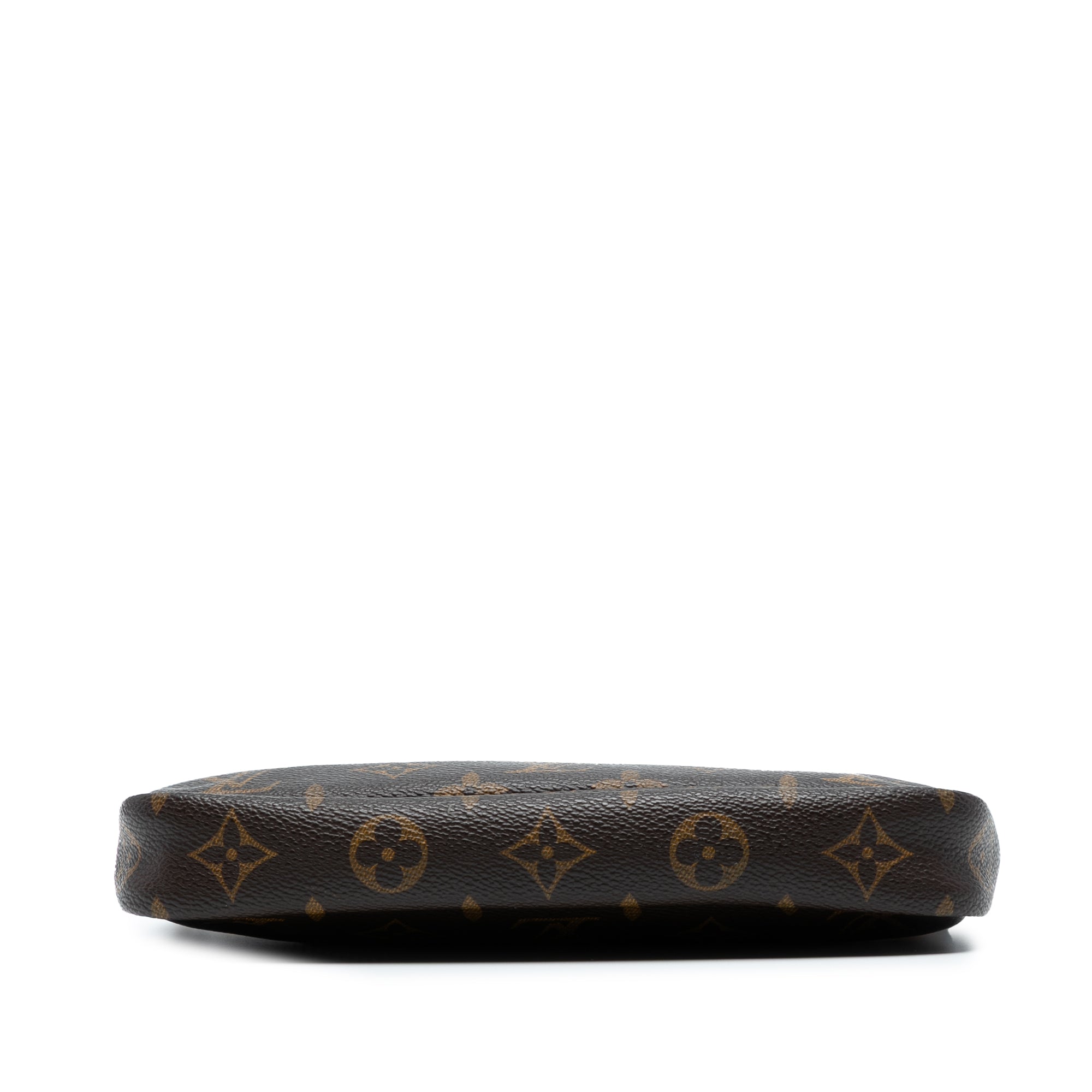 The Pochette Accessoires features a monogram canvas body, a flat vachetta leather handle, and a top zip closure. Retail Price: 1290.00