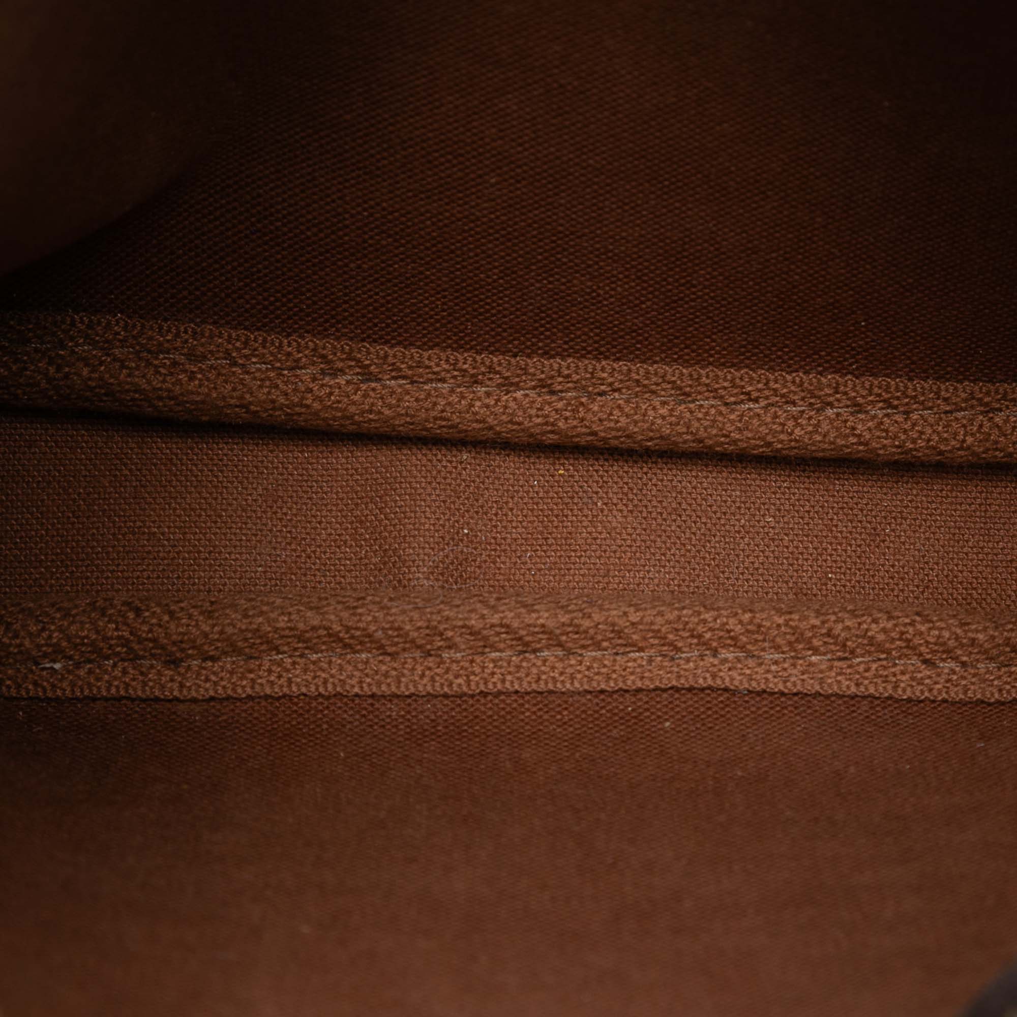The Pochette Accessoires features a monogram canvas body, a flat vachetta leather handle, and a top zip closure. Retail Price: 1290.00