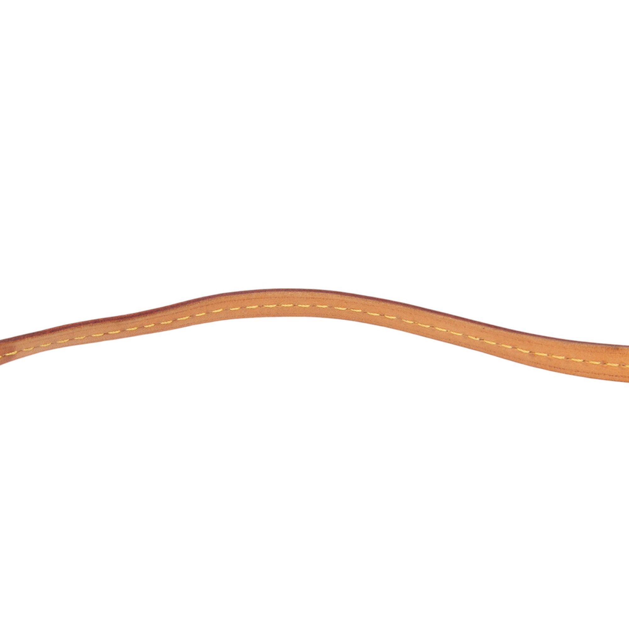 The Pochette Accessoires features a monogram canvas body, a flat vachetta leather strap, and a top zip closure. Retail Price: 1290.00