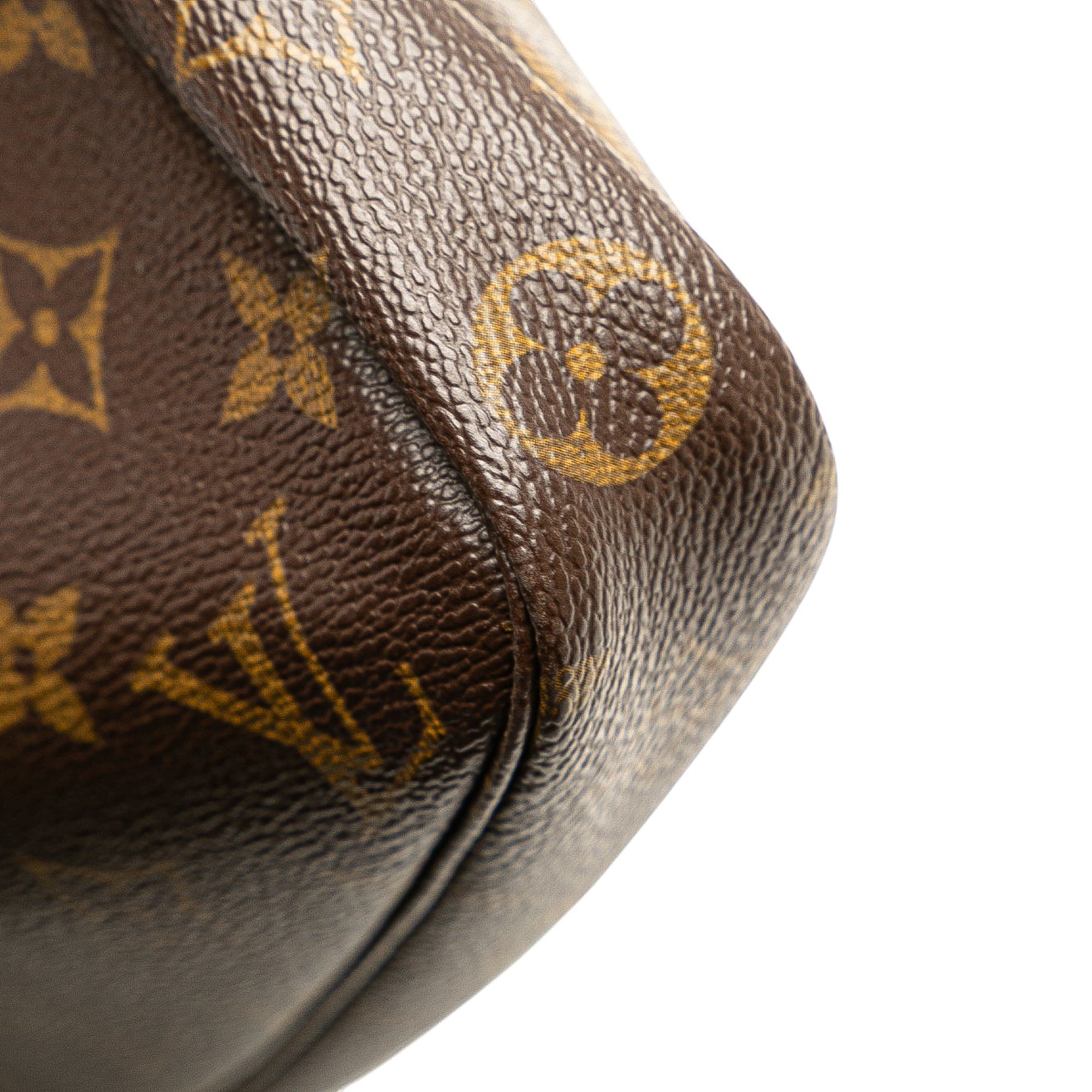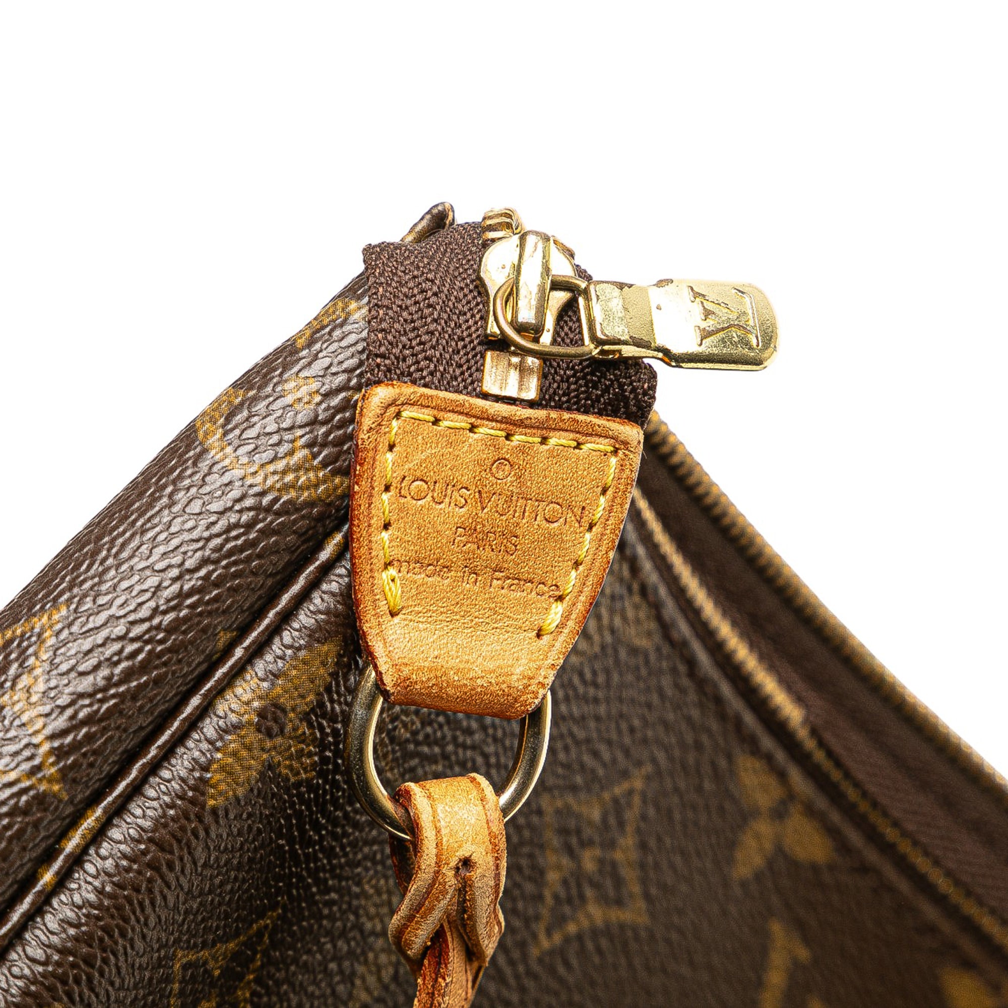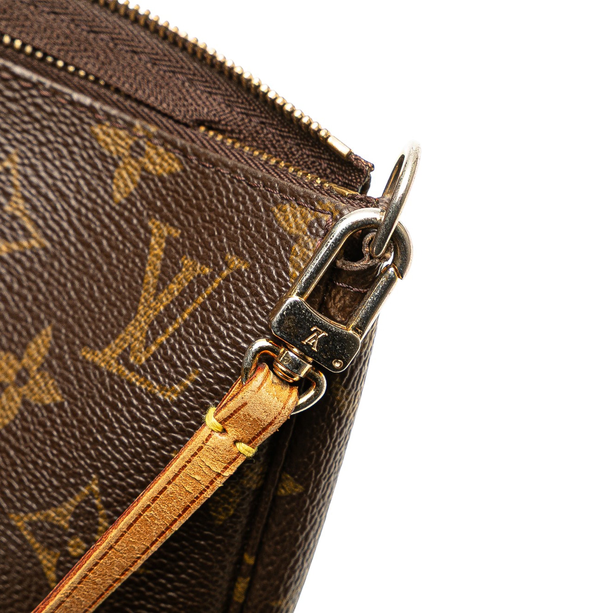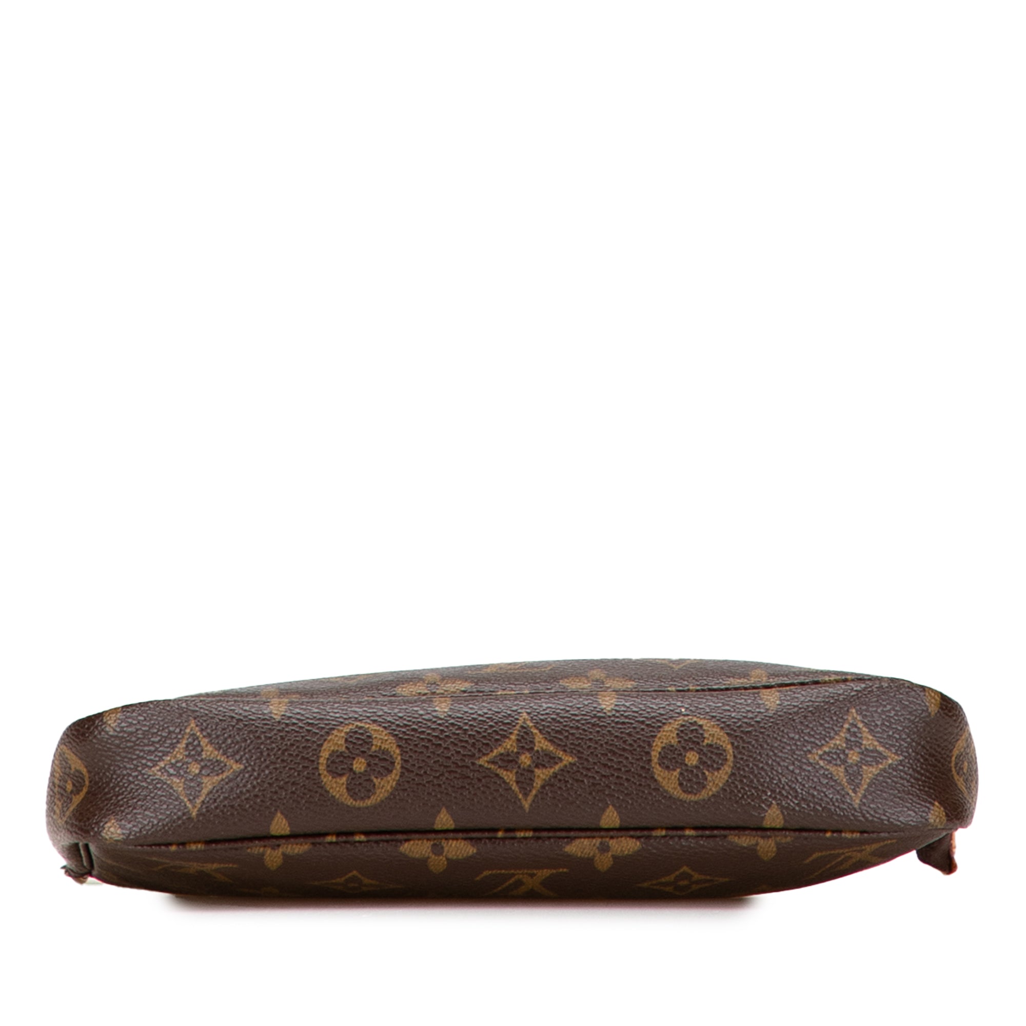The Pochette Accessoires features a monogram canvas body, a flat vachetta leather handle, and a top zip closure. Retail Price: 1290.00