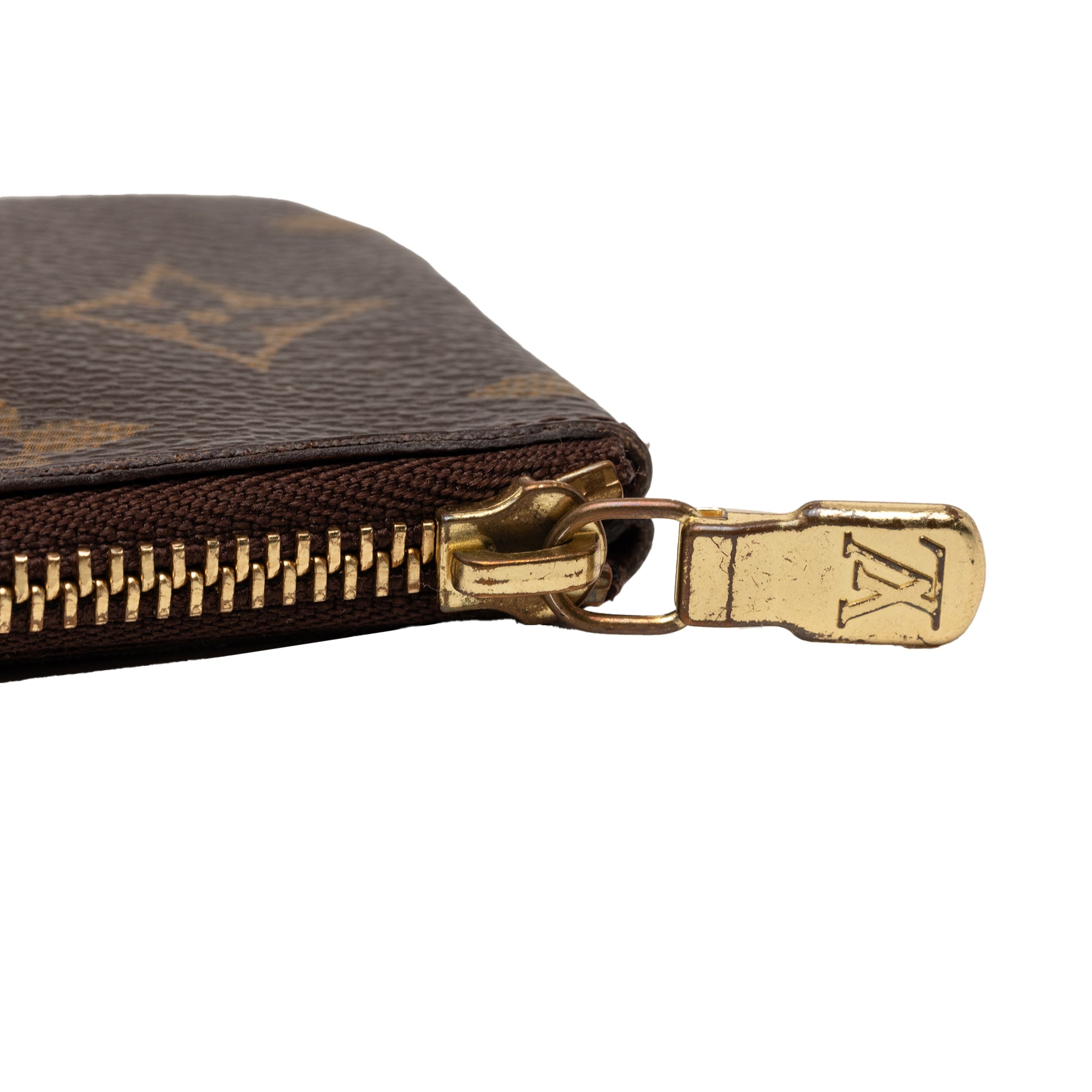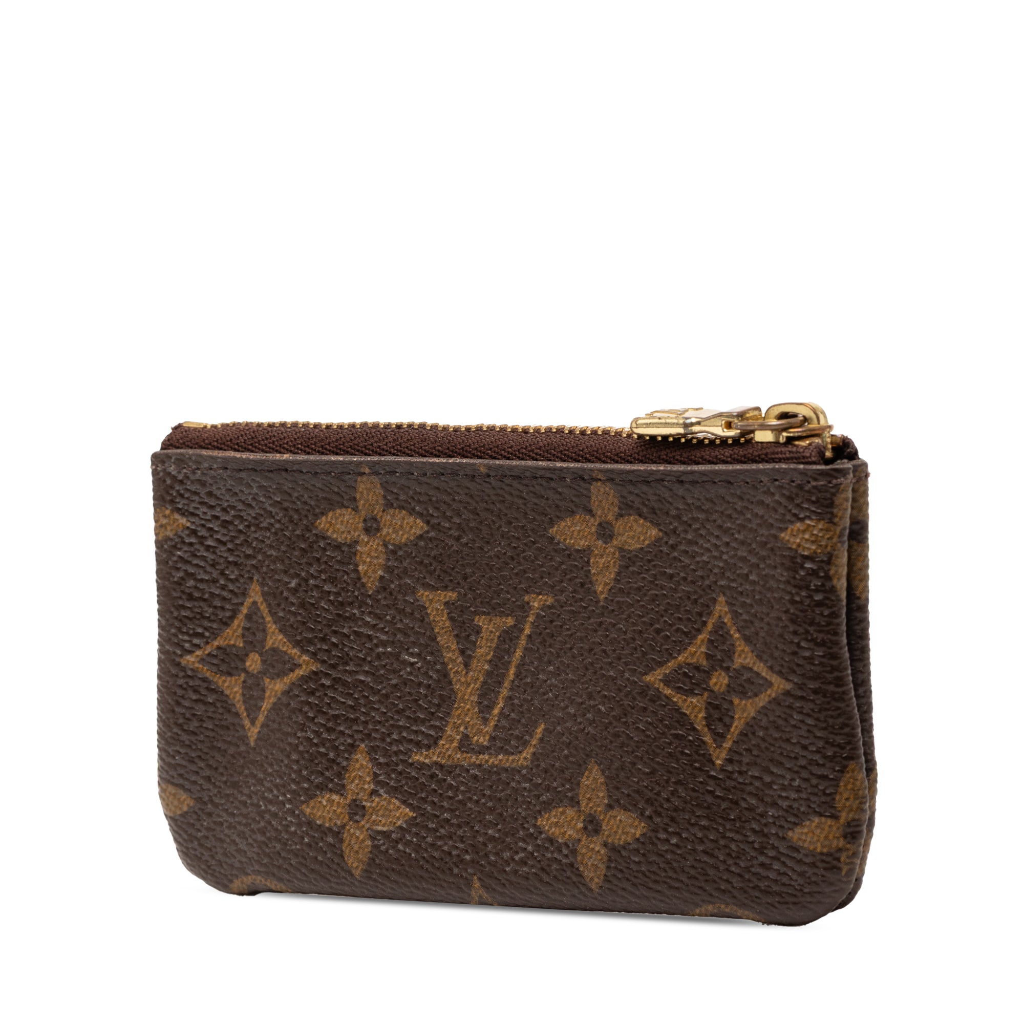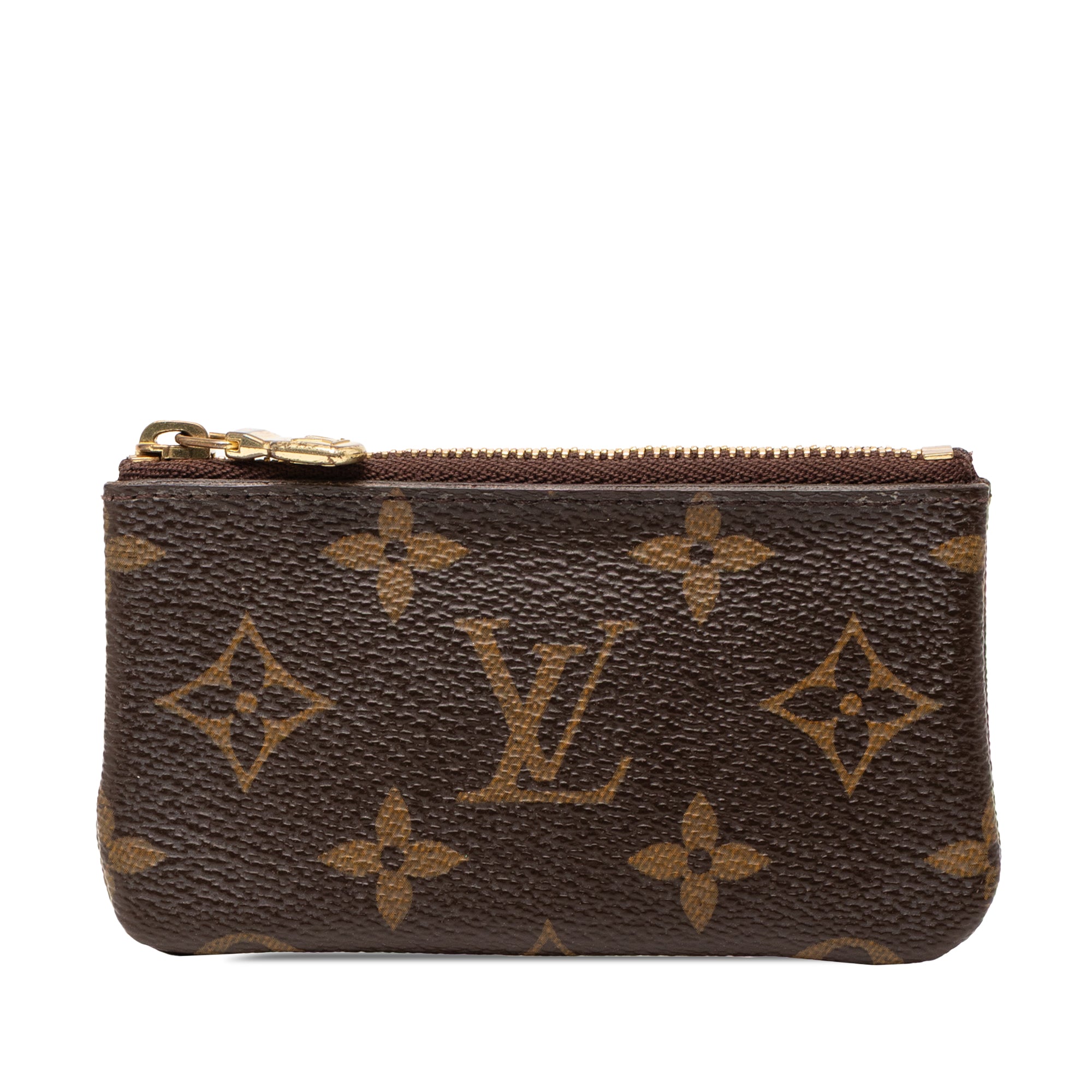 This coin pouch features a monogram canvas body, a top zip closure, and a key holder hardware. Retail Price: 545.00