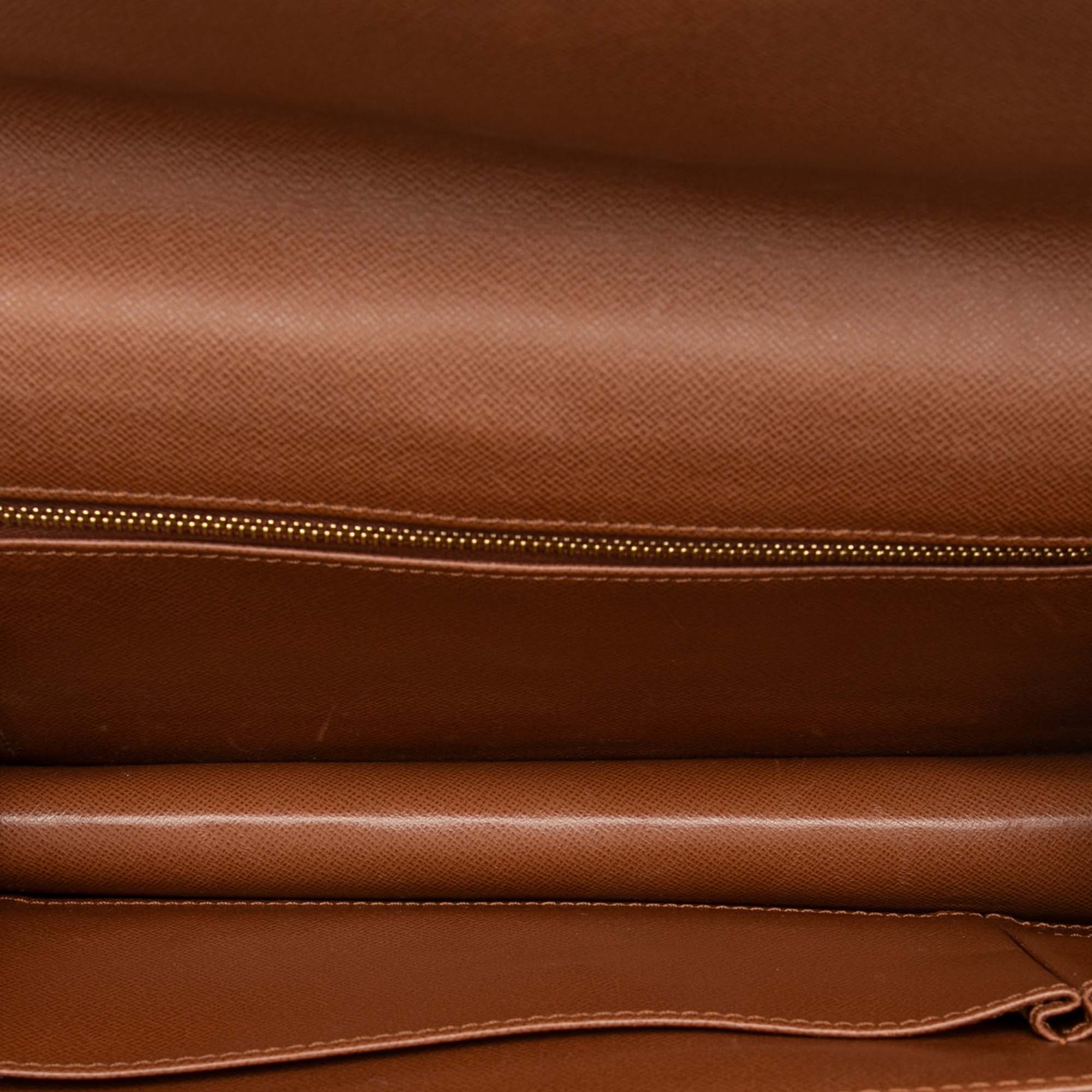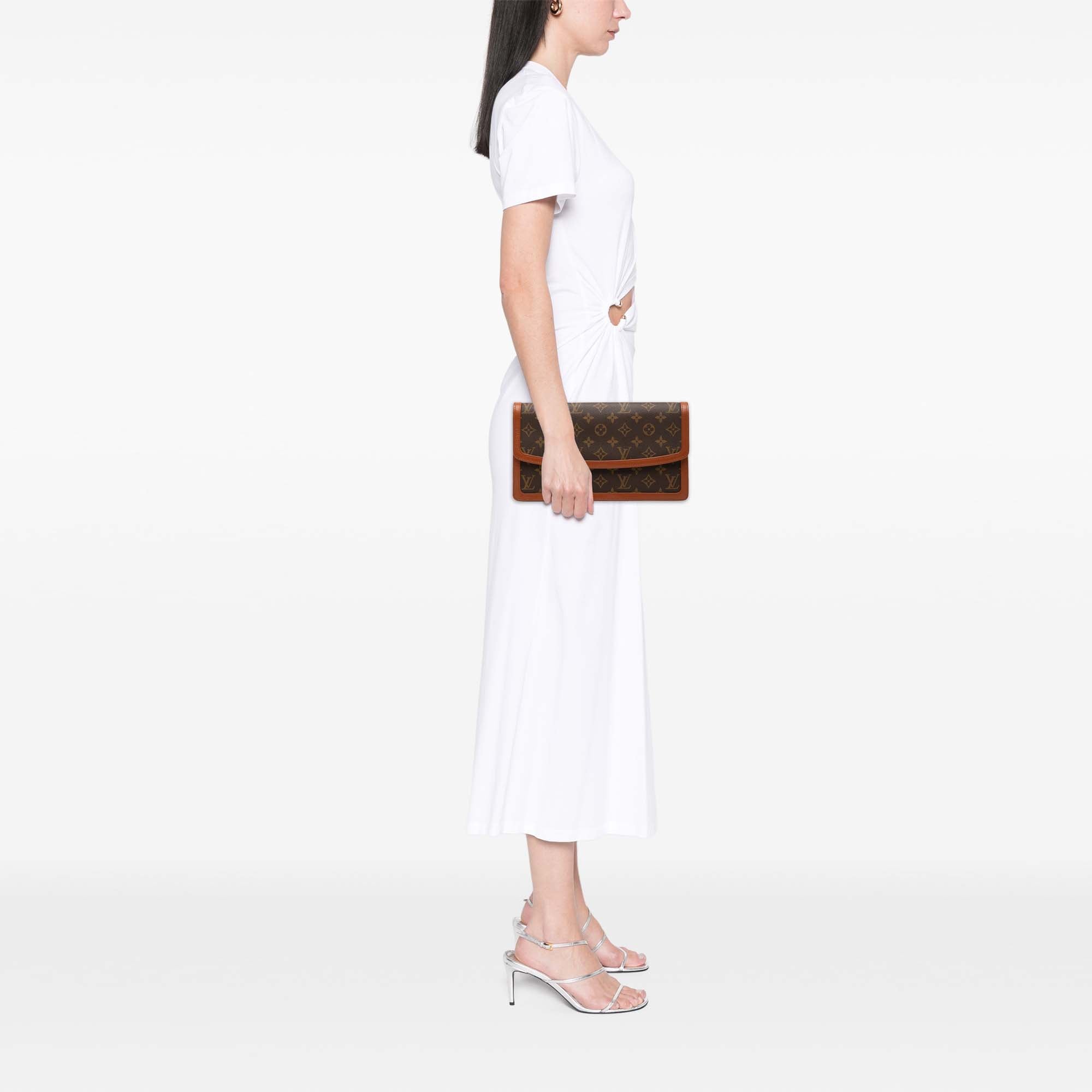 The Pochette Dame features a monogram canvas body with leather trim, a front flap with a snap closure, and an interior zip and slip pockets. Retail Price: 790.00