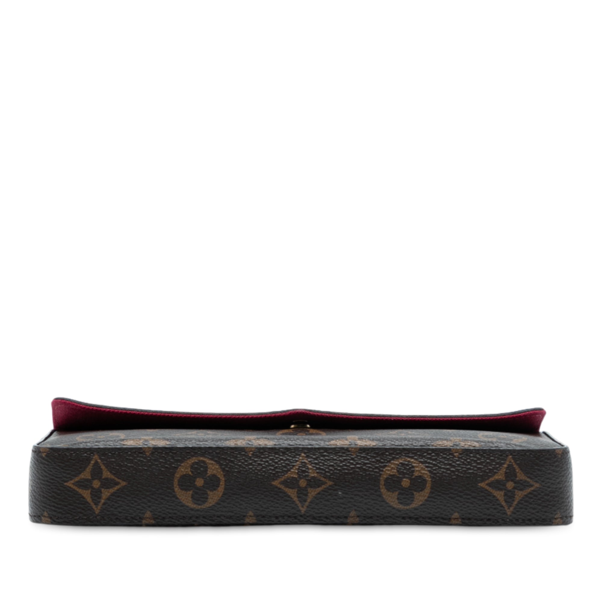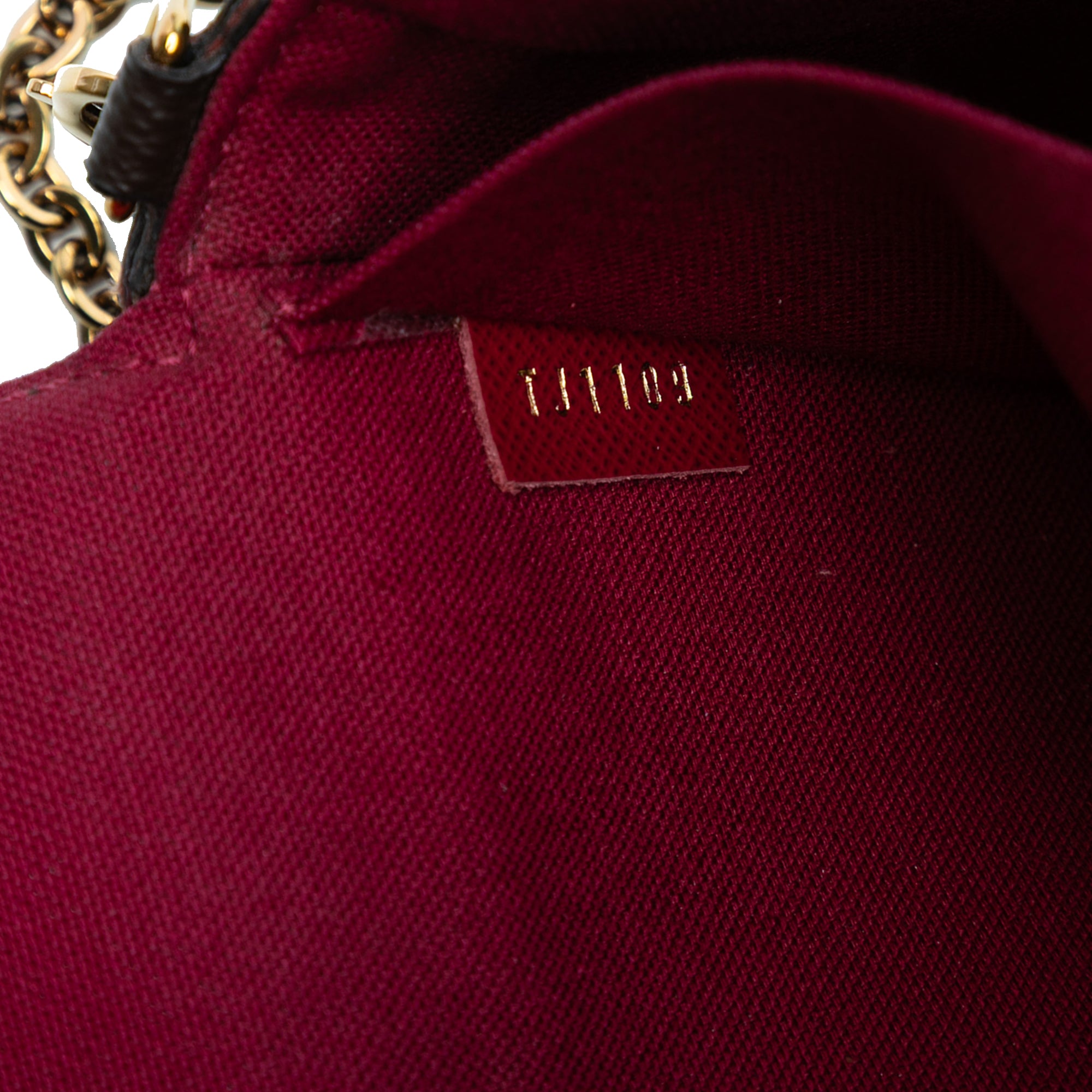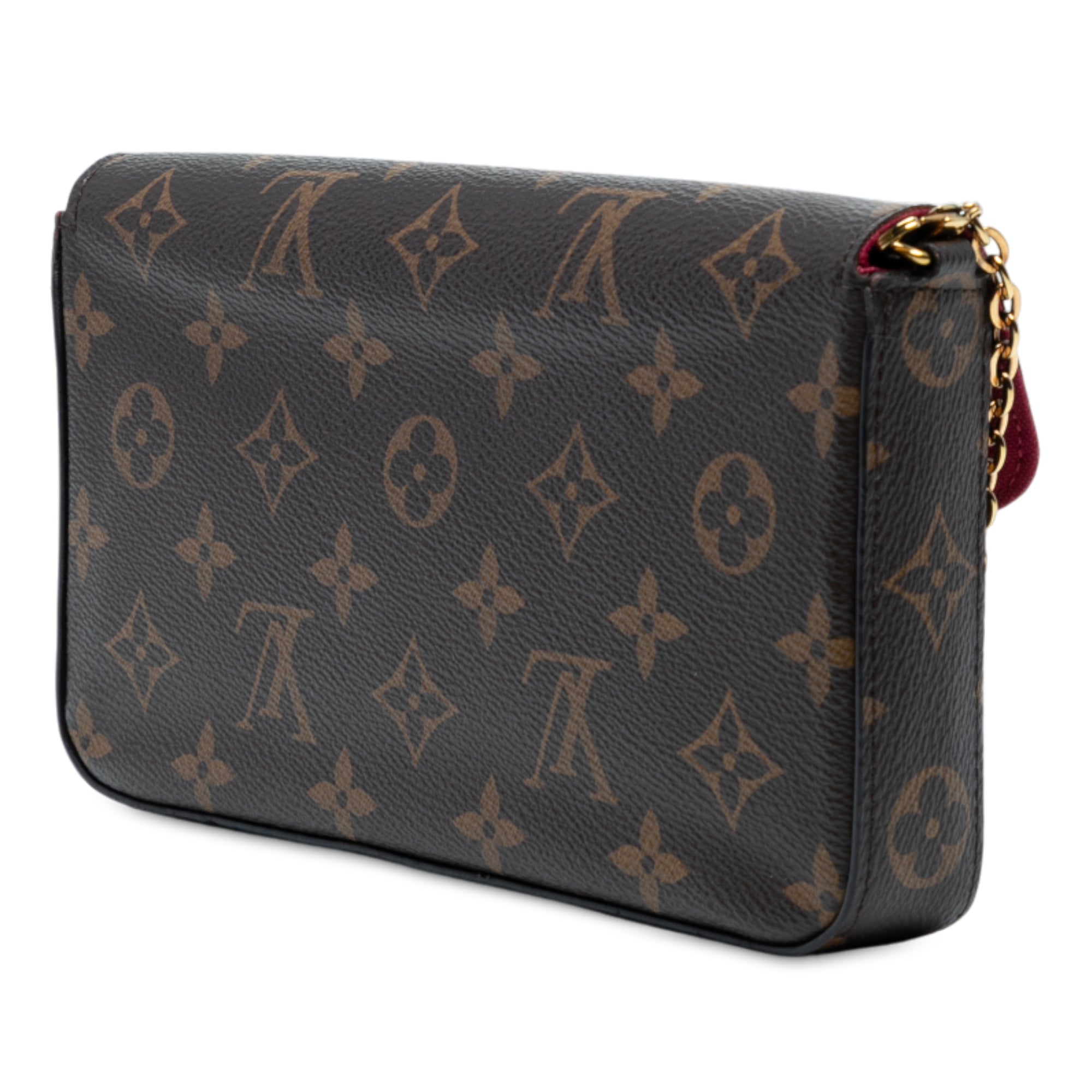 The Pochette Felicie crossbody bag features a monogram canvas body, a detachable gold-tone chain link shoulder strap, a top flap with snap closure, and an interior slip pocket, and pouch inclusion. Retail Price: 1641.00