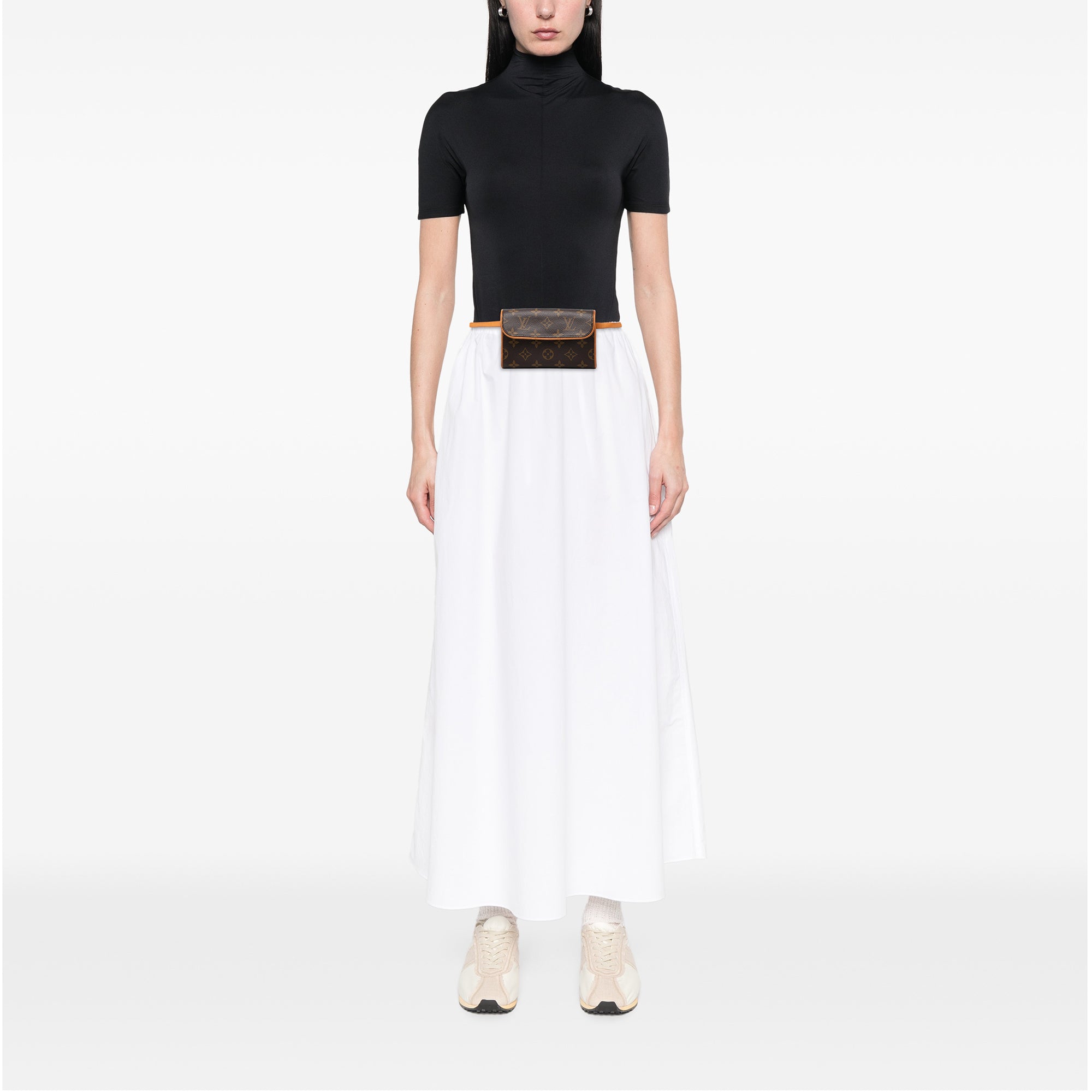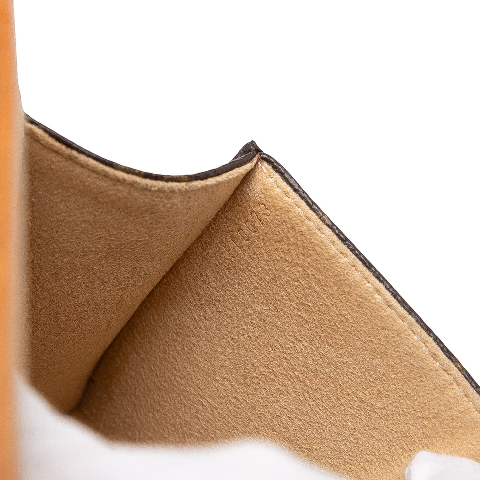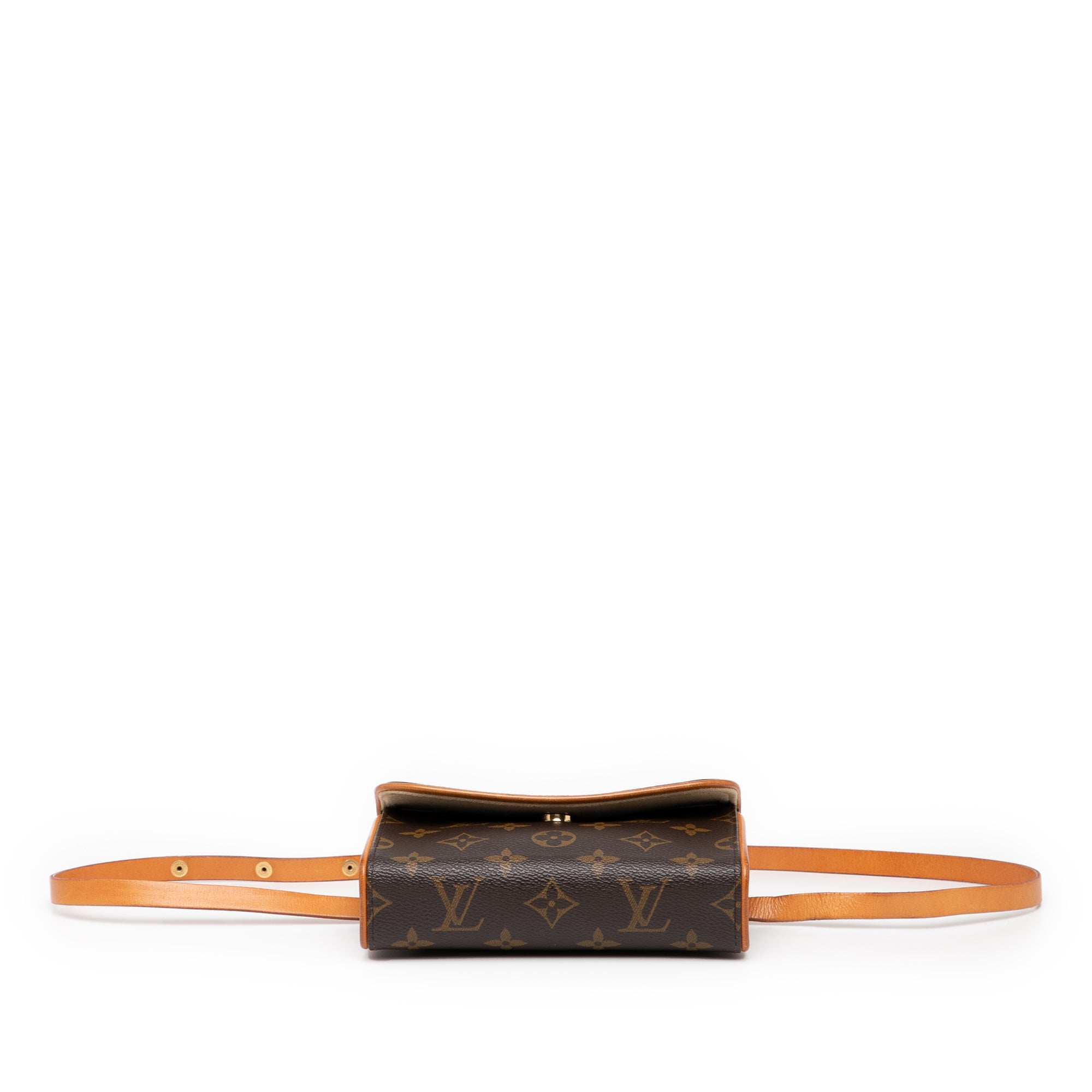 The Pochette Florentine features a monogram canvas body, a flat vachetta leather strap, and a front flap with a magnetic closure. Retail Price: 695.00
