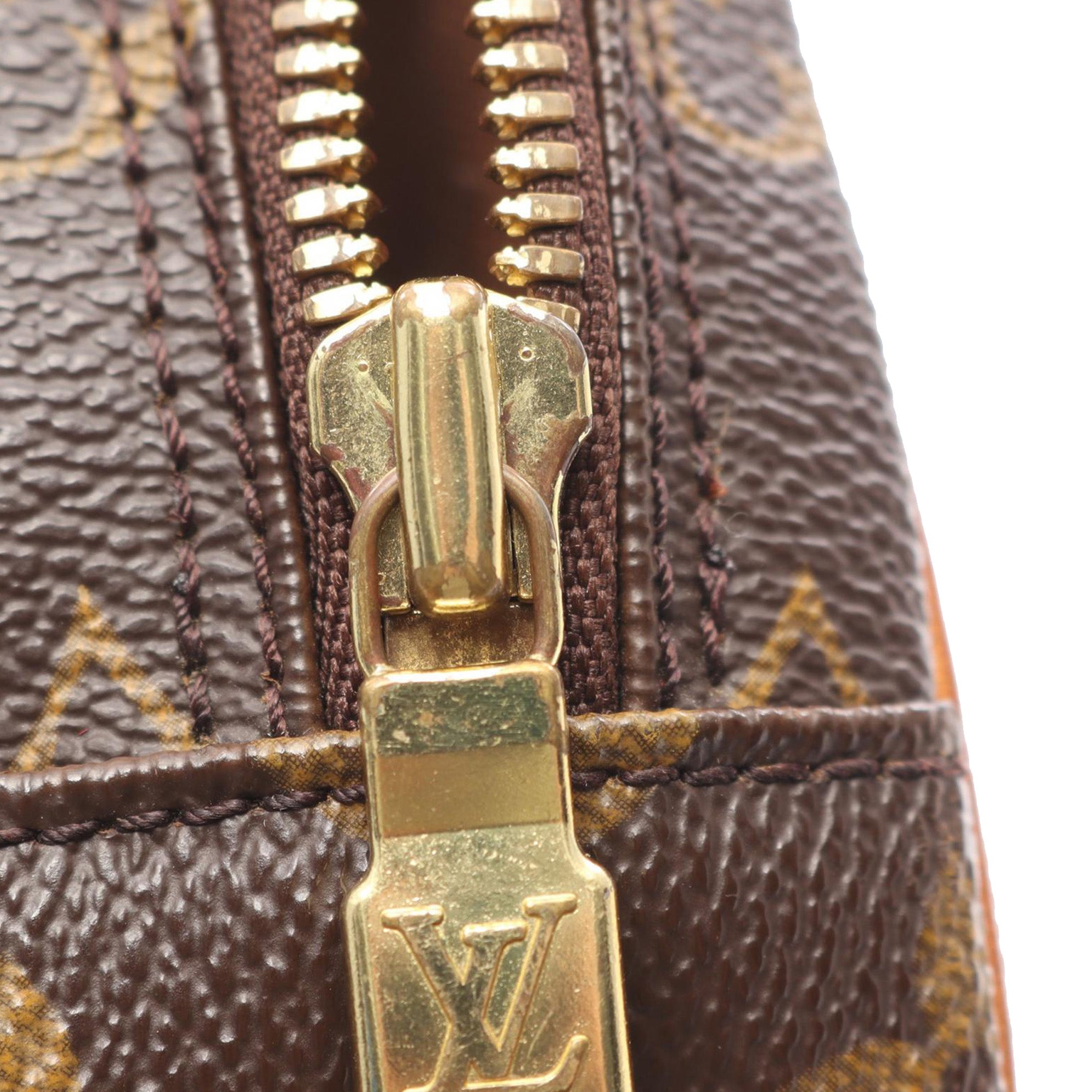 The Gange Pochette features a monogram canvas body, an adjustable strap, a top zip closure, and an exterior front slip pocket. Retail Price: 1180.00