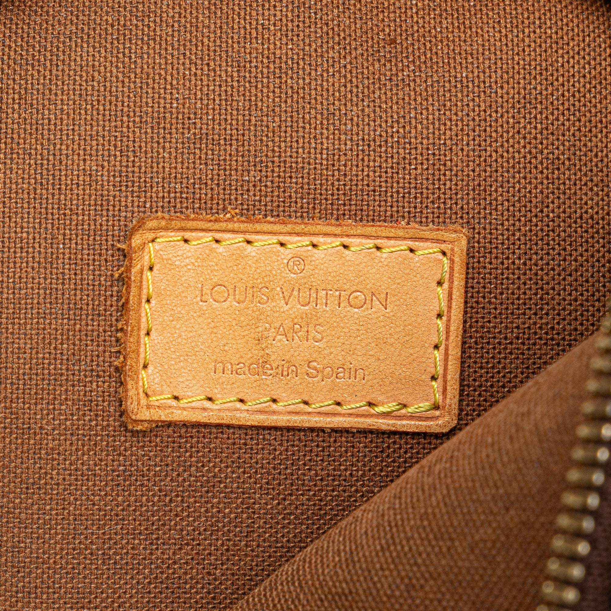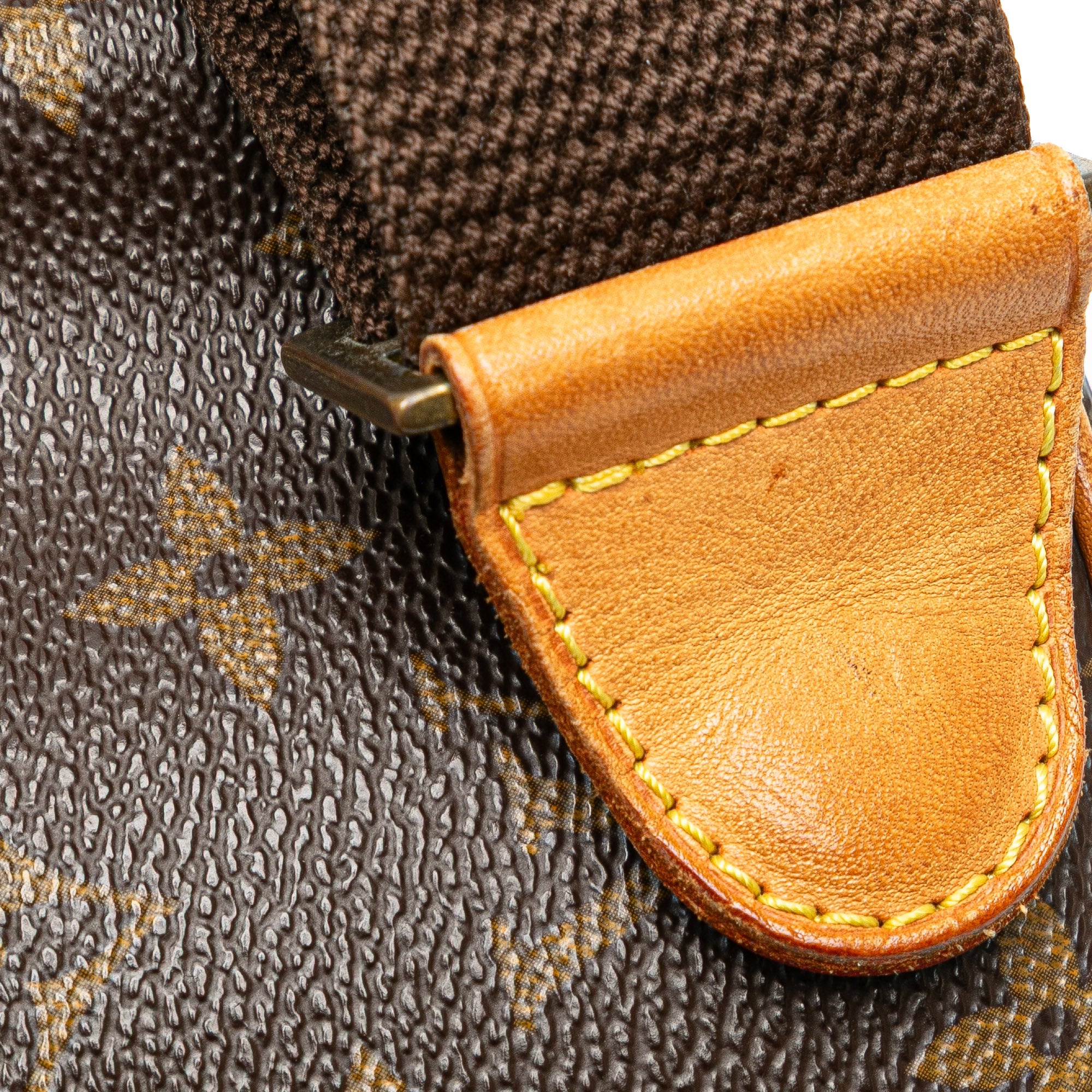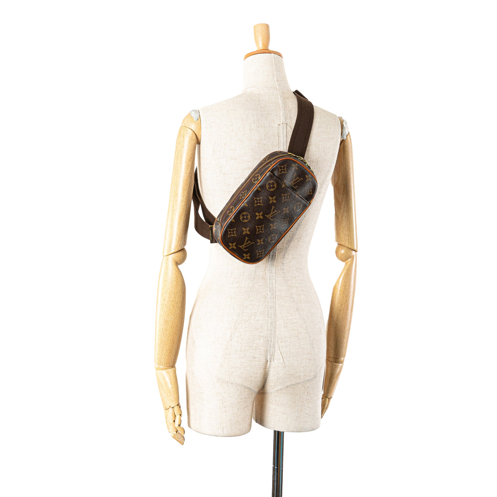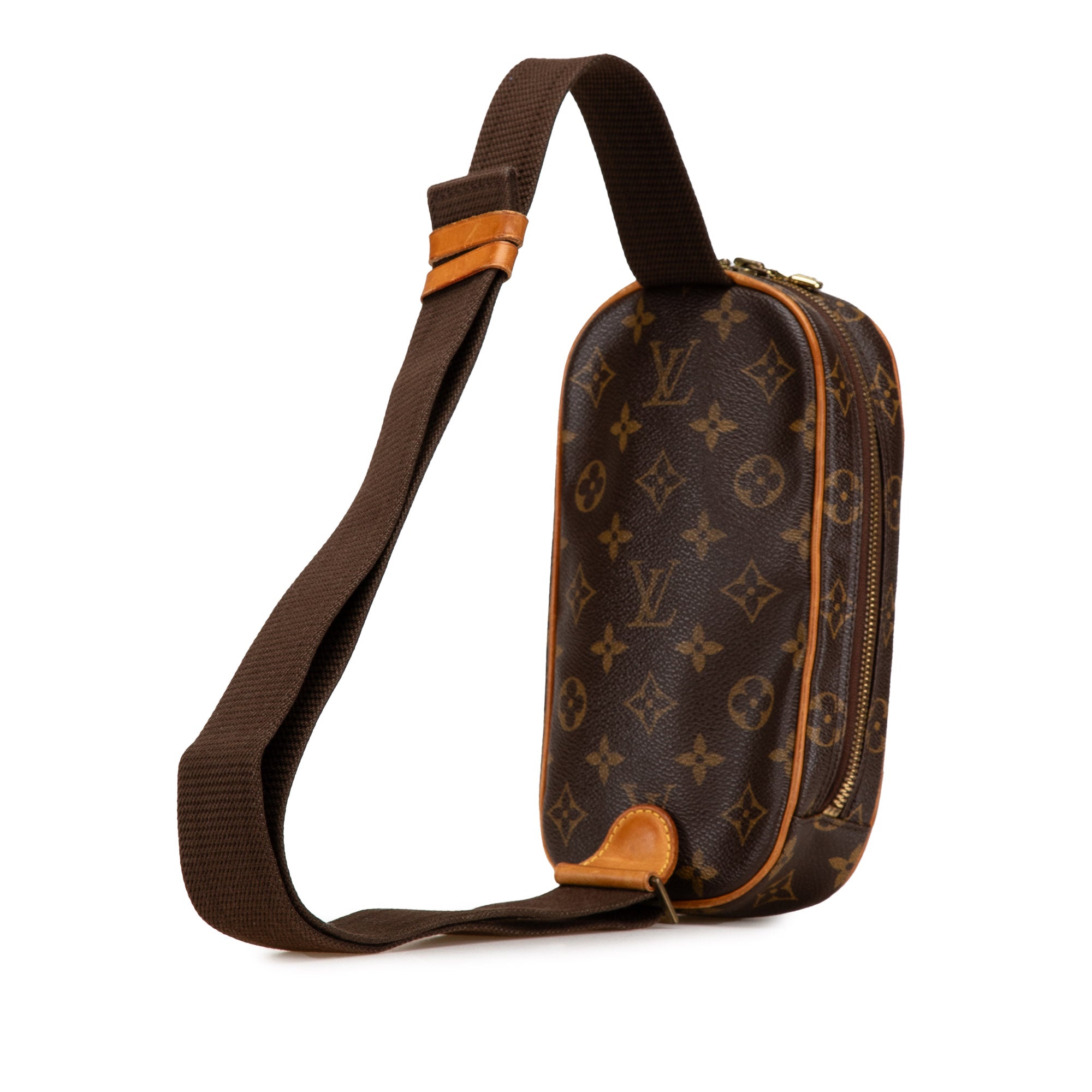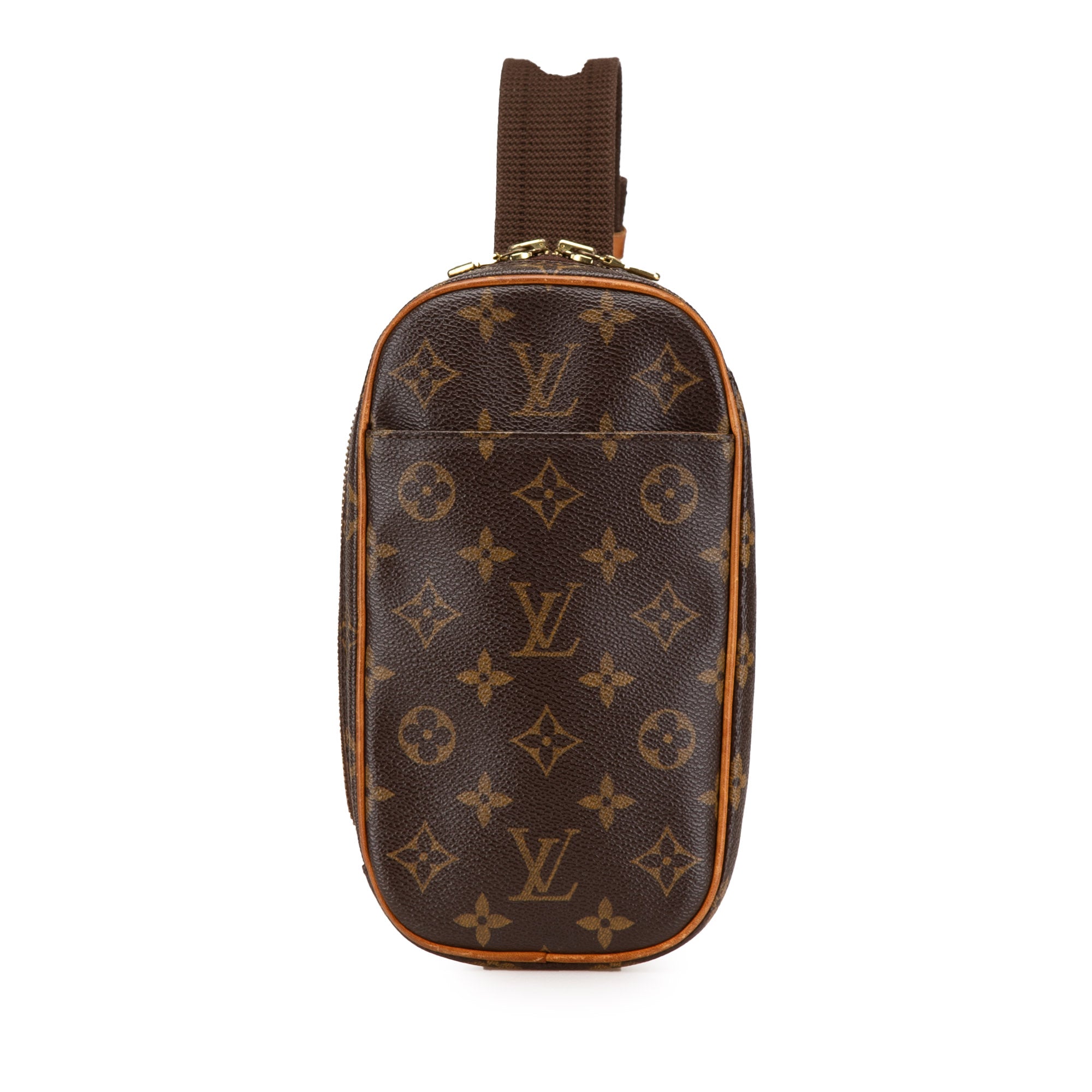 The Gange Pochette features a monogram canvas body with leather trim, an adjustable strap, an exterior front slip pocket, and a top zip closure. Retail Price: 1270.00