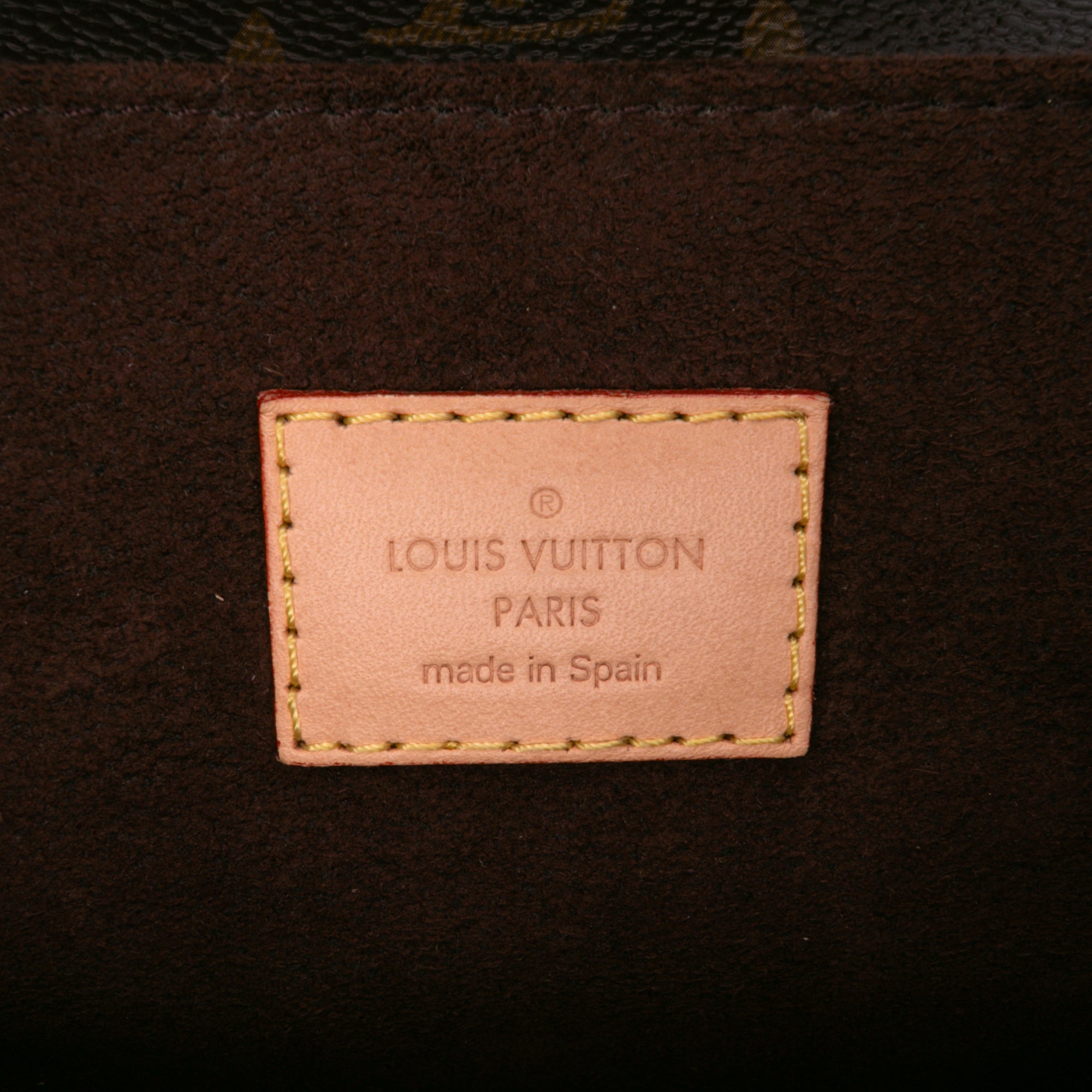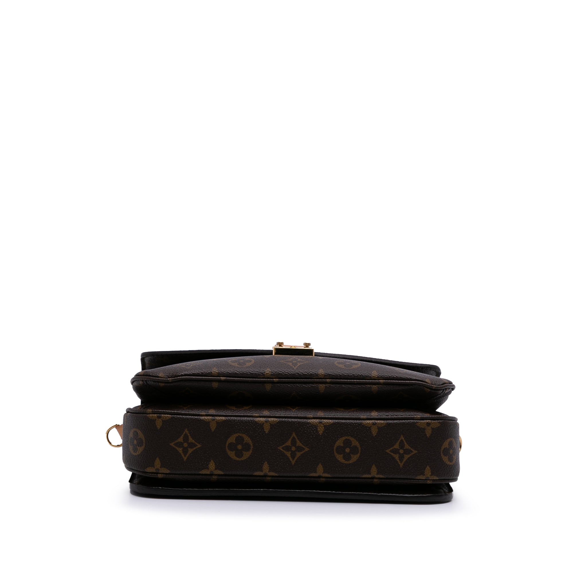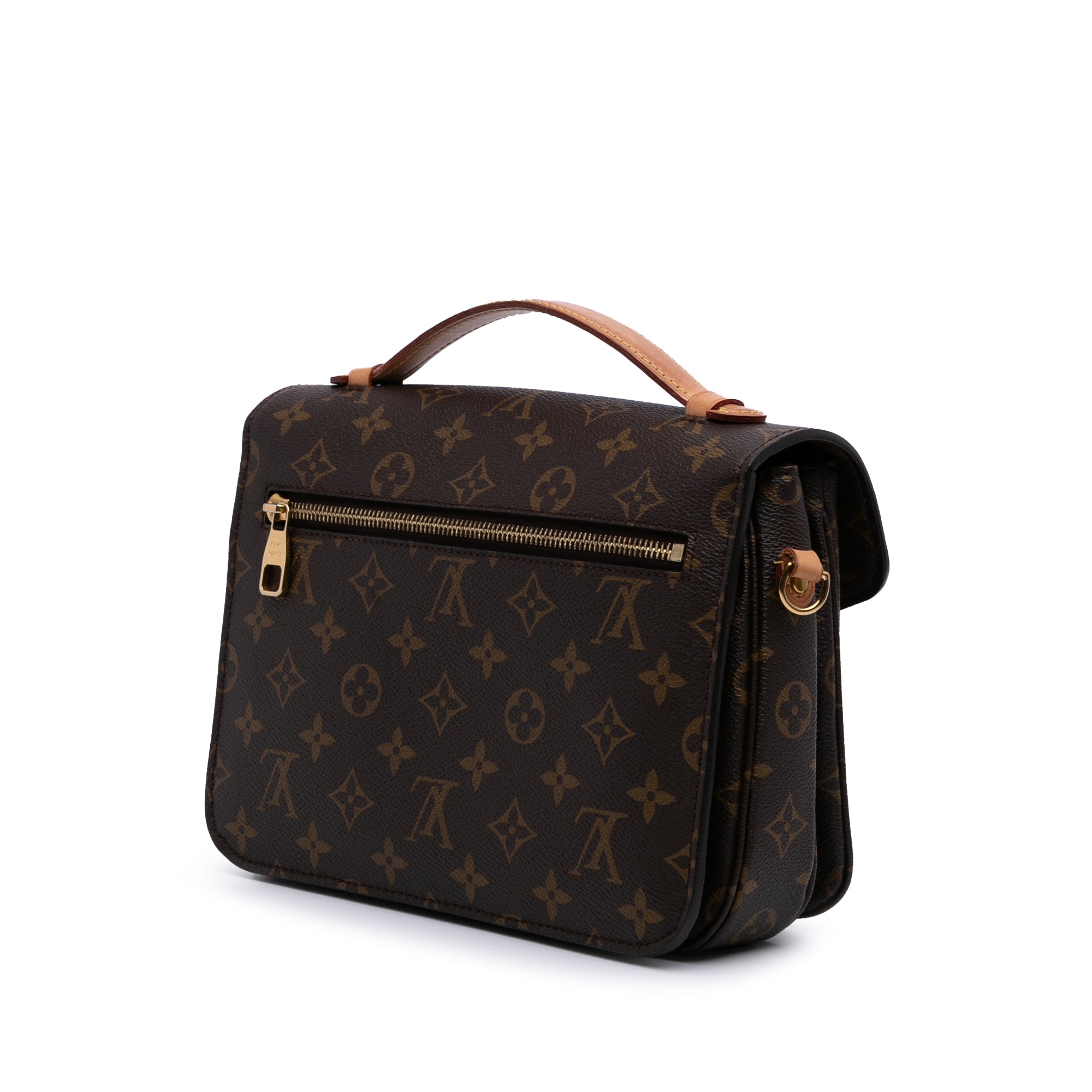 The Pochette Metis features a monogram canvas body, a flat vachetta leather top handle, a detachable flat shoulder strap, a front flap with an S-lock closure, an exterior zip pocket, and interior slip pockets. Retail Price: 2200.00