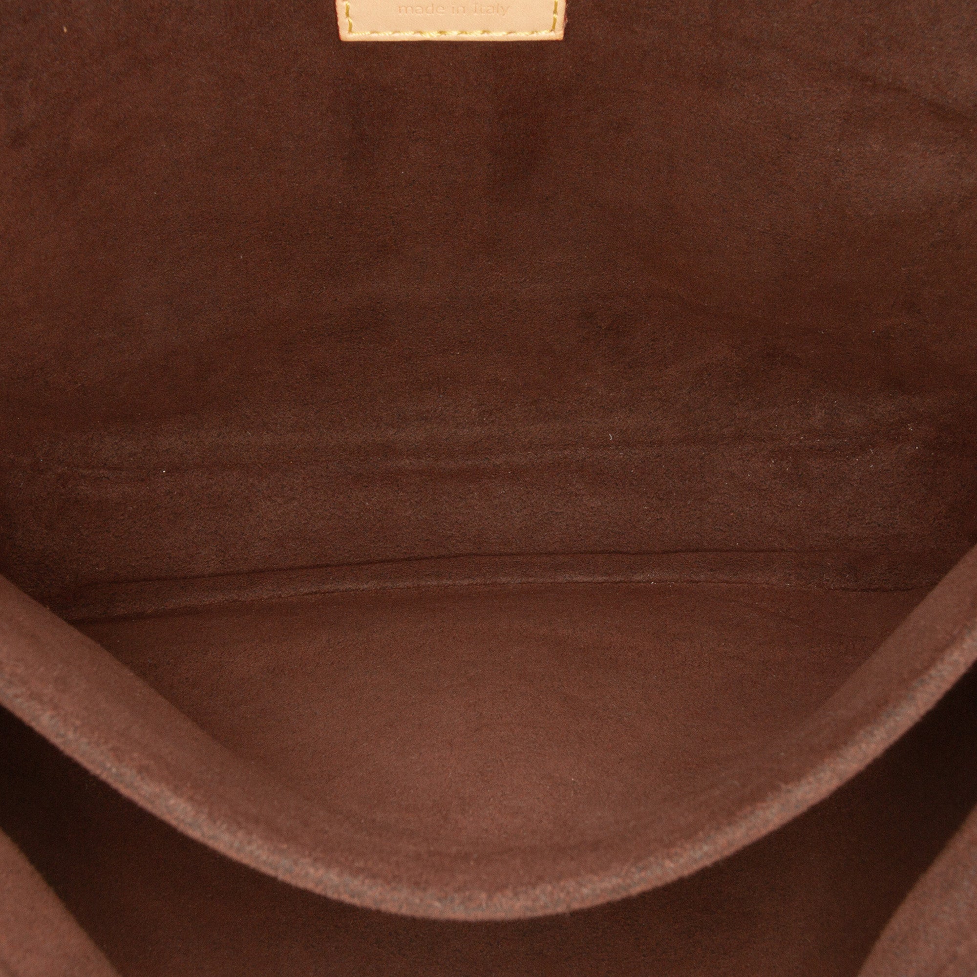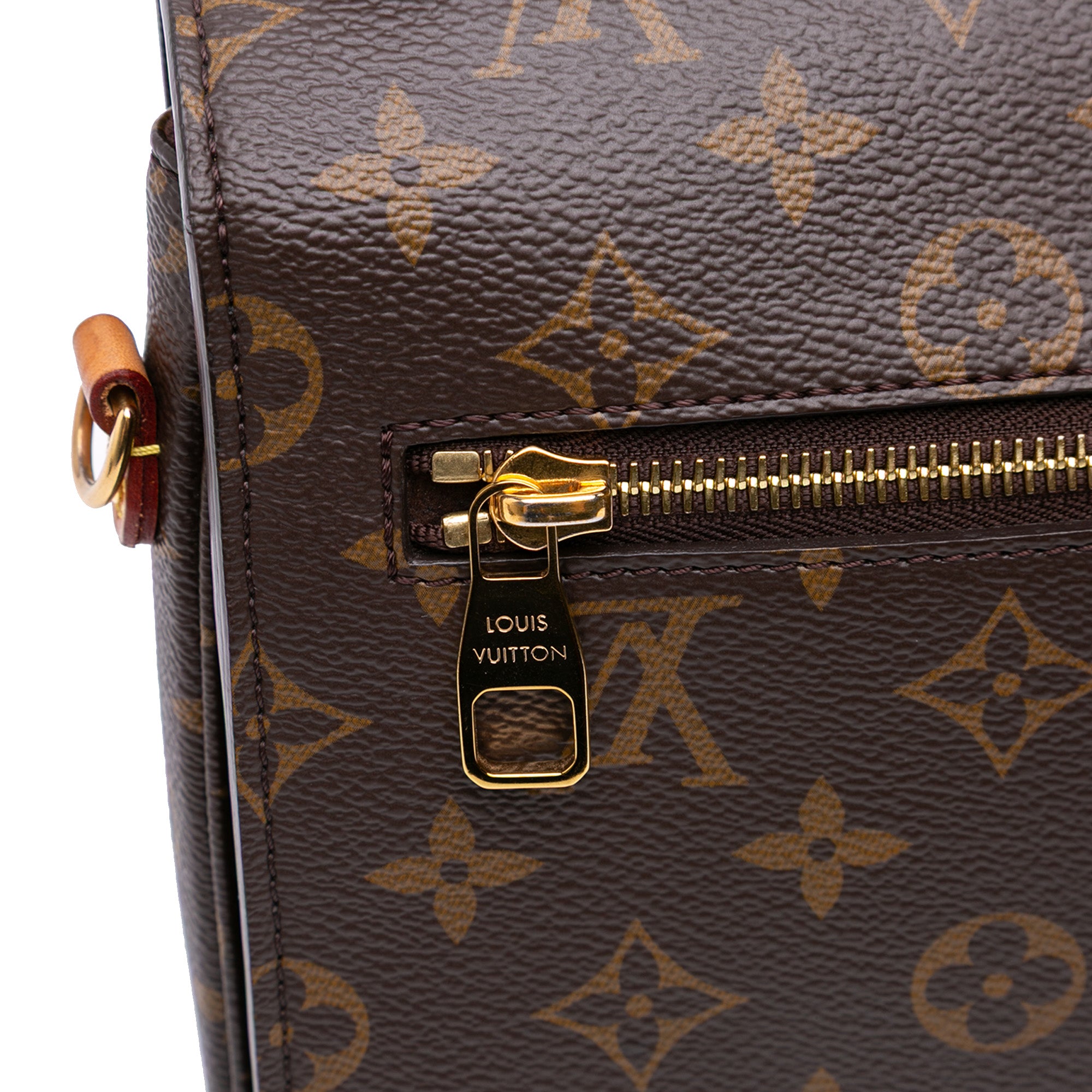 The Pochette Metis features a monogram canvas body, a flat vachetta leather top handle, a detachable flat shoulder strap, a front flap with an S-lock closure, an exterior zip pocket, and interior slip pockets. Retail Price: 2200.00