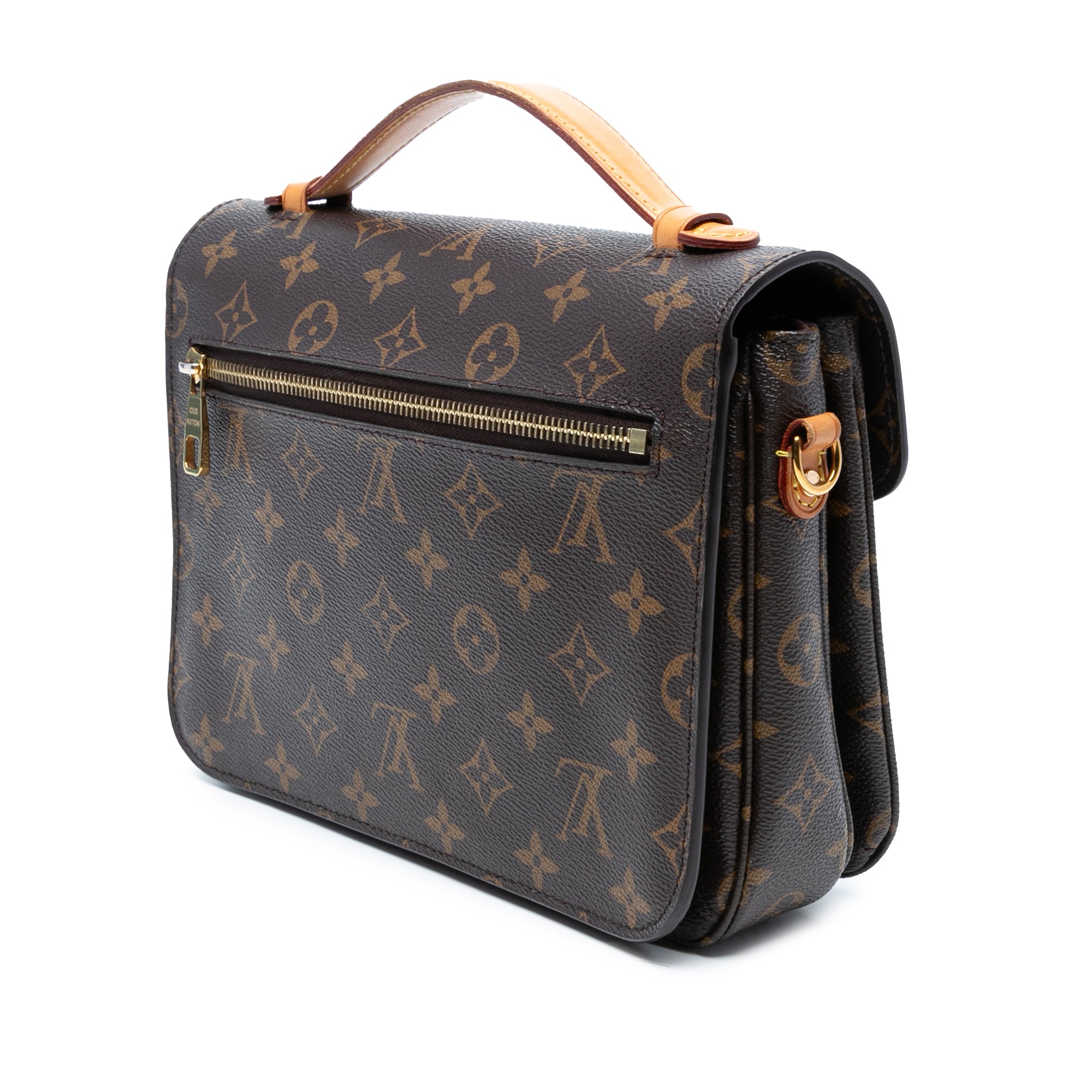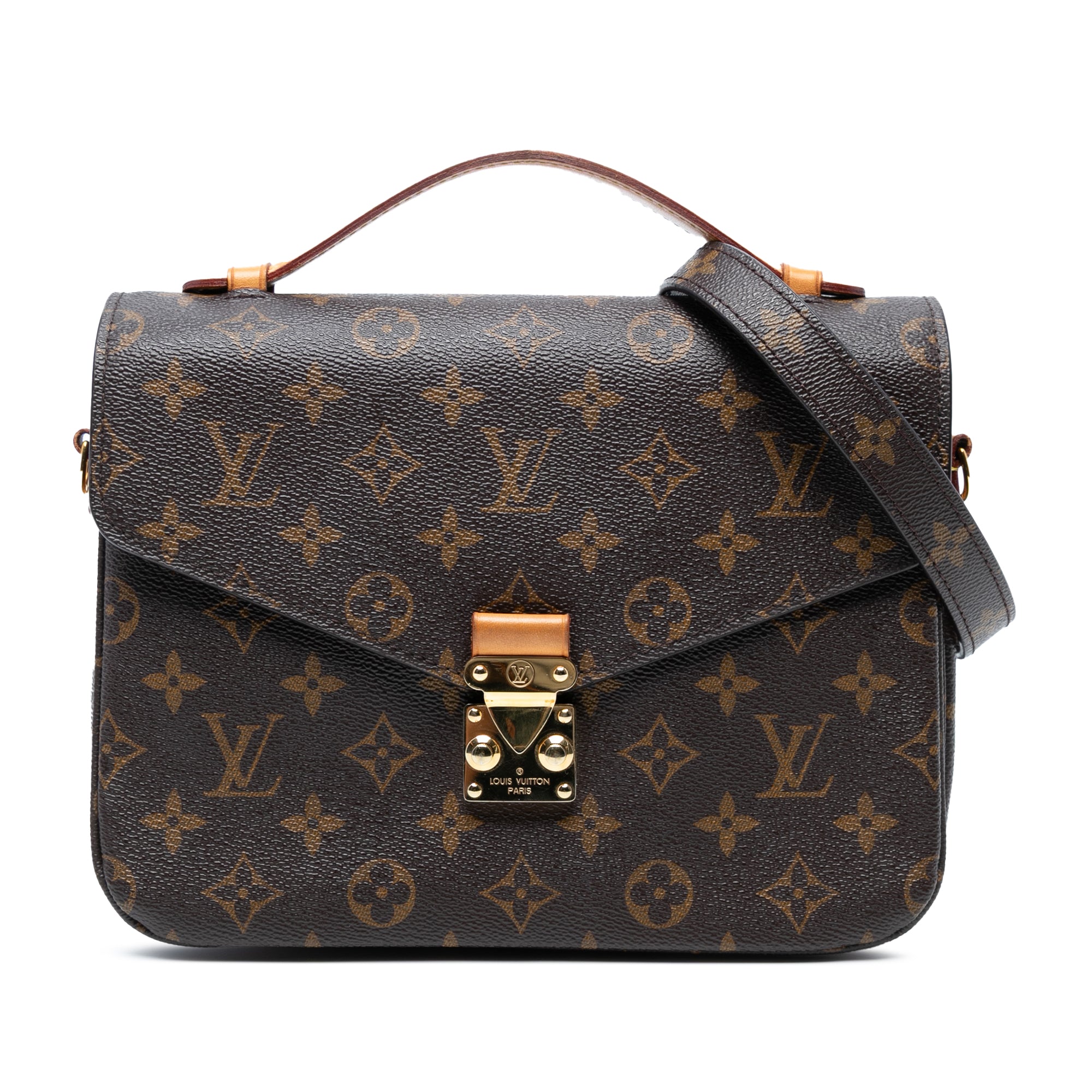 The Pochette Metis features a monogram canvas body, a flat vachetta leather top handle, a detachable flat shoulder strap, a front flap with an S-lock closure, an exterior zip pocket, and an interior slip pocket. Retail Price: 2395.00