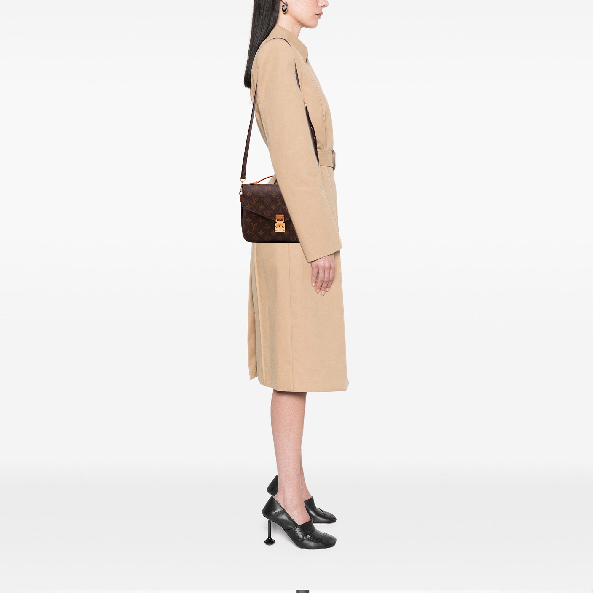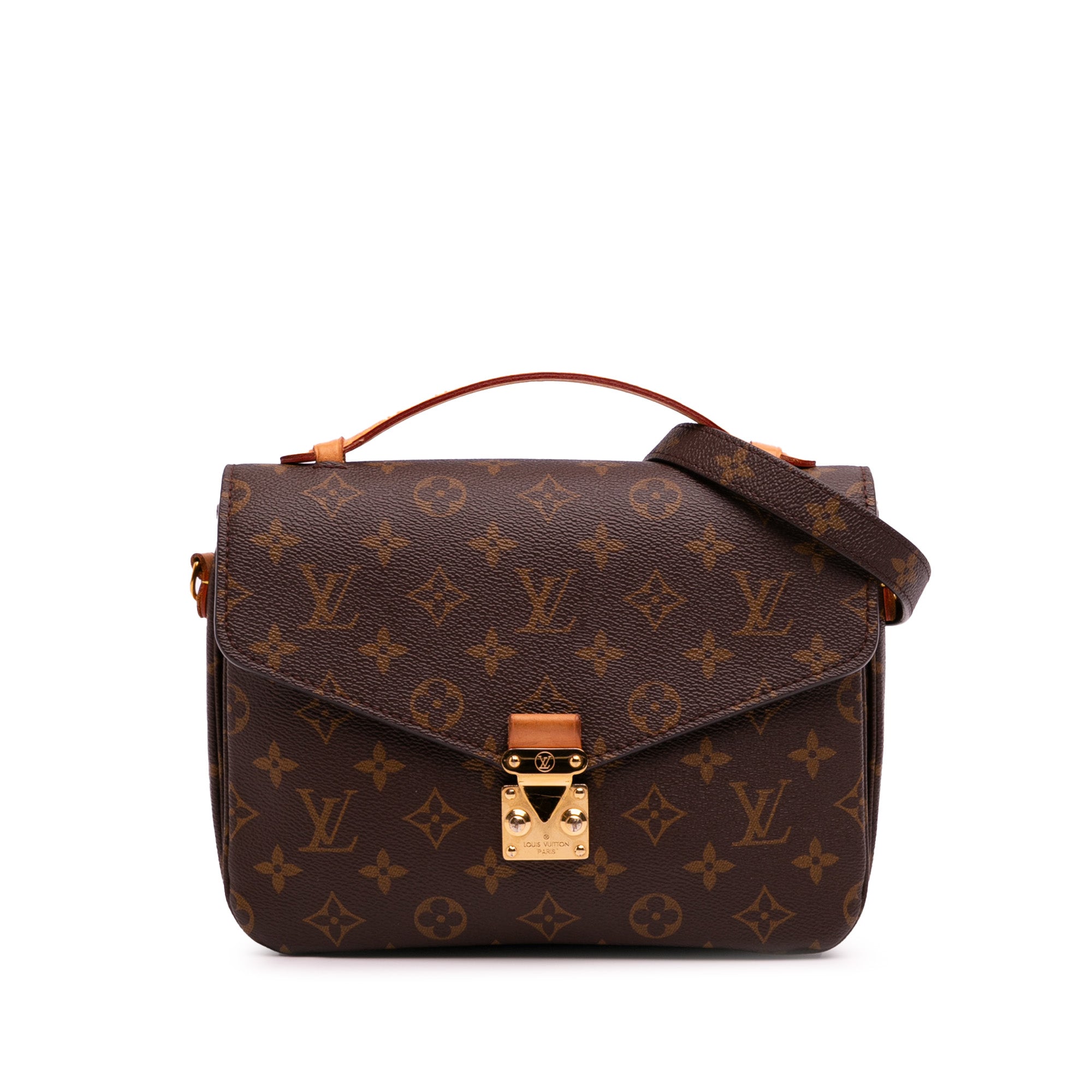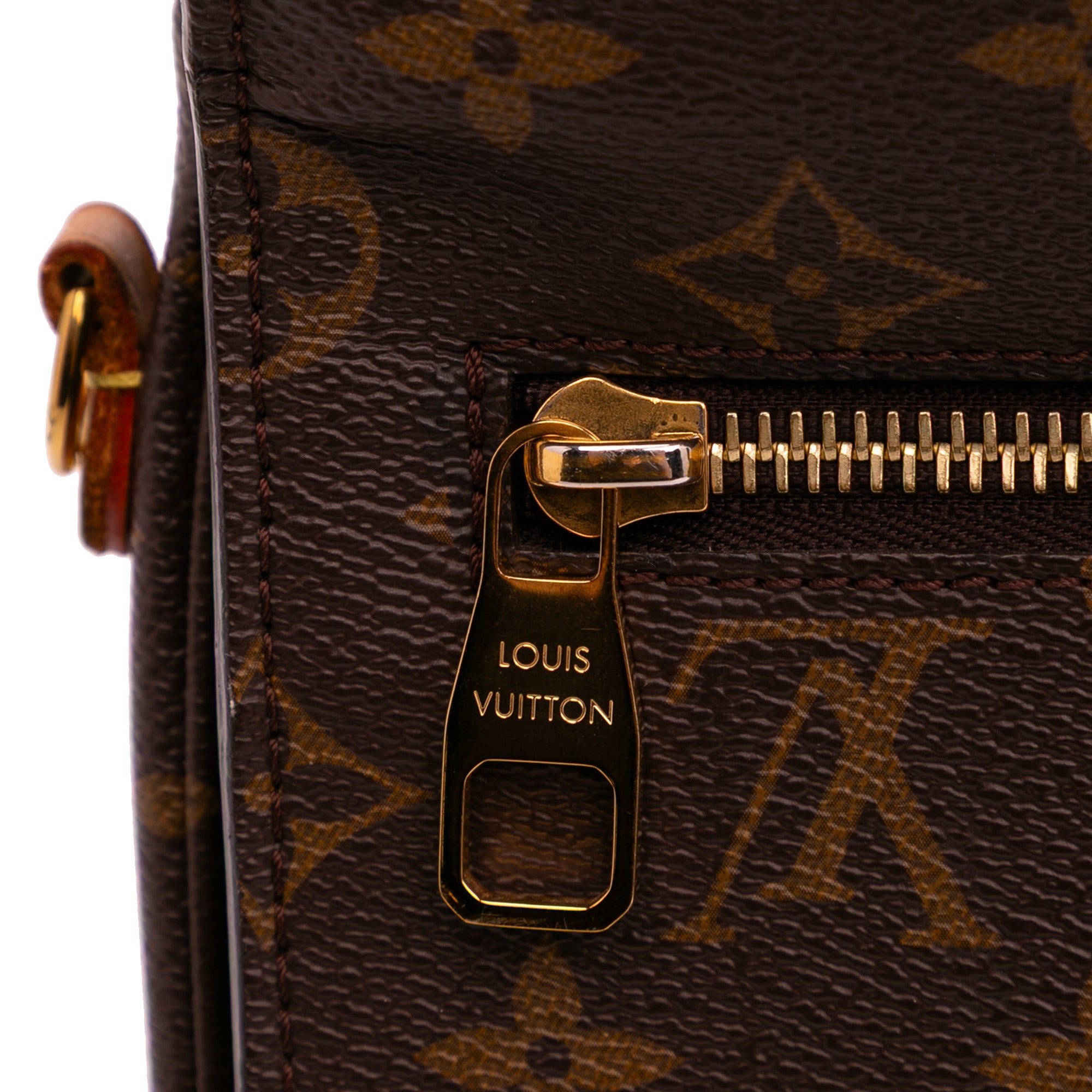 The Pochette Metis features a monogram canvas body, a flat vachetta leather top handle, a detachable flat shoulder strap, a front flap with an S-lock closure, an exterior zip pocket, and interior slip pockets. Retail Price: 2615.00