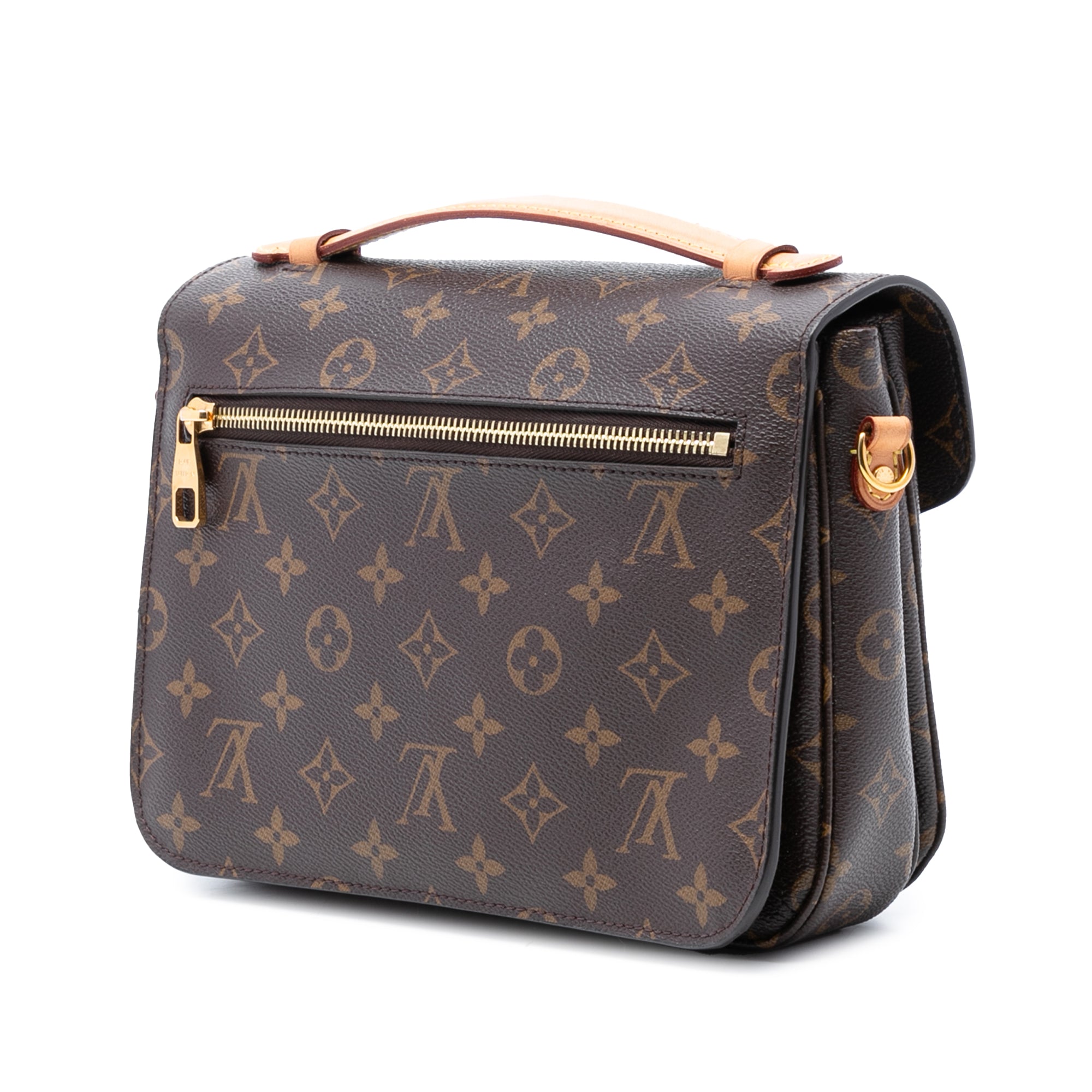 The Pochette Metis features a monogram canvas body, a flat vachetta leather top handle, a detachable flat shoulder strap, a front flap with an S-lock closure, an exterior zip pocket, and interior slip pockets. Retail Price: 2570.00
