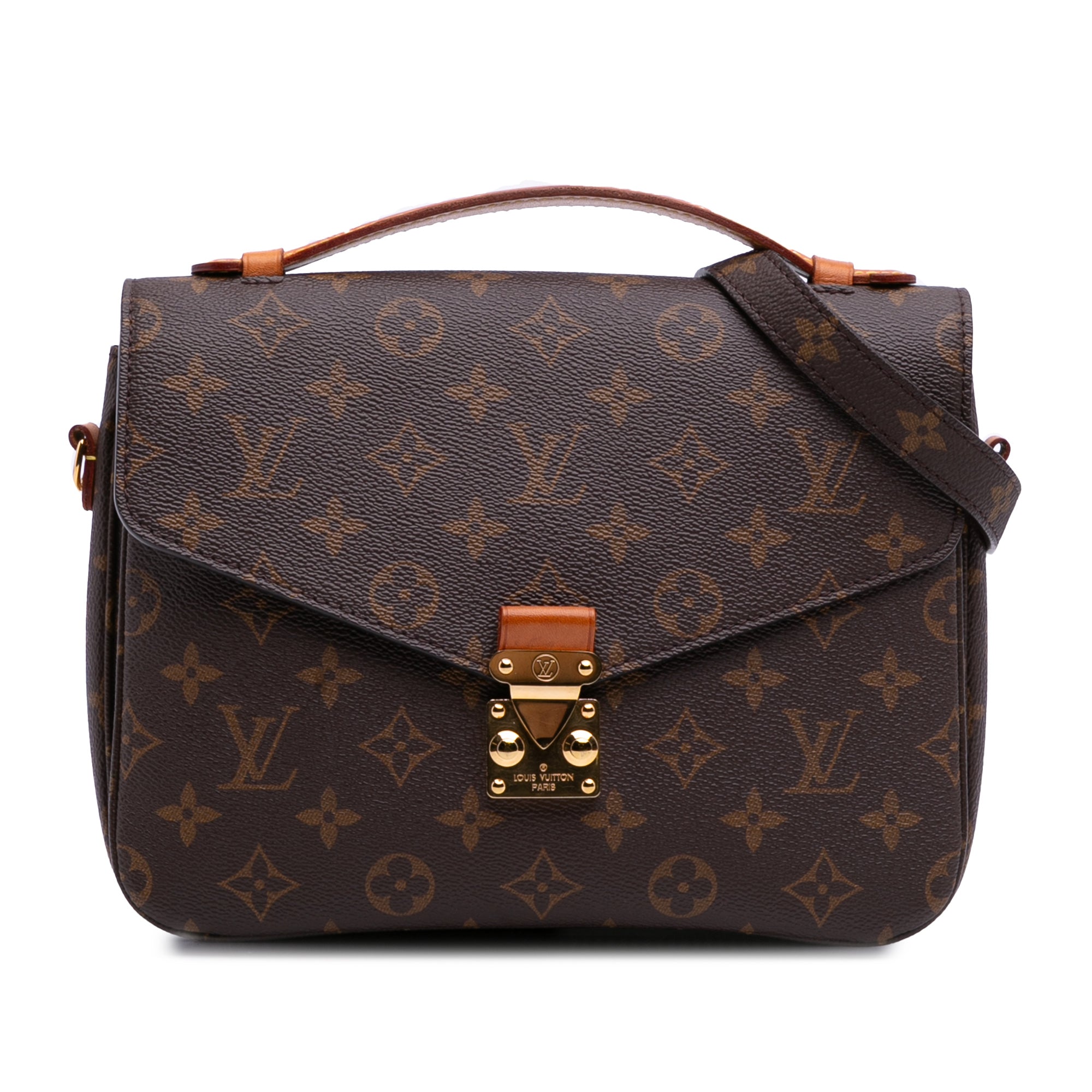 The Pochette Metis features a monogram canvas body, a flat vachetta leather top handle, a detachable flat shoulder strap, a front flap with an S-lock closure, an exterior zip pocket, and interior slip pockets. Inclusion: Dust bag. Retail Price: 2650.00