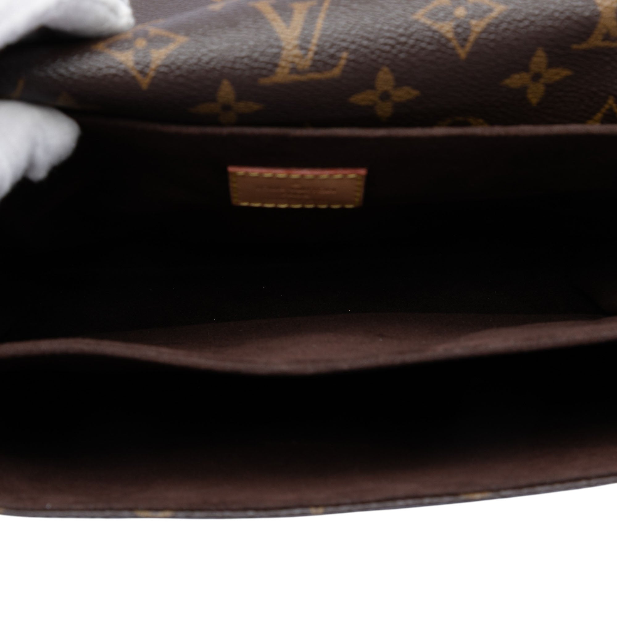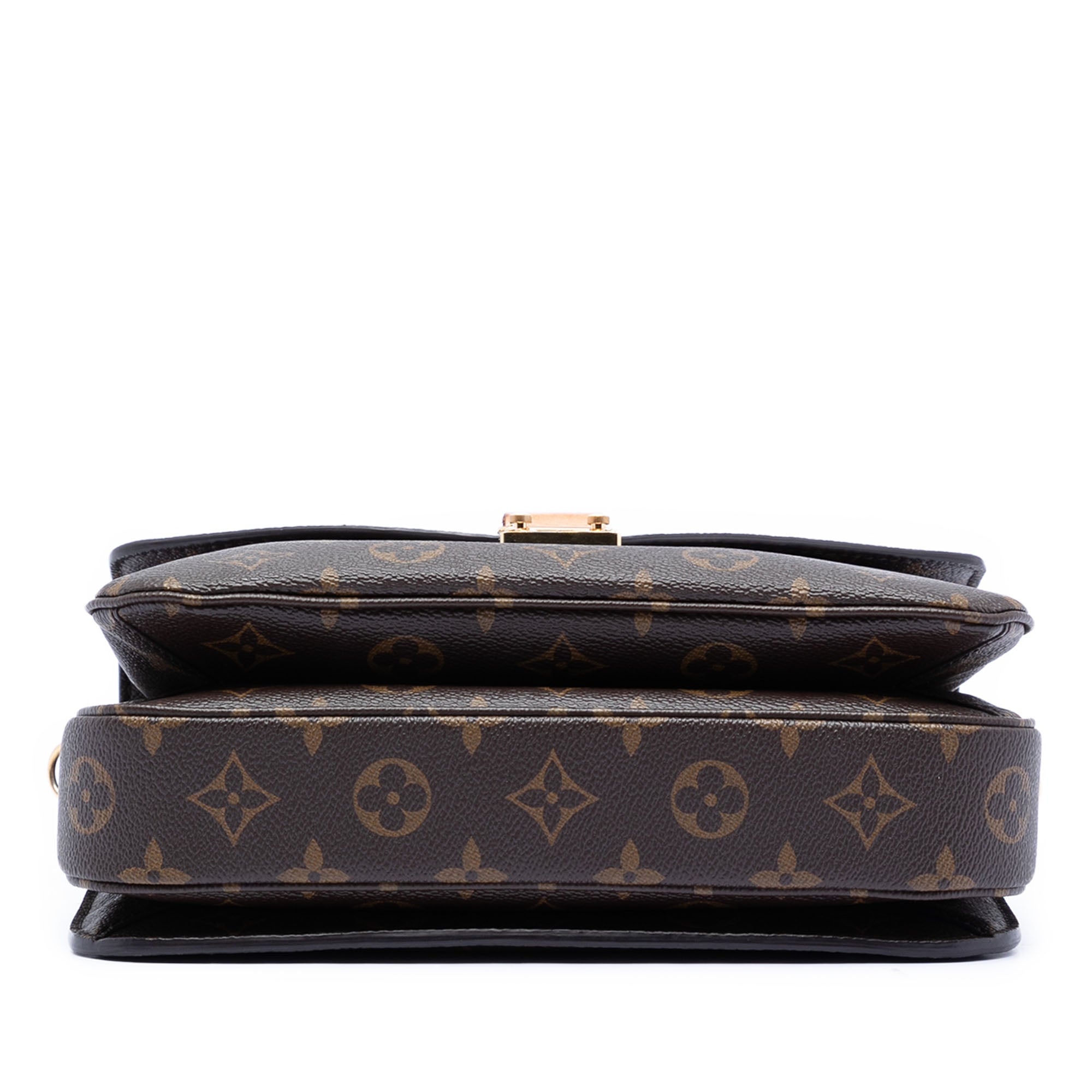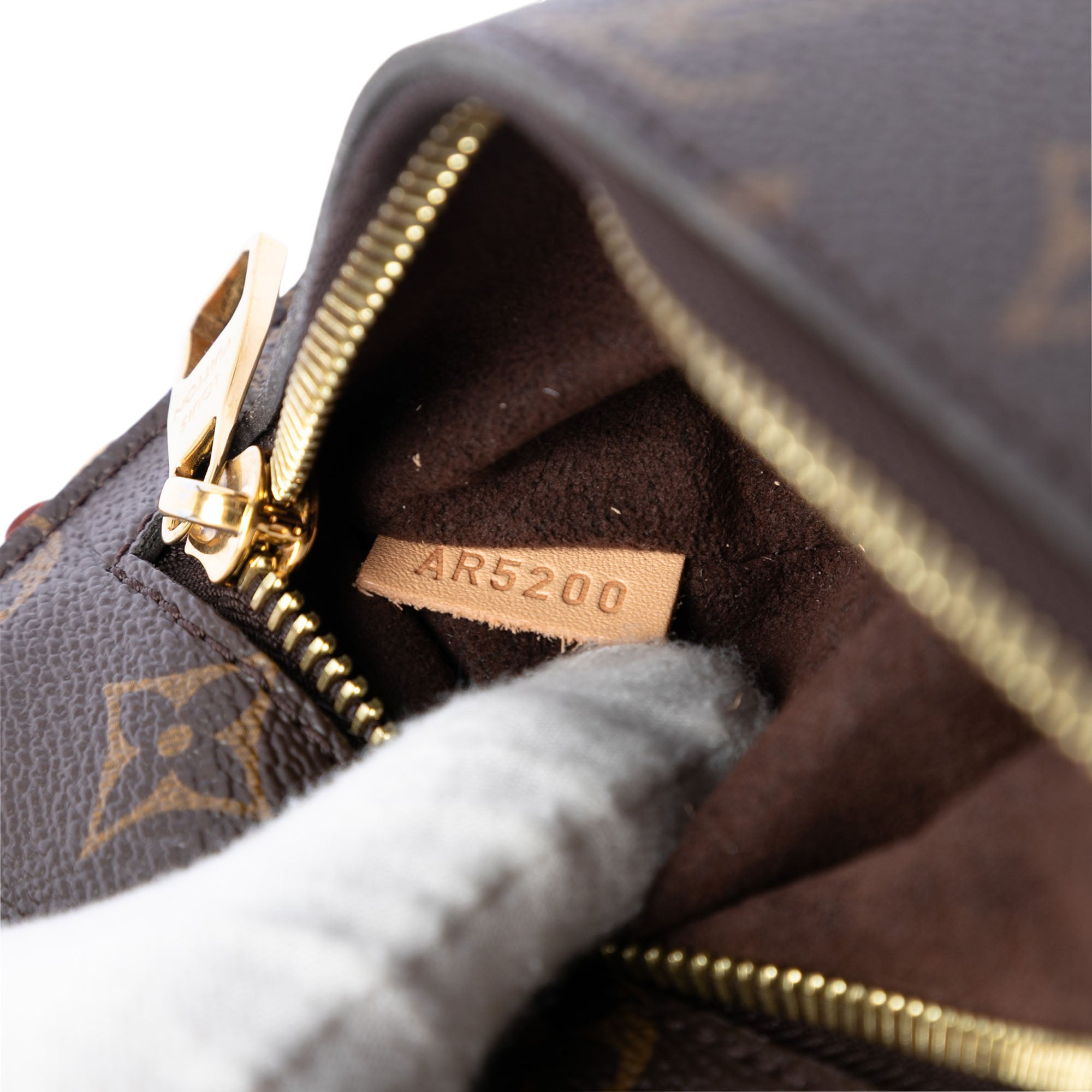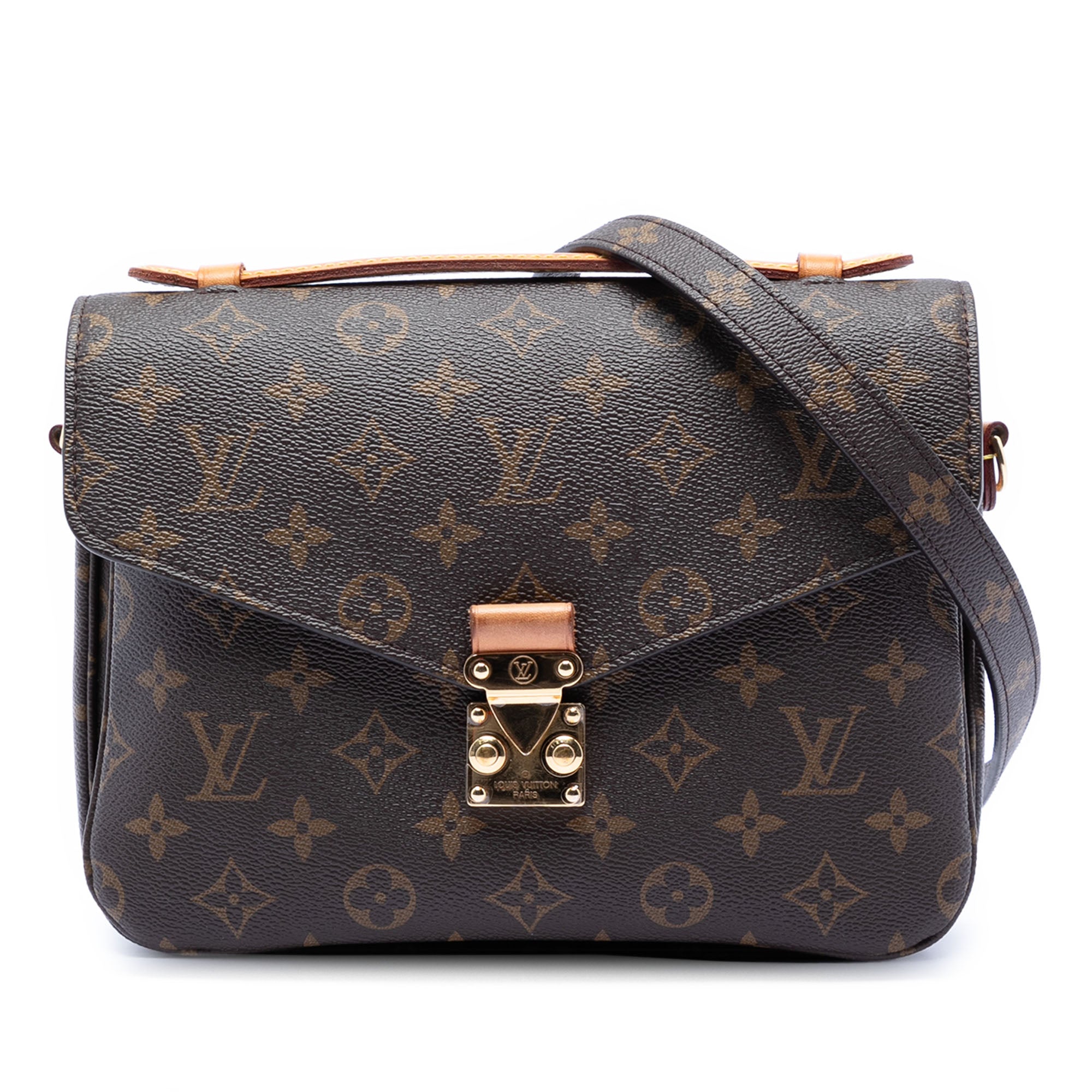The Pochette Metis features a monogram canvas body, a flat vachetta leather top handle, a detachable flat shoulder strap, a front flap with an S-lock closure, an exterior zip pocket, and interior slip pockets. Retail Price: 2200.00