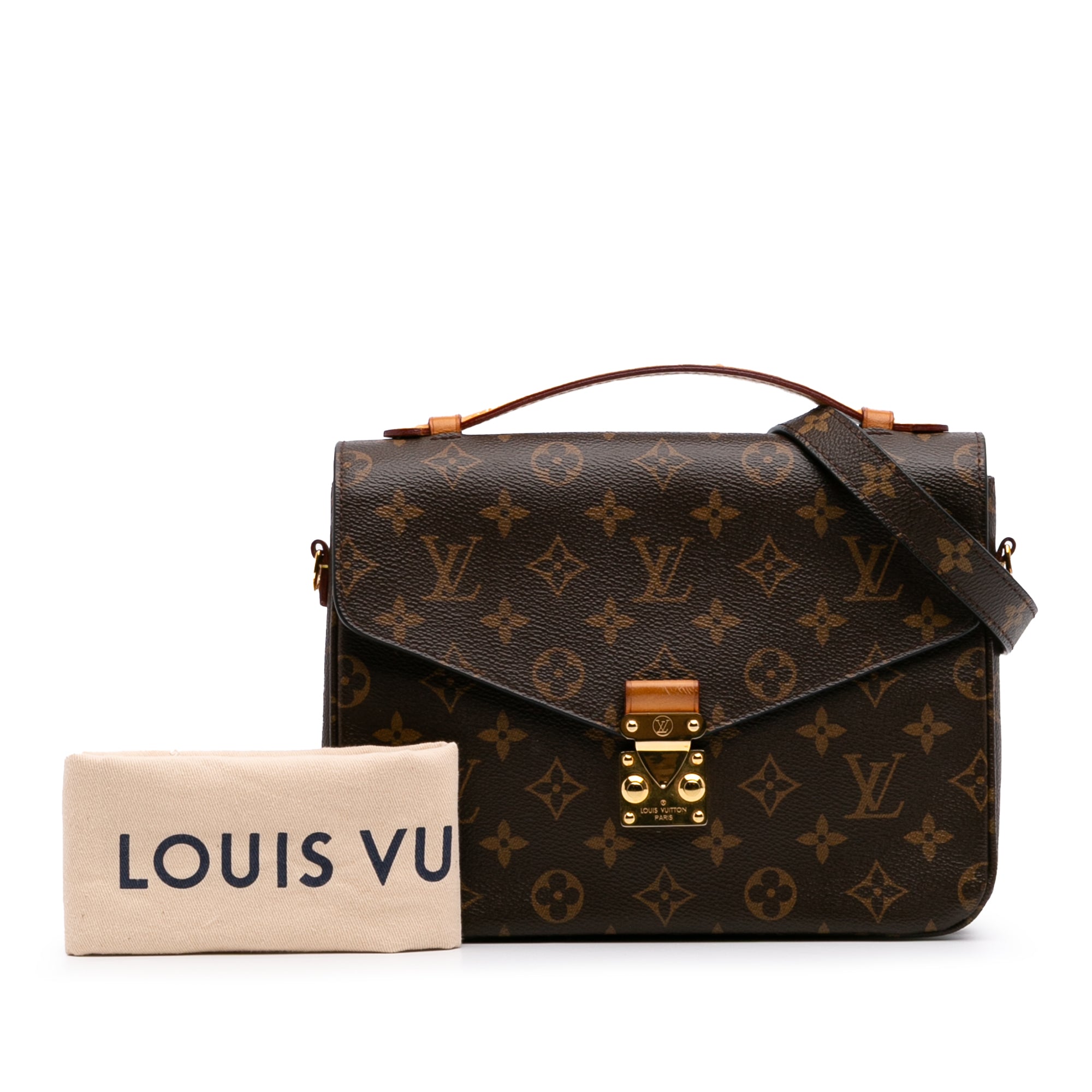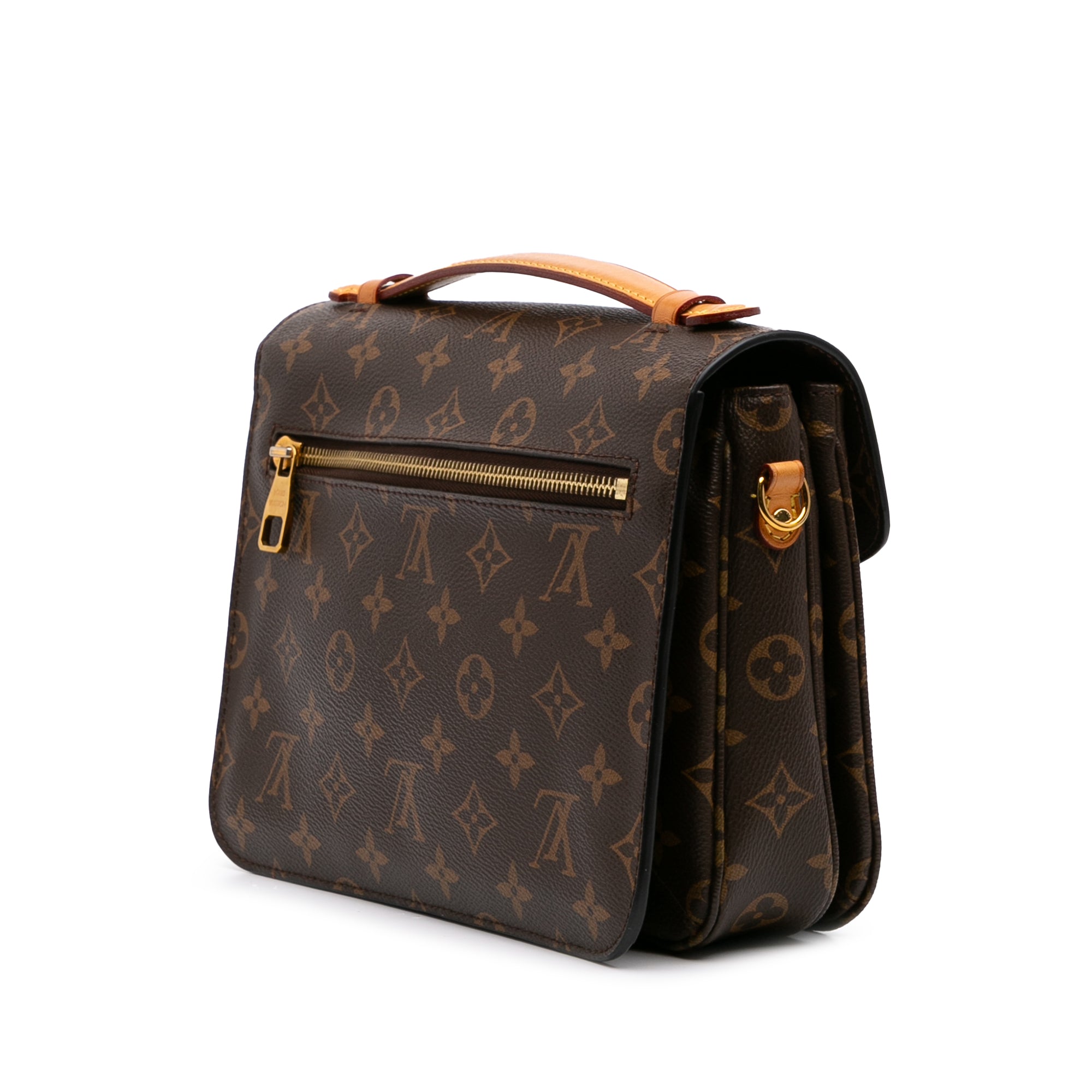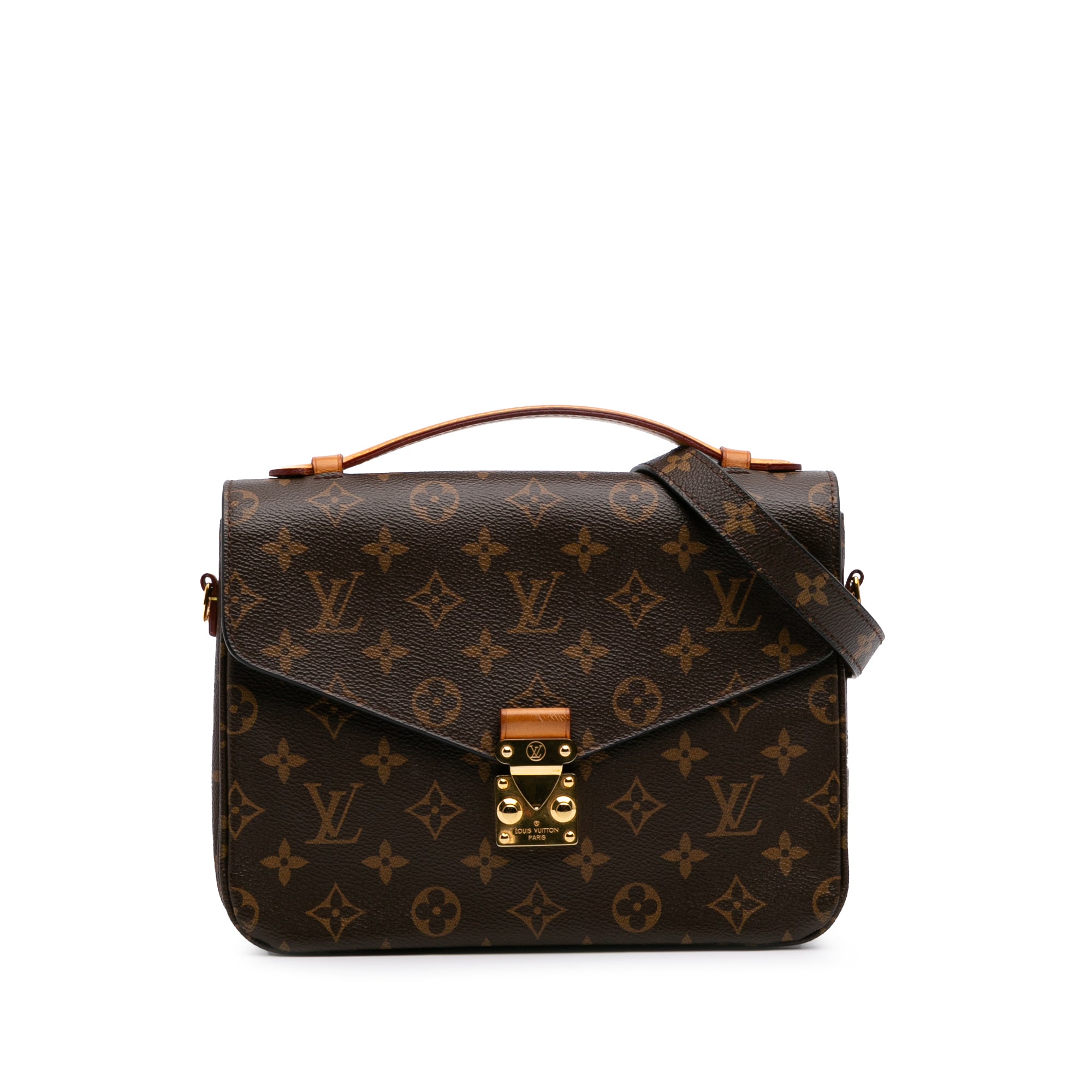 The Pochette Metis features a monogram canvas body, a flat vachetta leather top handle, a detachable flat shoulder strap, a front flap with an S-lock closure, an exterior zip pocket, and interior slip pockets. Inclusion: Dust bag. Retail Price: 2420.00