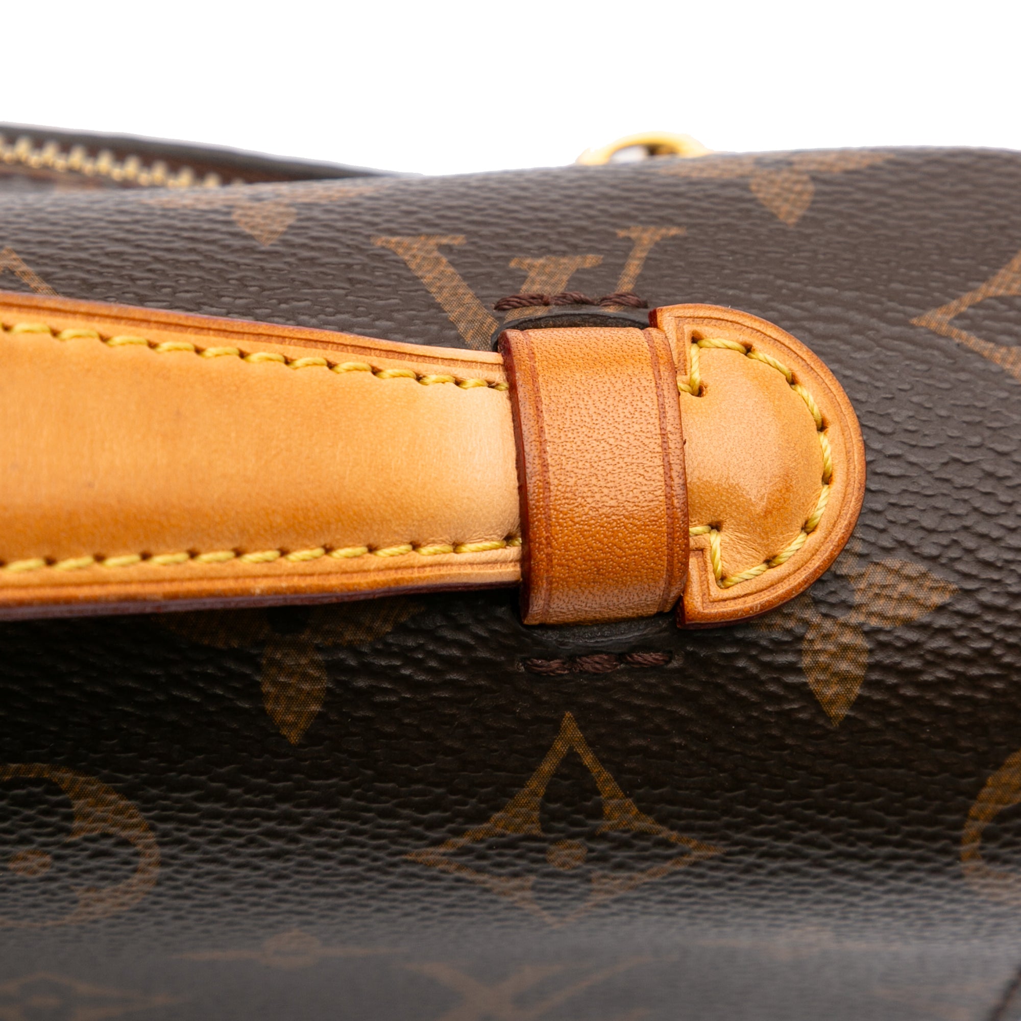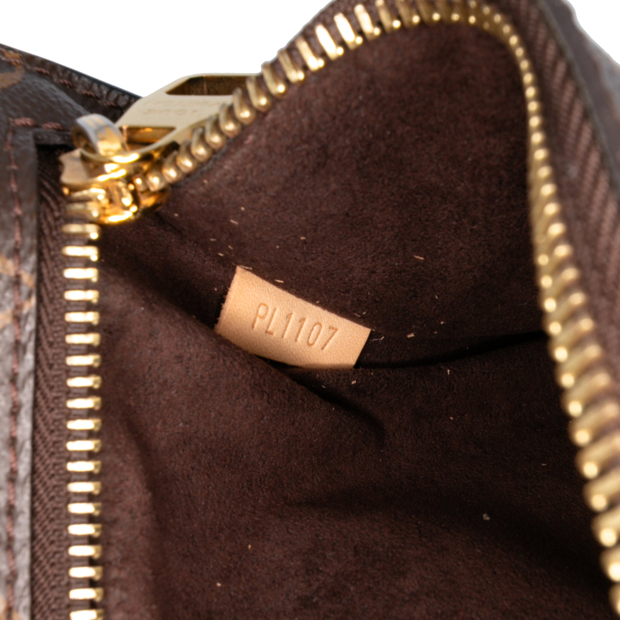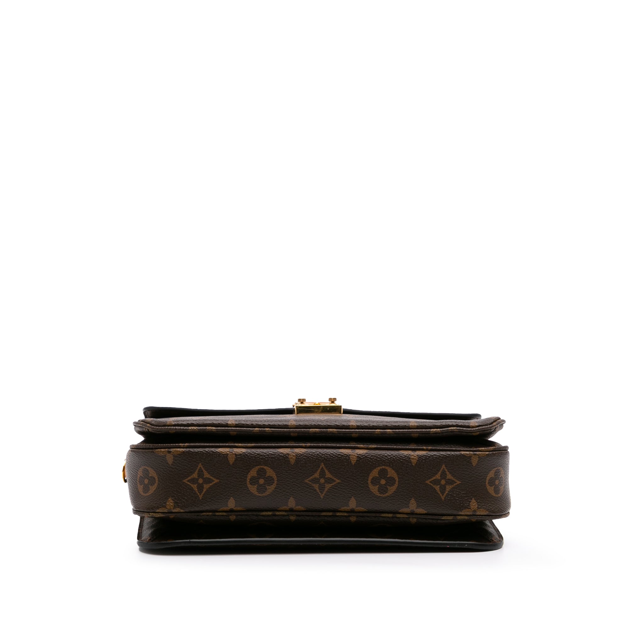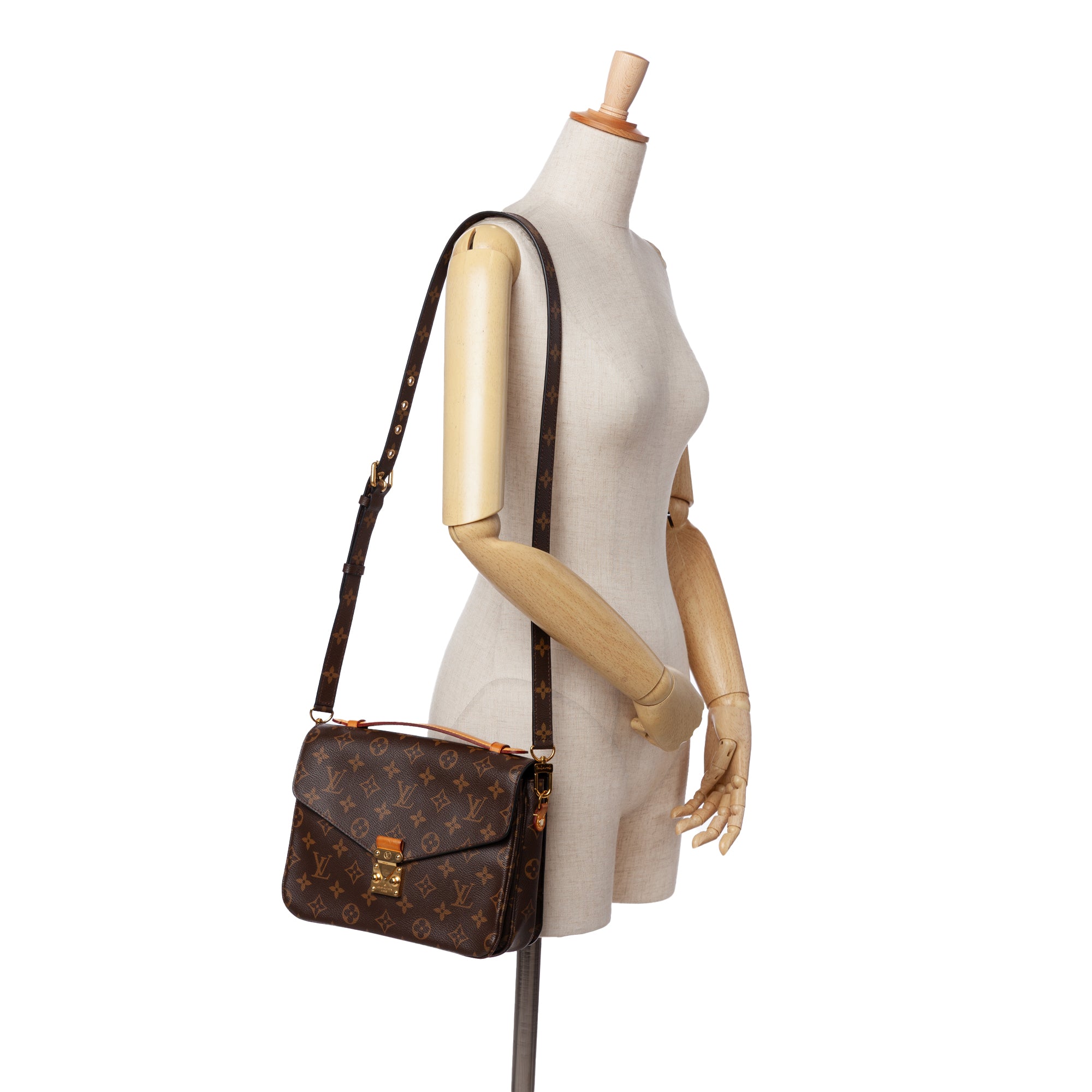 The Pochette Metis features a monogram canvas body, a flat vachetta leather top handle, a detachable flat shoulder strap, a front flap with an S-lock closure, an exterior zip pocket, and interior slip pockets. Inclusion: Dust bag. Retail Price: 2420.00