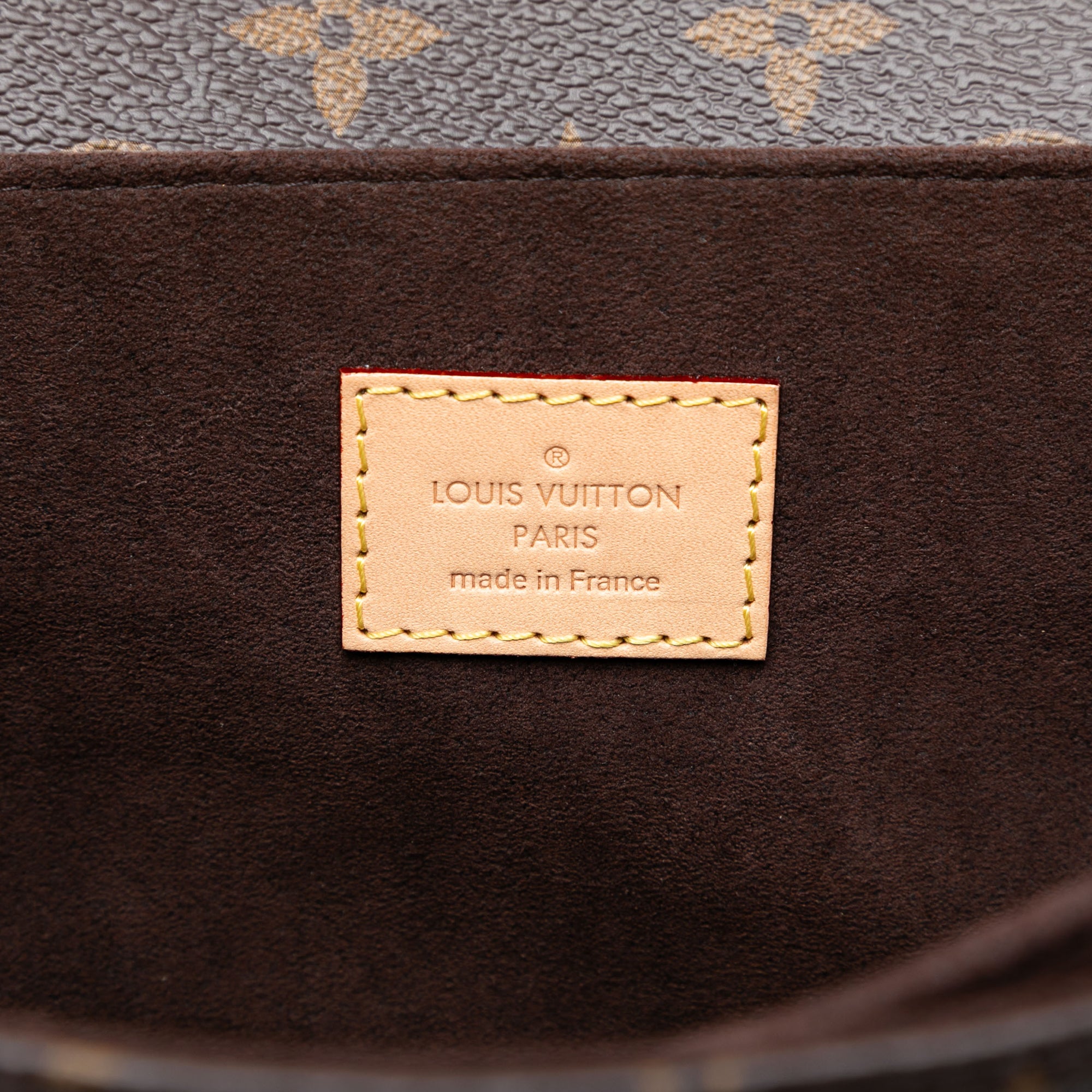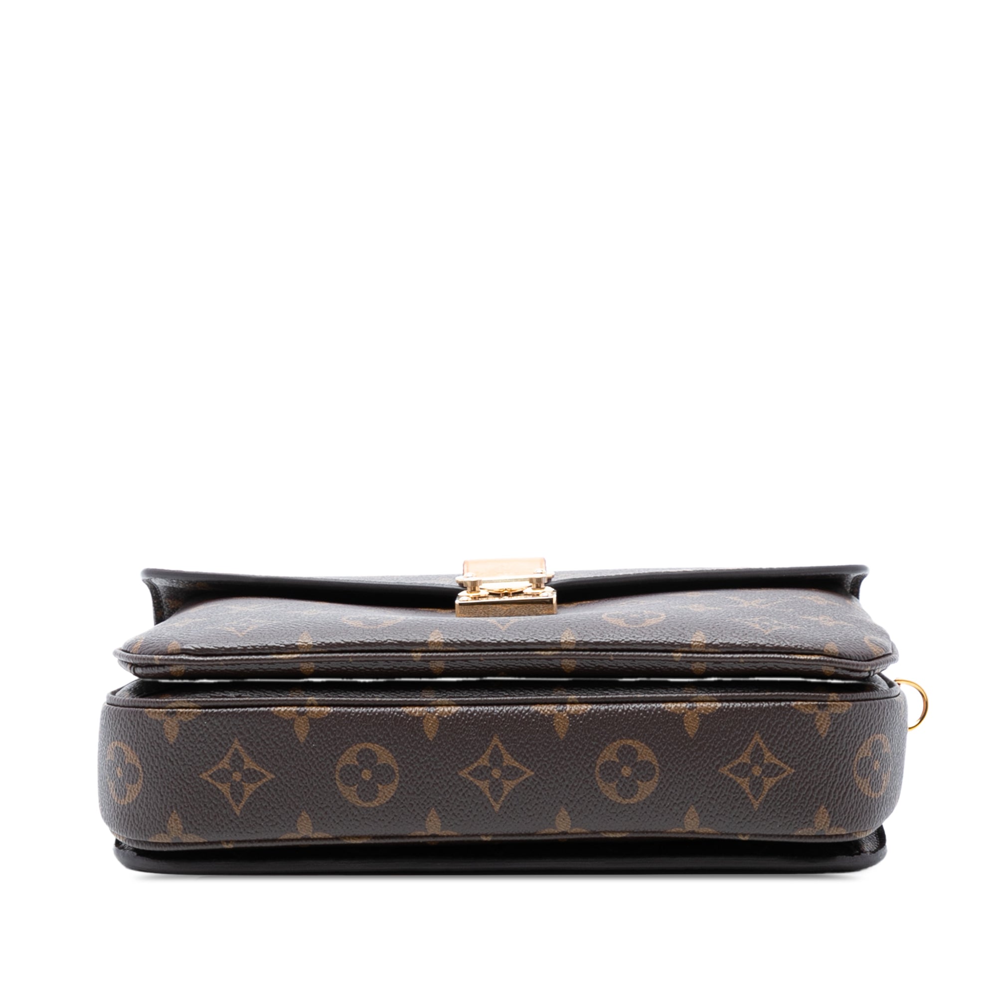The Pochette Metis features a monogram canvas body, a flat vachetta leather top handle, a detachable flat shoulder strap, a front flap with an S-lock closure, an exterior zip pocket, and interior slip pockets. Retail Price: 2400.00