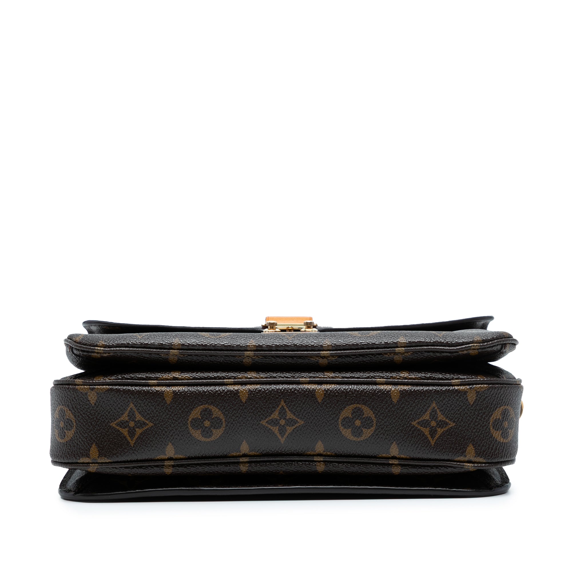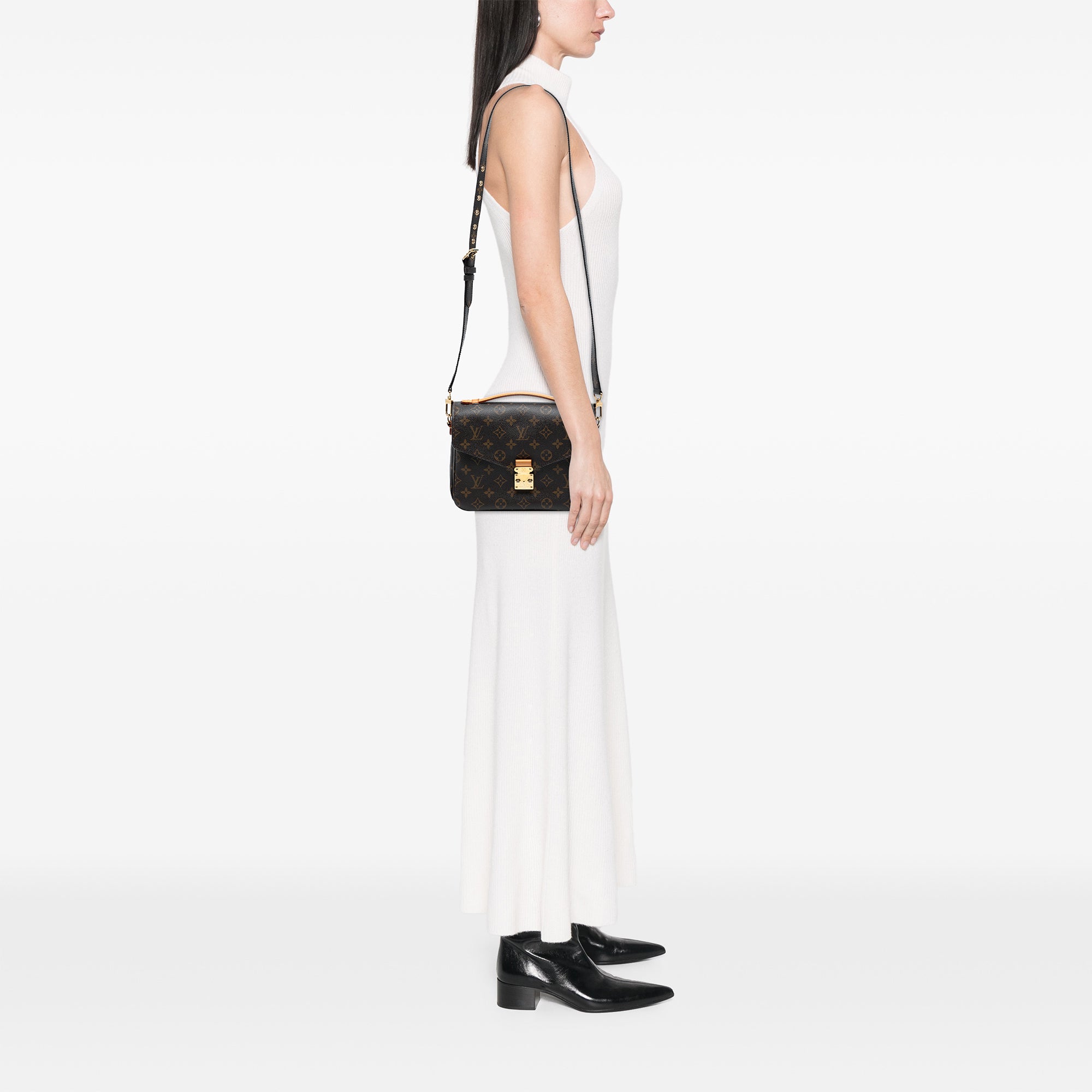 The Pochette Metis features a monogram canvas body, a flat vachetta leather top handle, a detachable flat shoulder strap, a front flap with an S-lock closure, an exterior zip pocket, and an interior slip pocket. Retail Price: 2400.00
