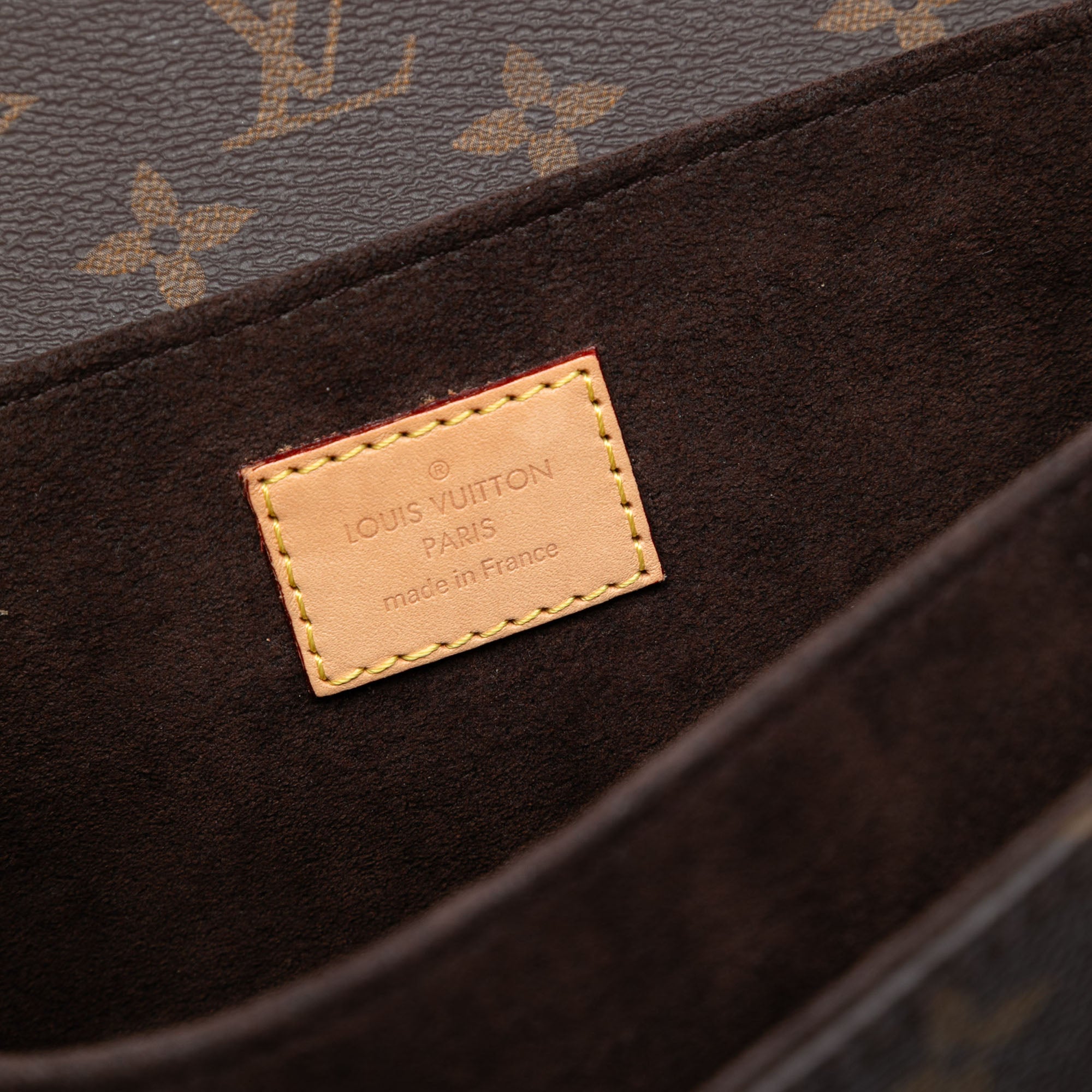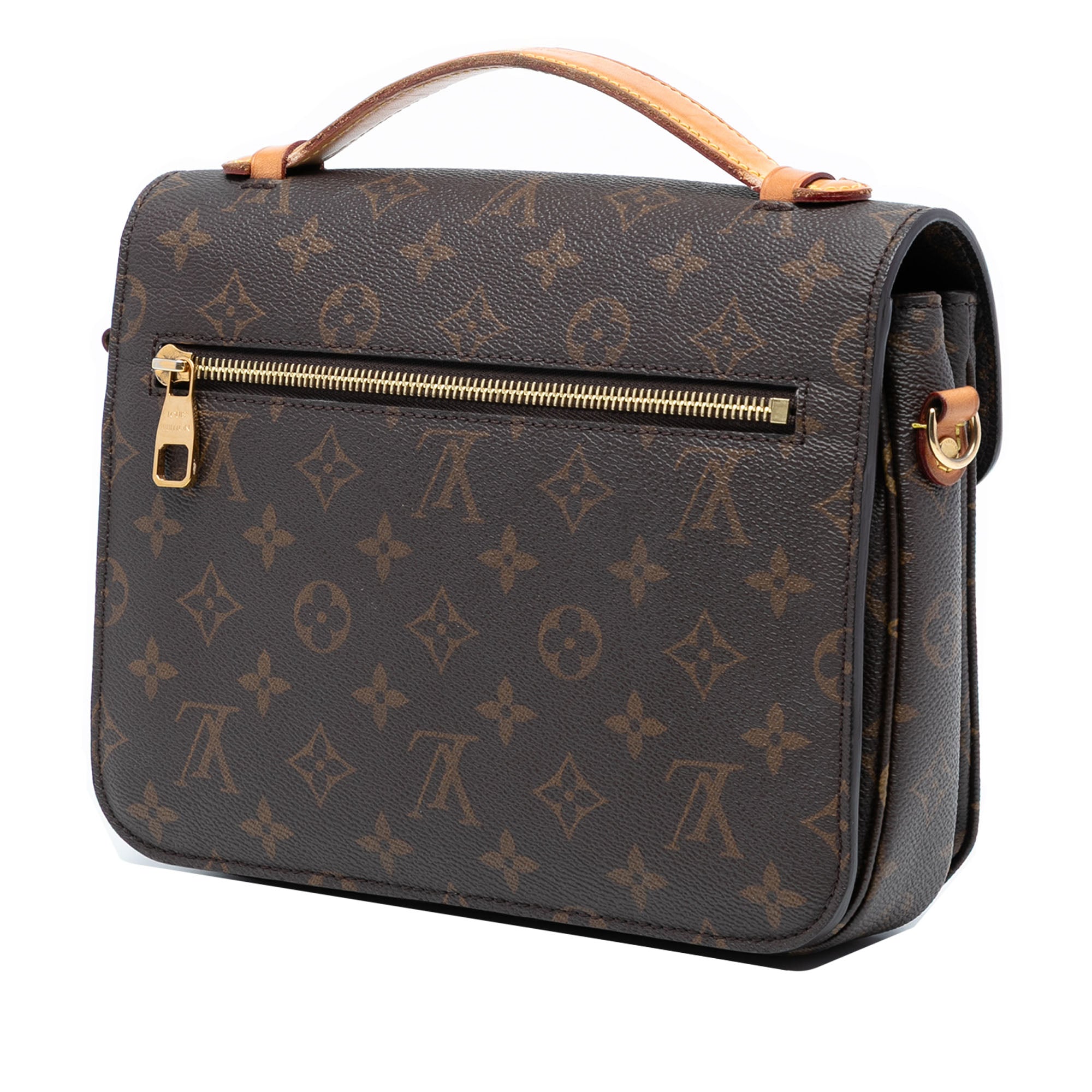 The Pochette Metis features a monogram canvas body, a flat vachetta leather top handle, a detachable flat shoulder strap, a front flap with an S-lock closure, an exterior zip pocket, and interior slip pockets. Retail Price: 2200.00