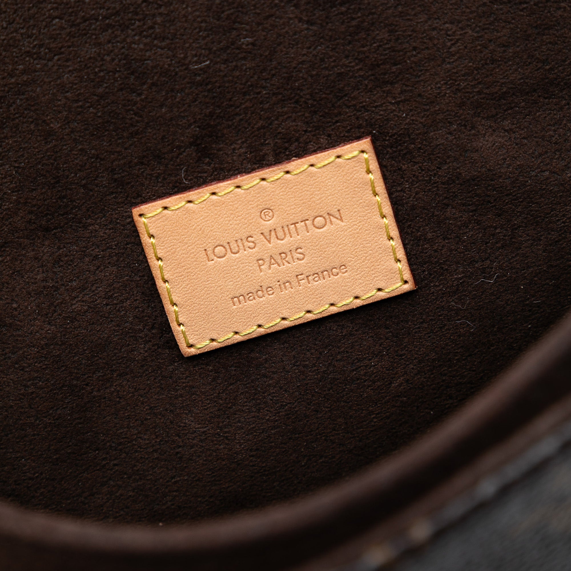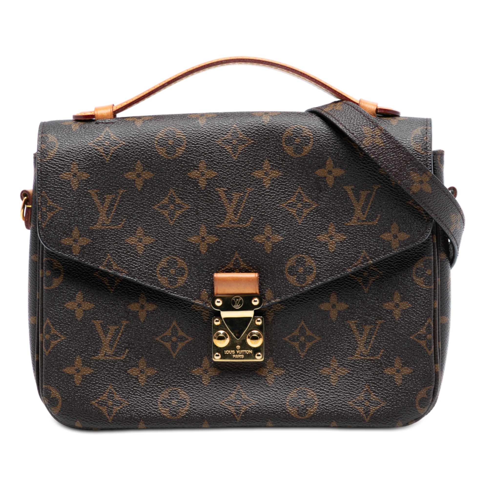 The Pochette Metis features a monogram canvas body, a flat vachetta leather top handle, a detachable flat shoulder strap, a front flap with an S-lock closure, an exterior zip pocket, and interior slip pockets. Retail Price: 2200.00