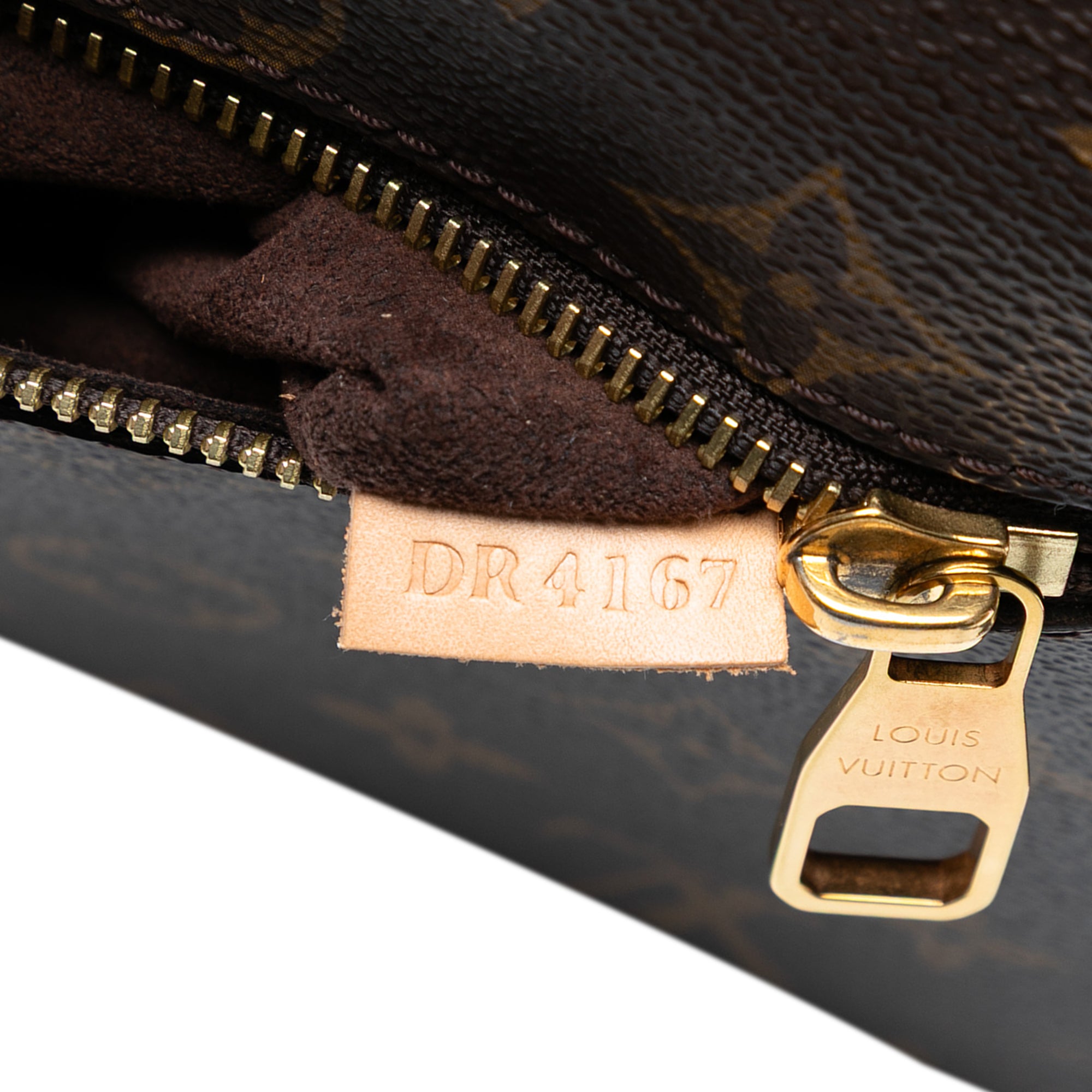 The Pochette Metis features a monogram canvas body, a flat vachetta leather top handle, a detachable flat shoulder strap, a front flap with an S-lock closure, an exterior zip pocket, and interior slip pockets. Retail Price: 2200.00