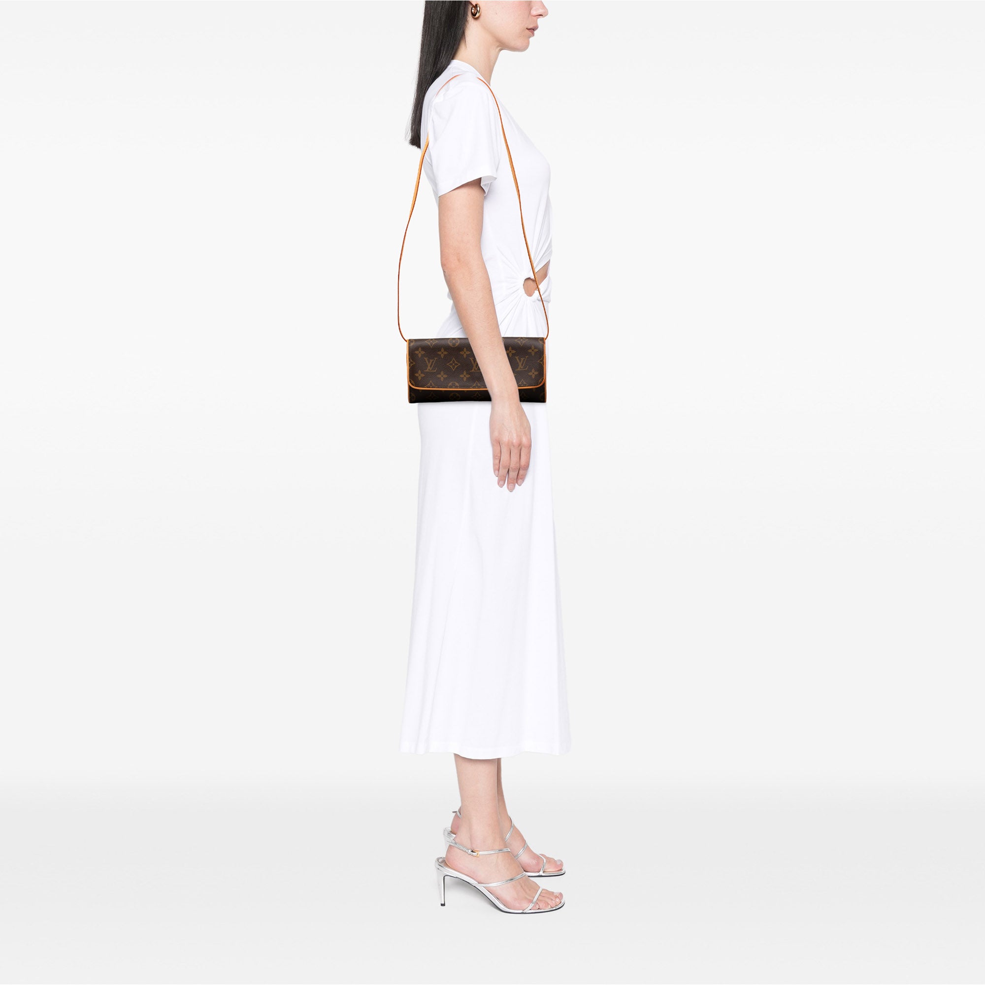 The Pochette Twin GM features a monogram canvas body with vachetta leather trim, a flat vachetta leather strap, and a front flap with magnetic snap closure Retail Price: 905.00