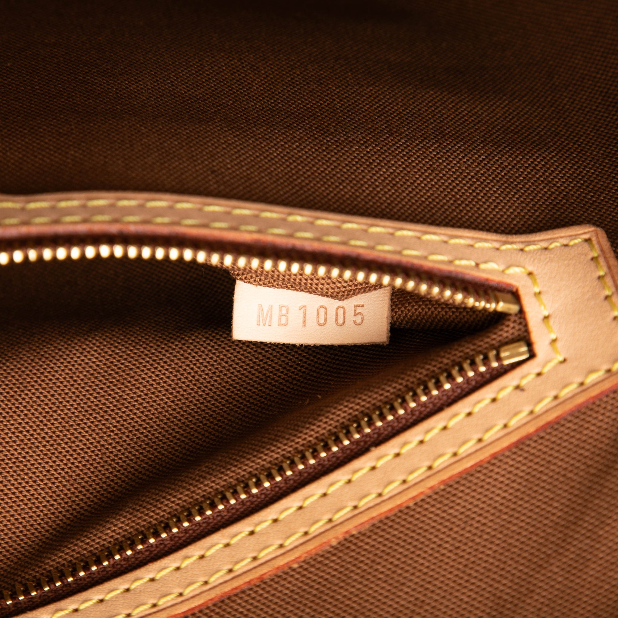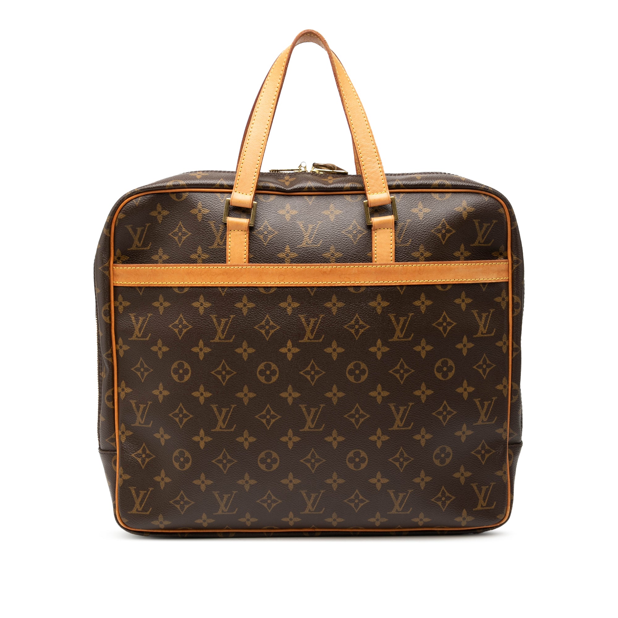 The Porte-Documents Pegase features a monogram canvas body with vachetta leather trim, flat vachetta leather straps, a top zip closure, and interior zip, slip and open pockets. Retail Price: 1300.00