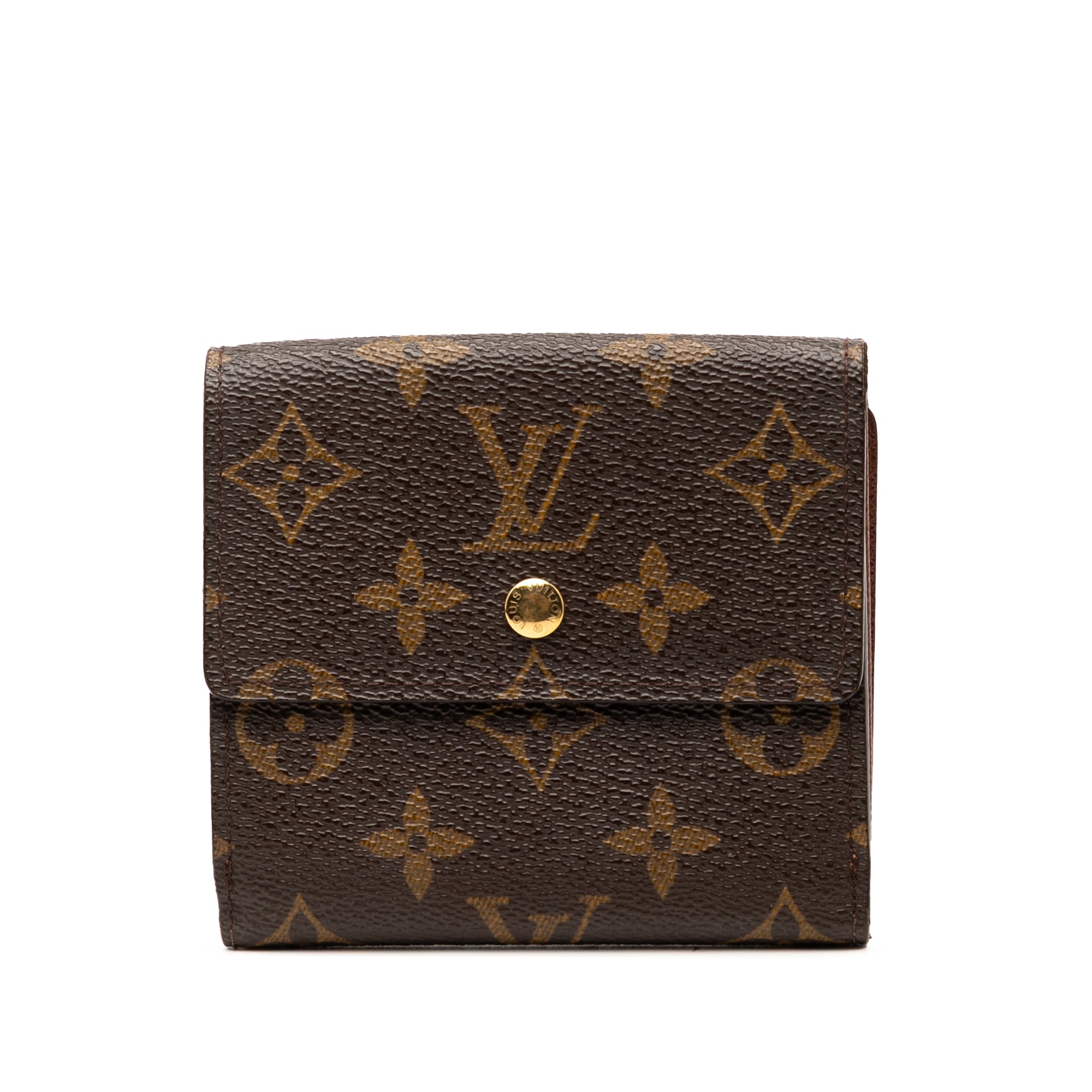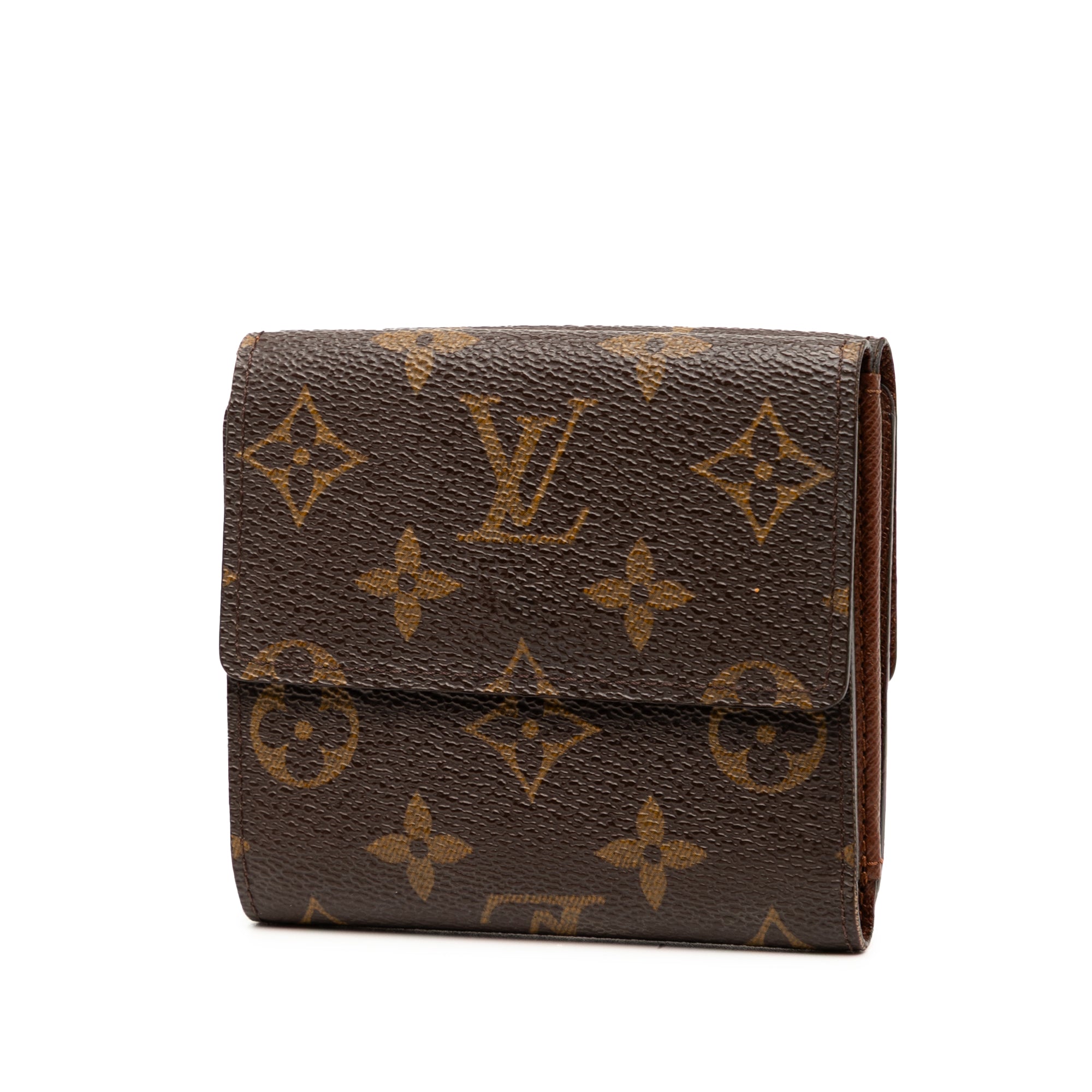 The Elise wallet features monogram canvas body, a front flap with snap closure, an exterior back flap compartment, and interior slip pockets. Retail Price: 975.00