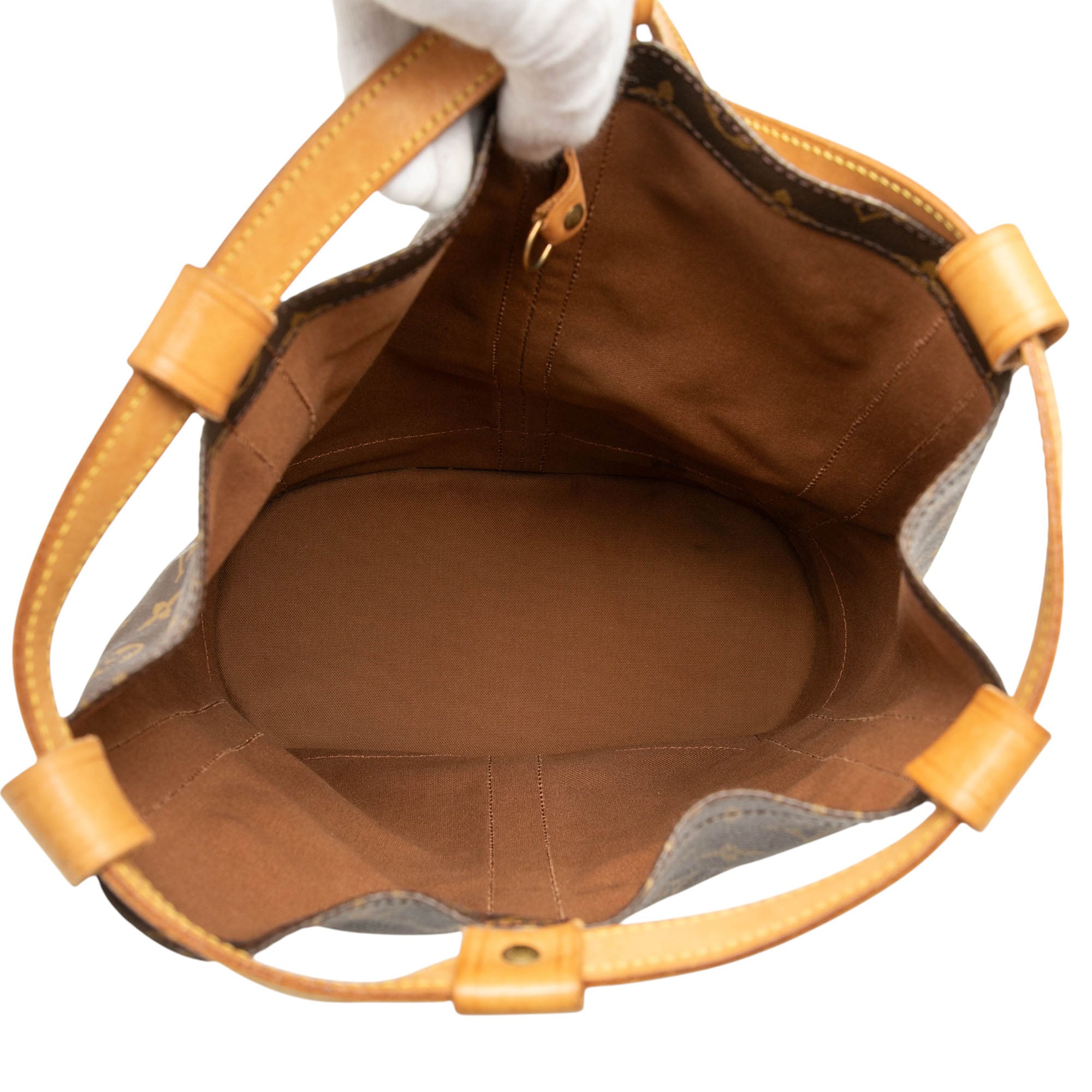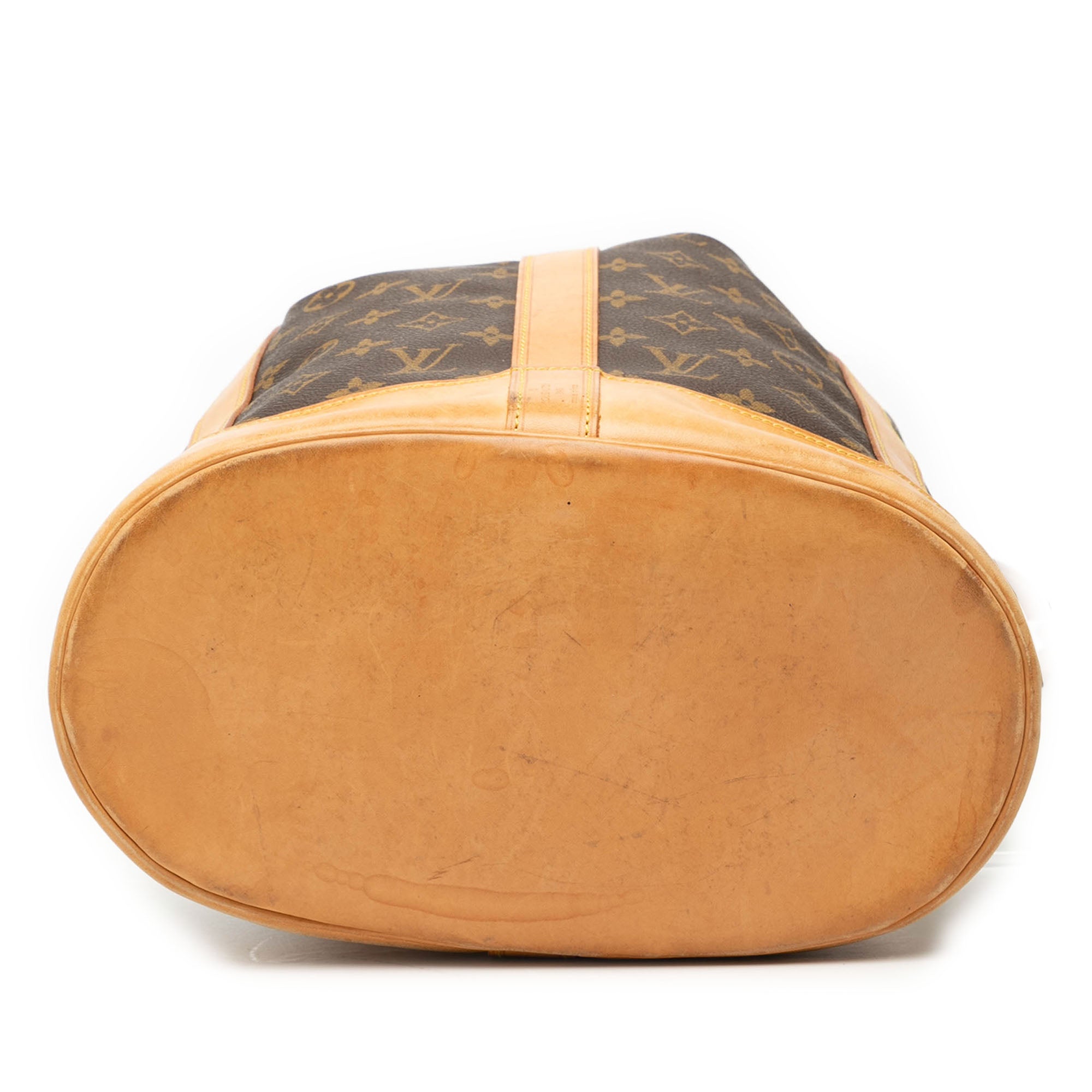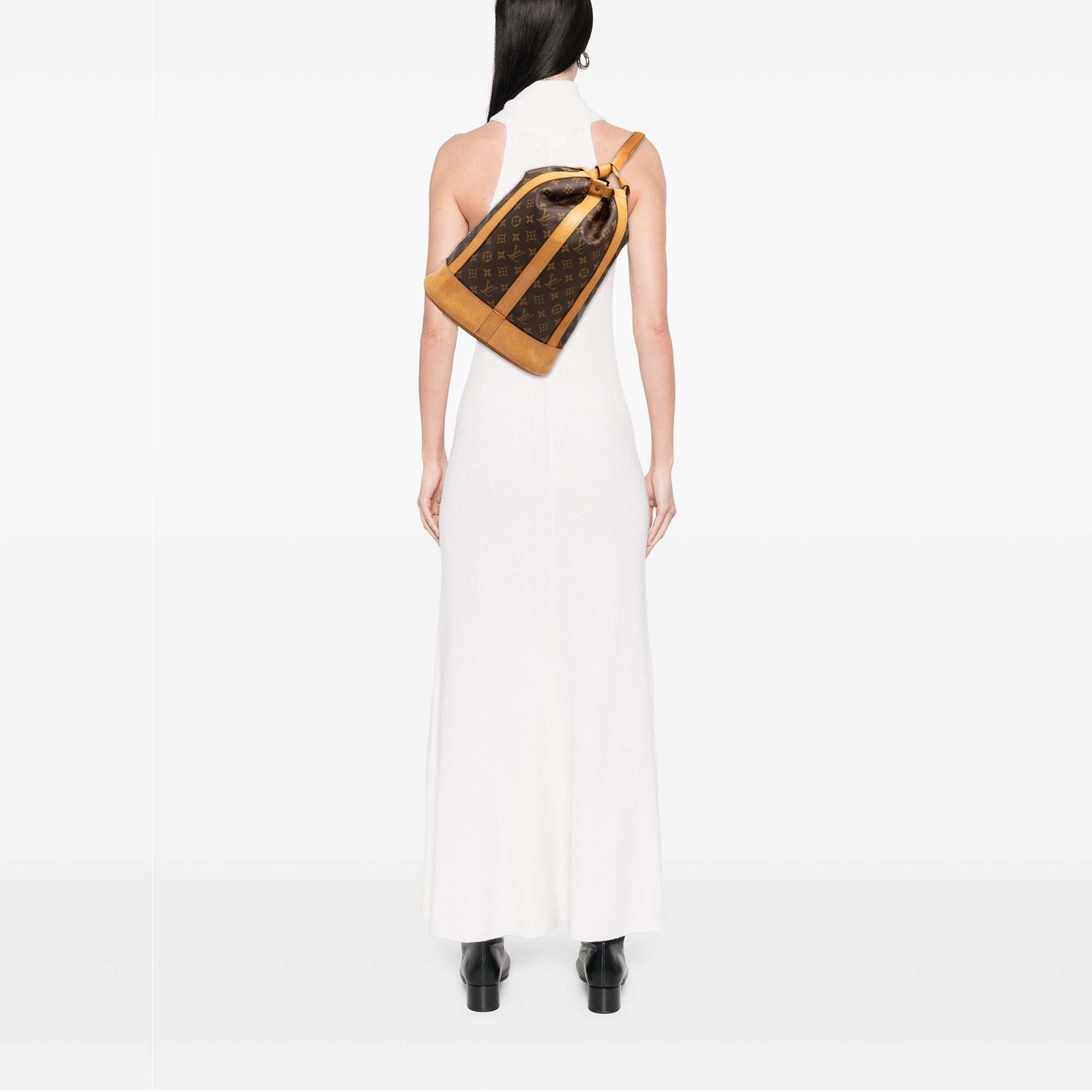 The Randonnee PM features a monogram canvas body with vachetta leather trim, a flat vachetta leather strap, and a top drawstring closure. Retail Price: 1600.00