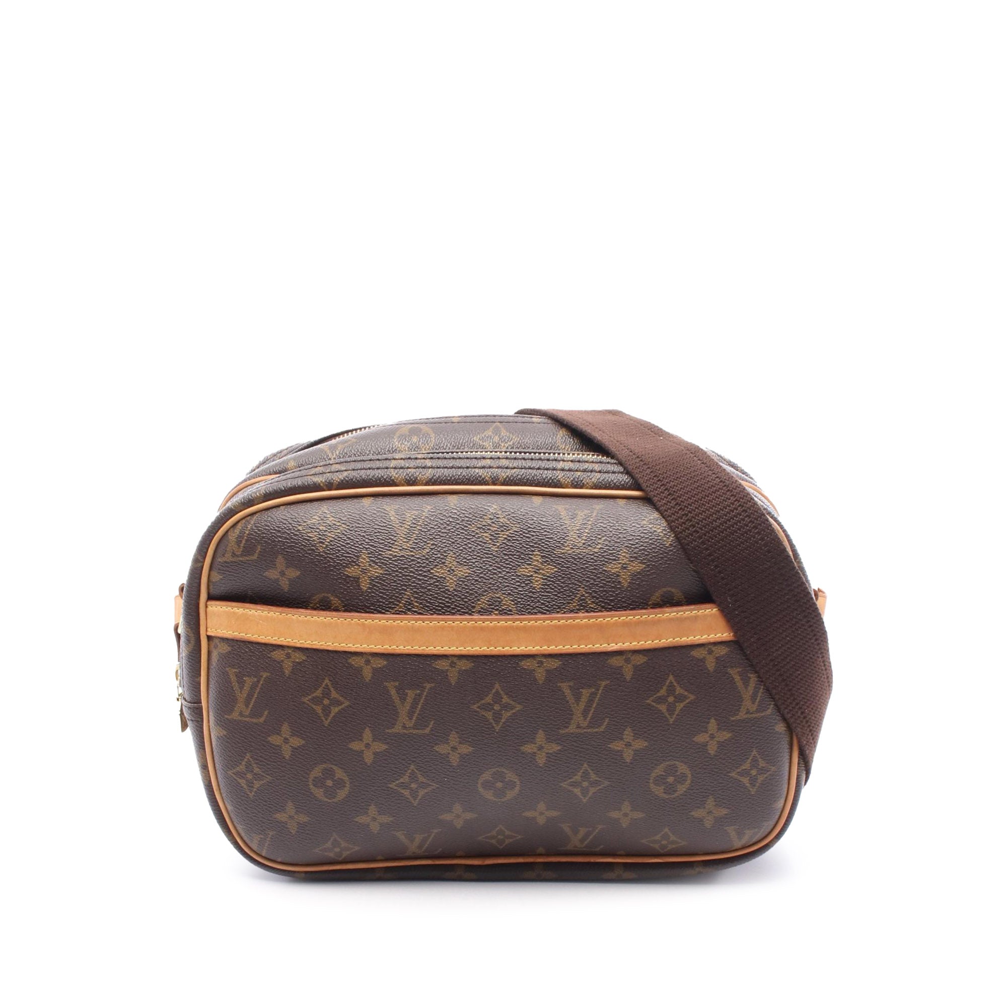 The Reporter PM features a monogram canvas body with leather trim, a front exterior slip pocket, an adjustable flat strap, double compartments with top zip closures, and interior slip pockets. Retail Price: 1350.00