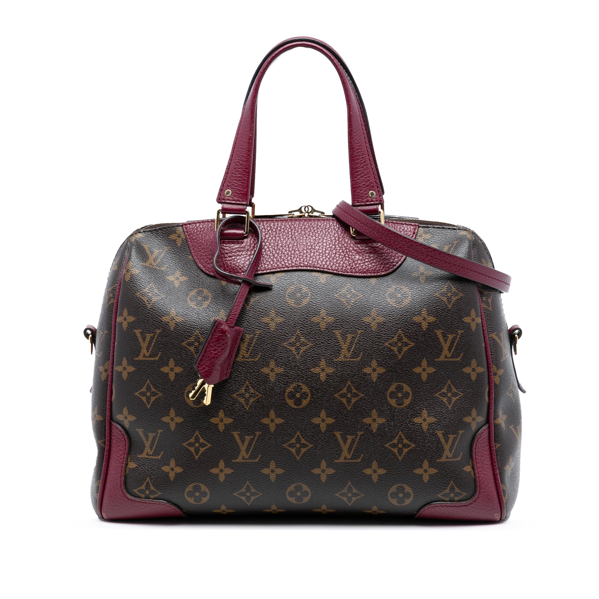 The Retiro features a monogram canvas body with leather trim, flat handles, a detachable leather strap, a top zip closure, and interior zip pockets. Retail Price: 2110.00
