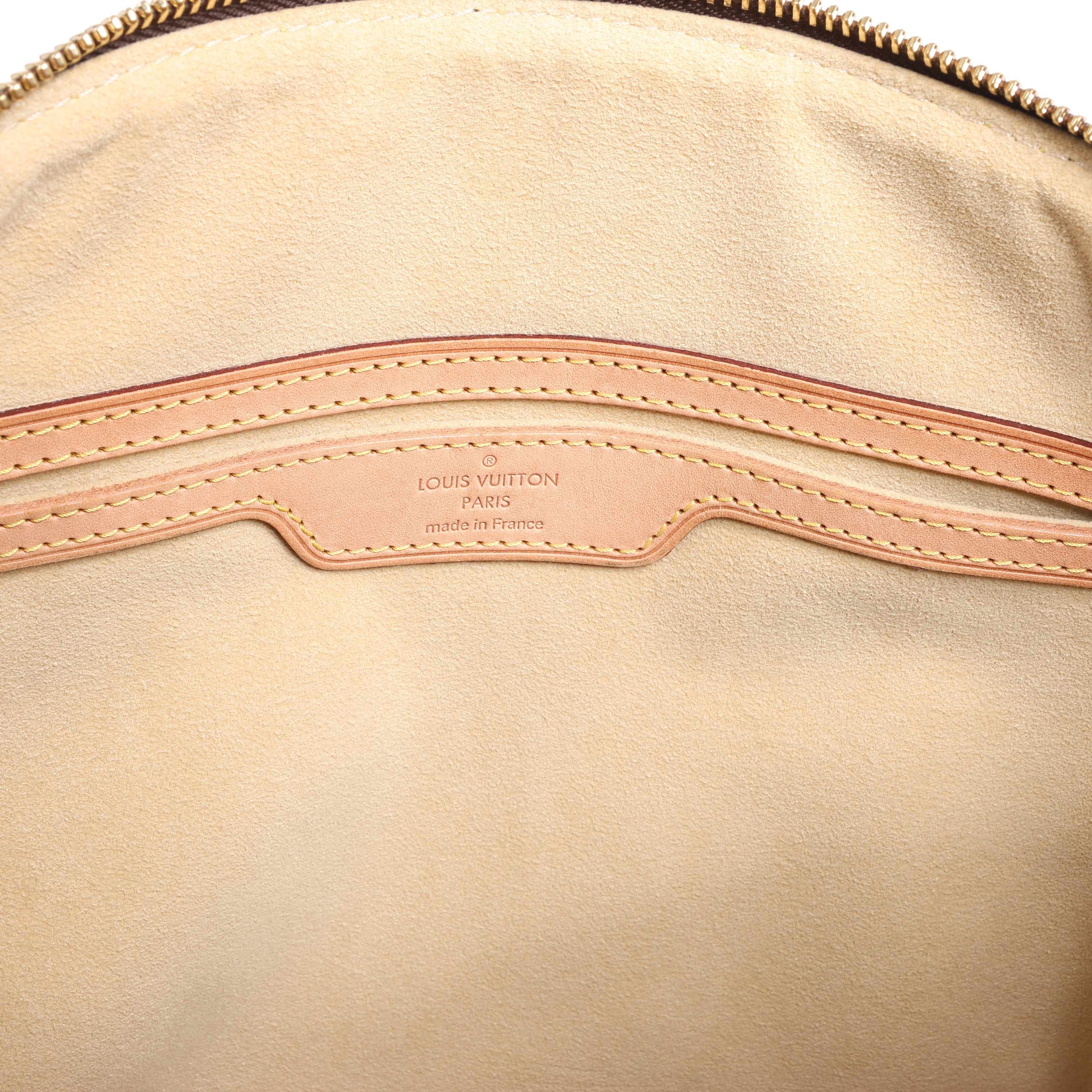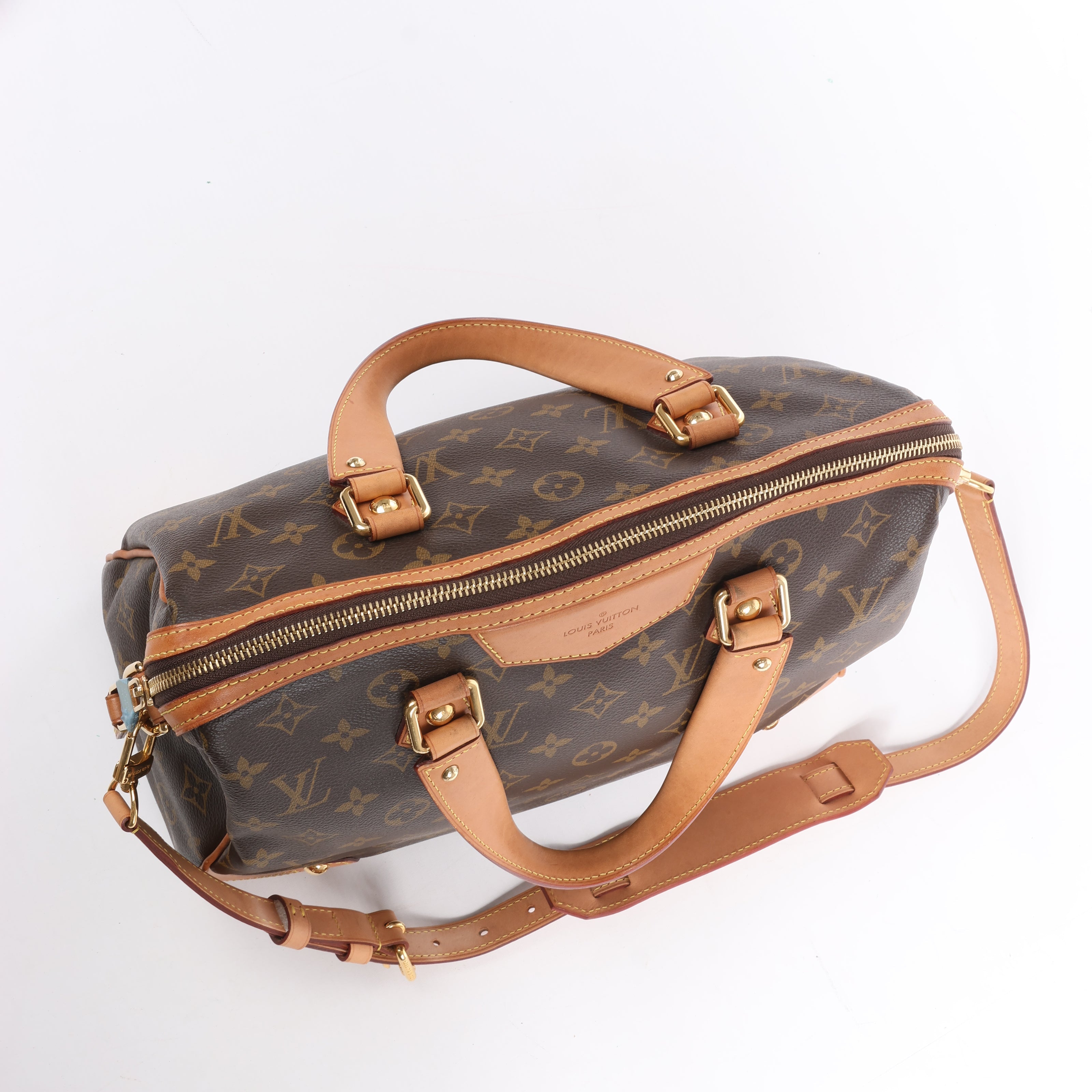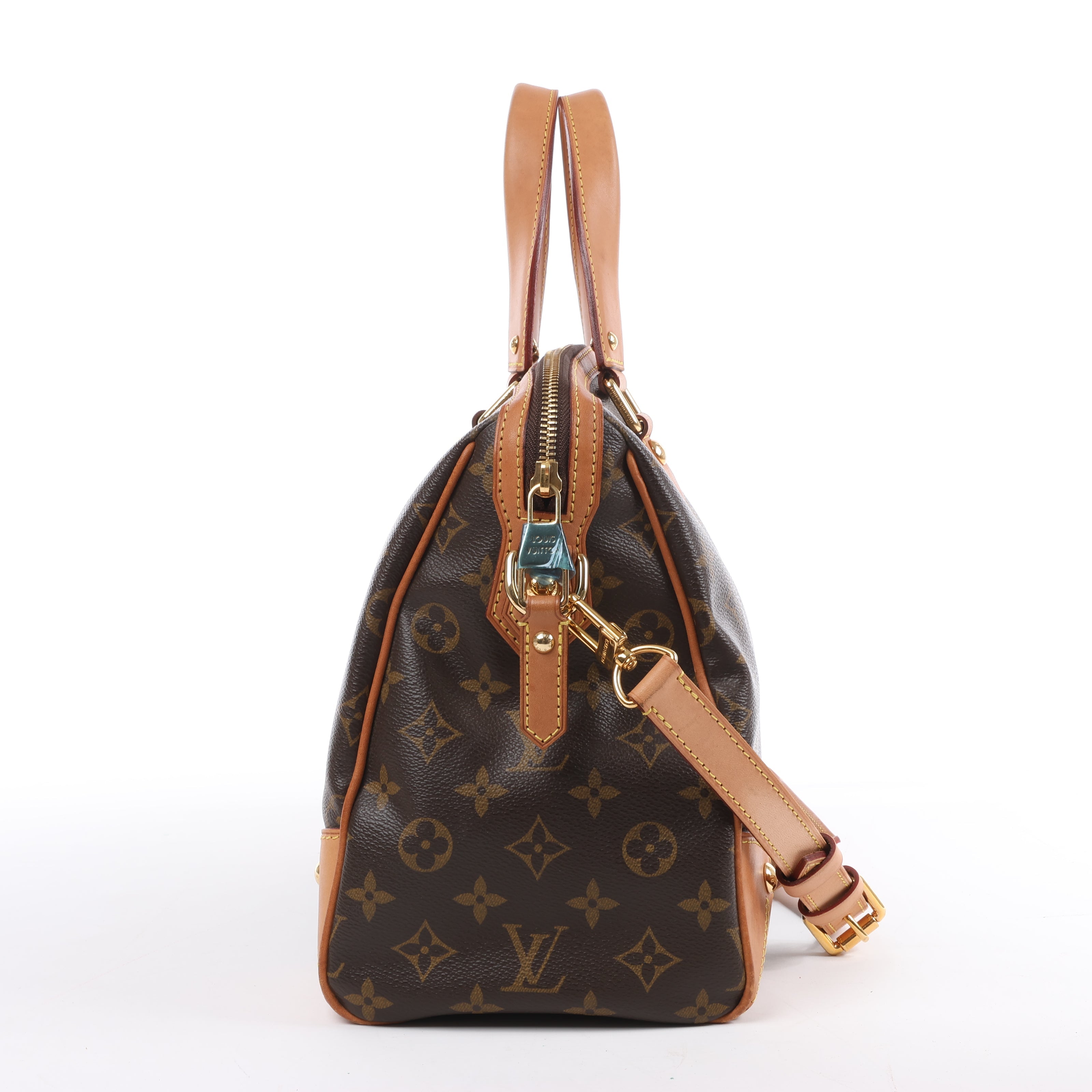 A chic city bag in Monogram canvas with natural cowhide trim. Features rolled leather handles, a removable shoulder strap, gold-tone hardware, and a secure top zip closure. The roomy interior is lined and includes multiple pockets for organization.