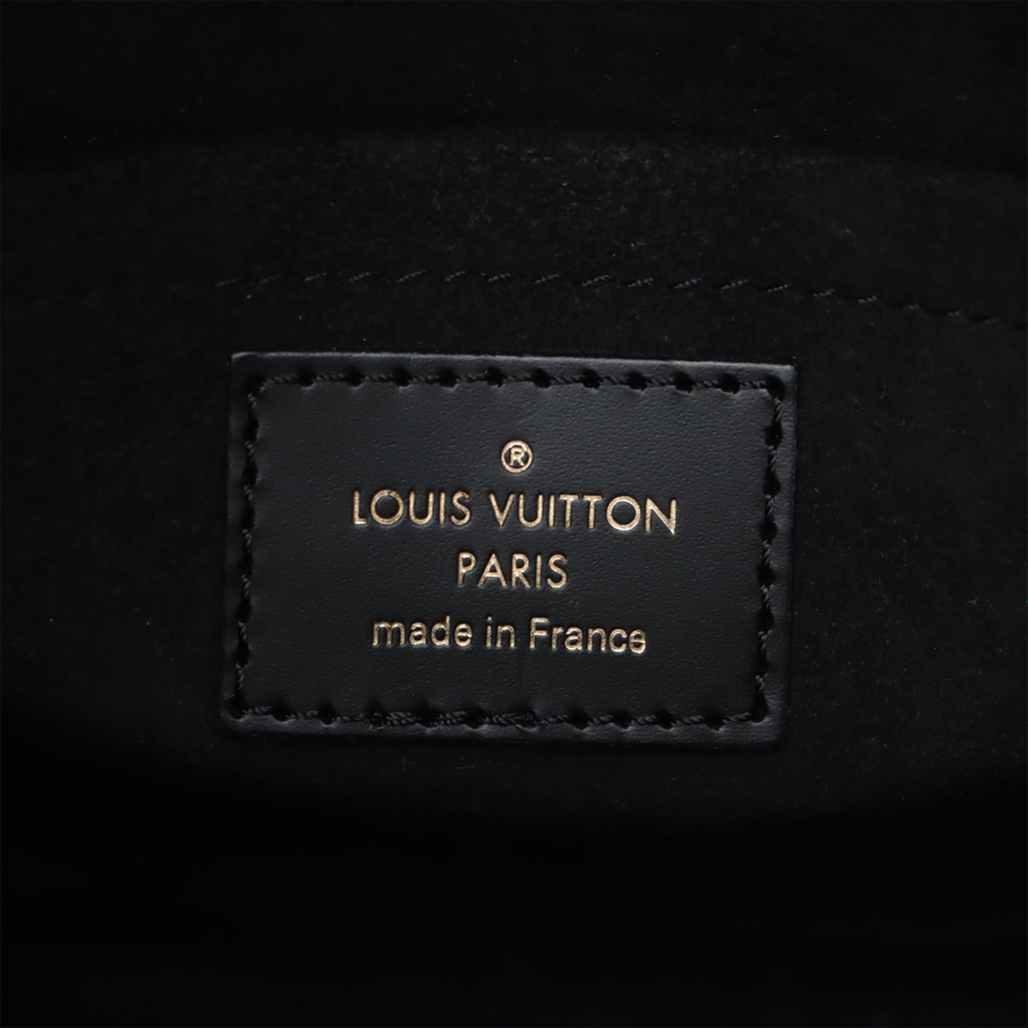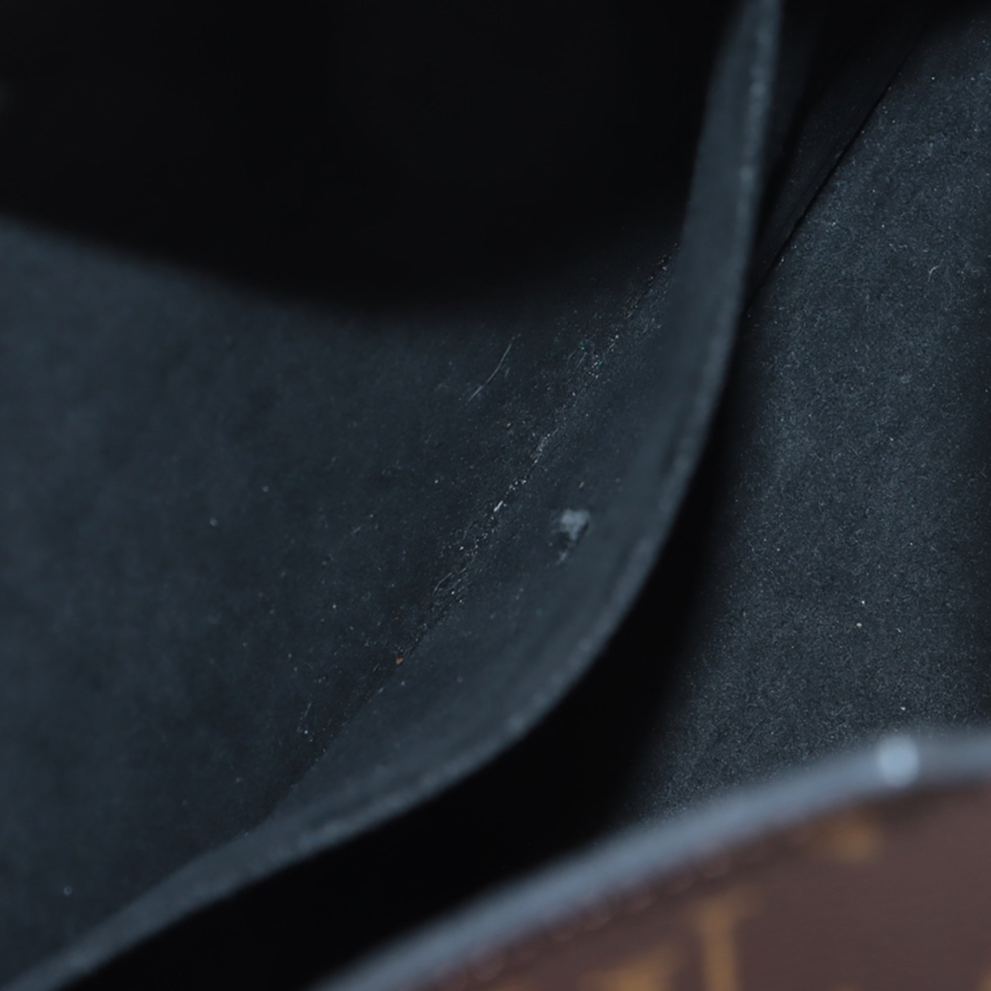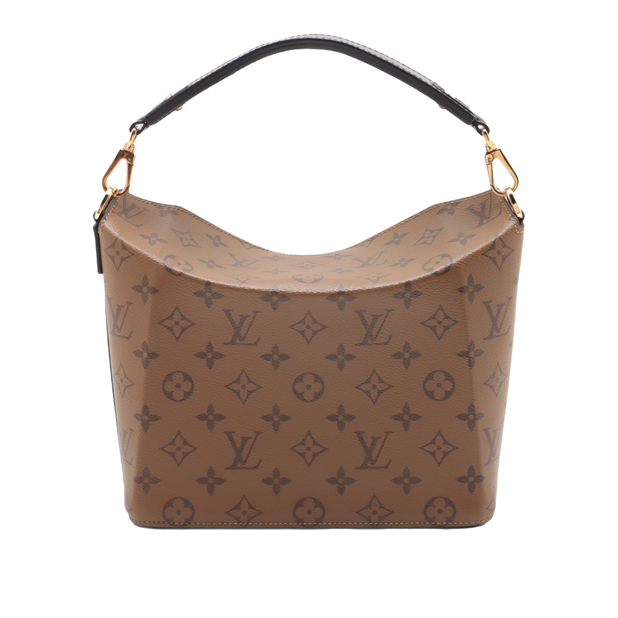 The Bento Box features a monogram reverse canvas body with leather trim, a flat leather handle, a detachable flat leather shoulder strap, a fold-over top with push-lock closure, and an interior slip pocket. Retail Price: 2150.00