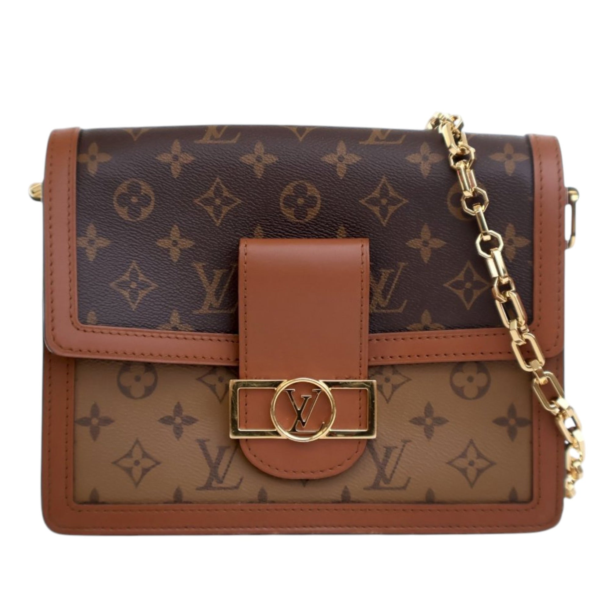 The Dauphine features a monogram reverse canvas body, a gold tone chain and flat leather strap, a front flap with magnetic closure, and interior zip and slip pockets. Inclusion: Dust bag, box. Retail Price: 3800.00