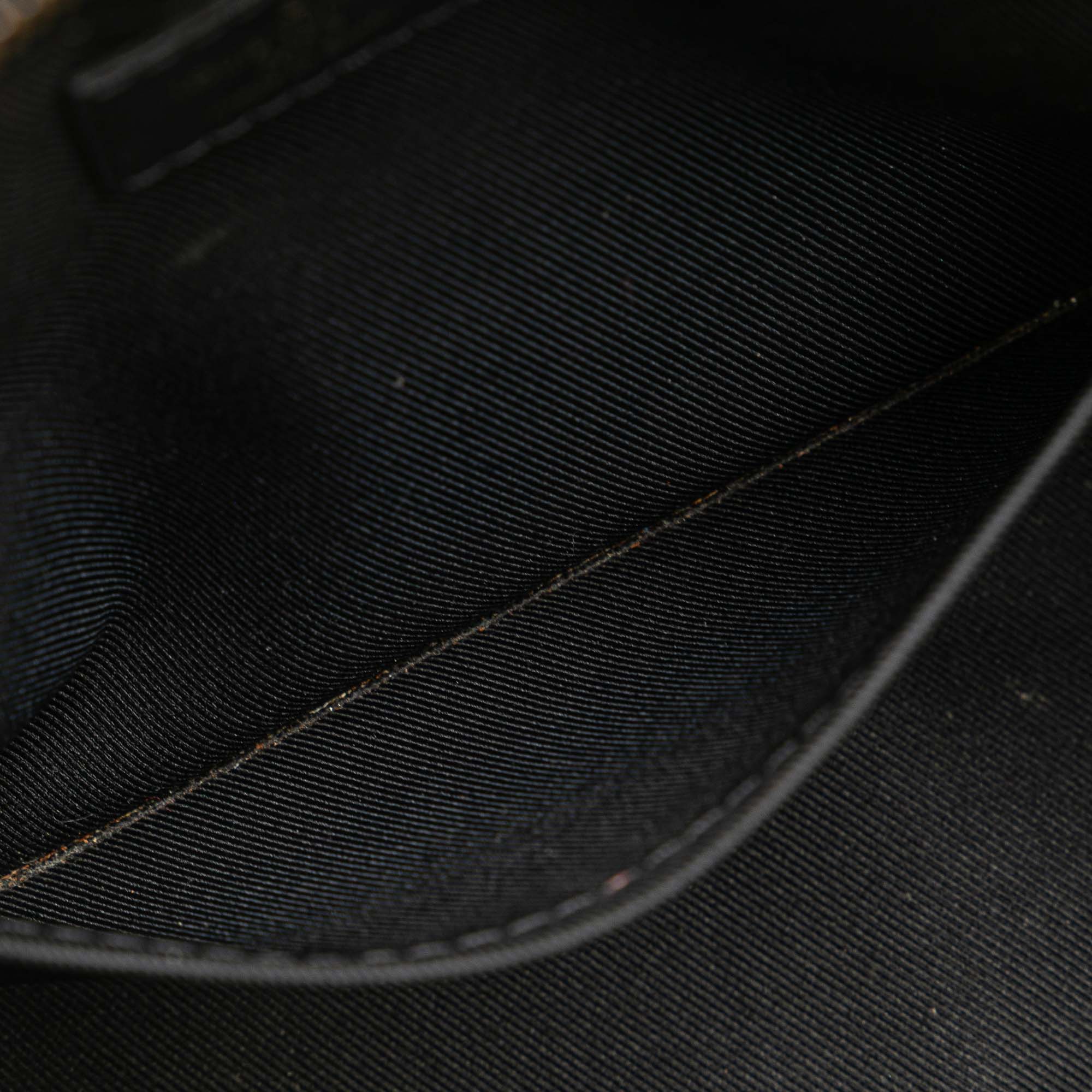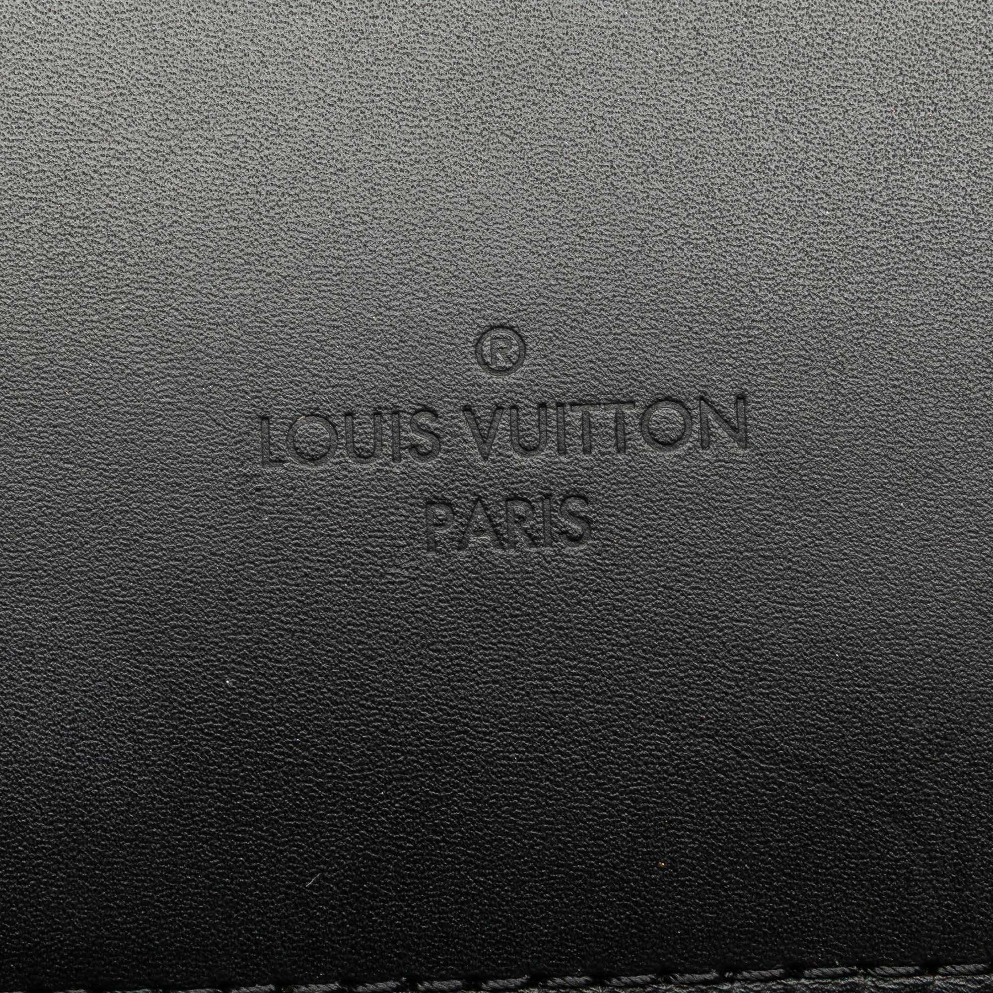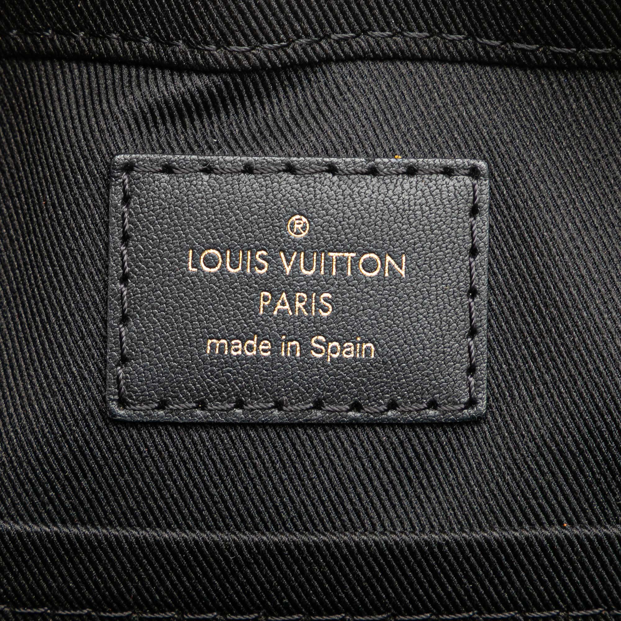 The Saintonge features a monogram canvas body with leather trim, a flat leather top handle, a flat leather strap, a top zip closure, and an interior slip pocket. Retail Price: 1635.00