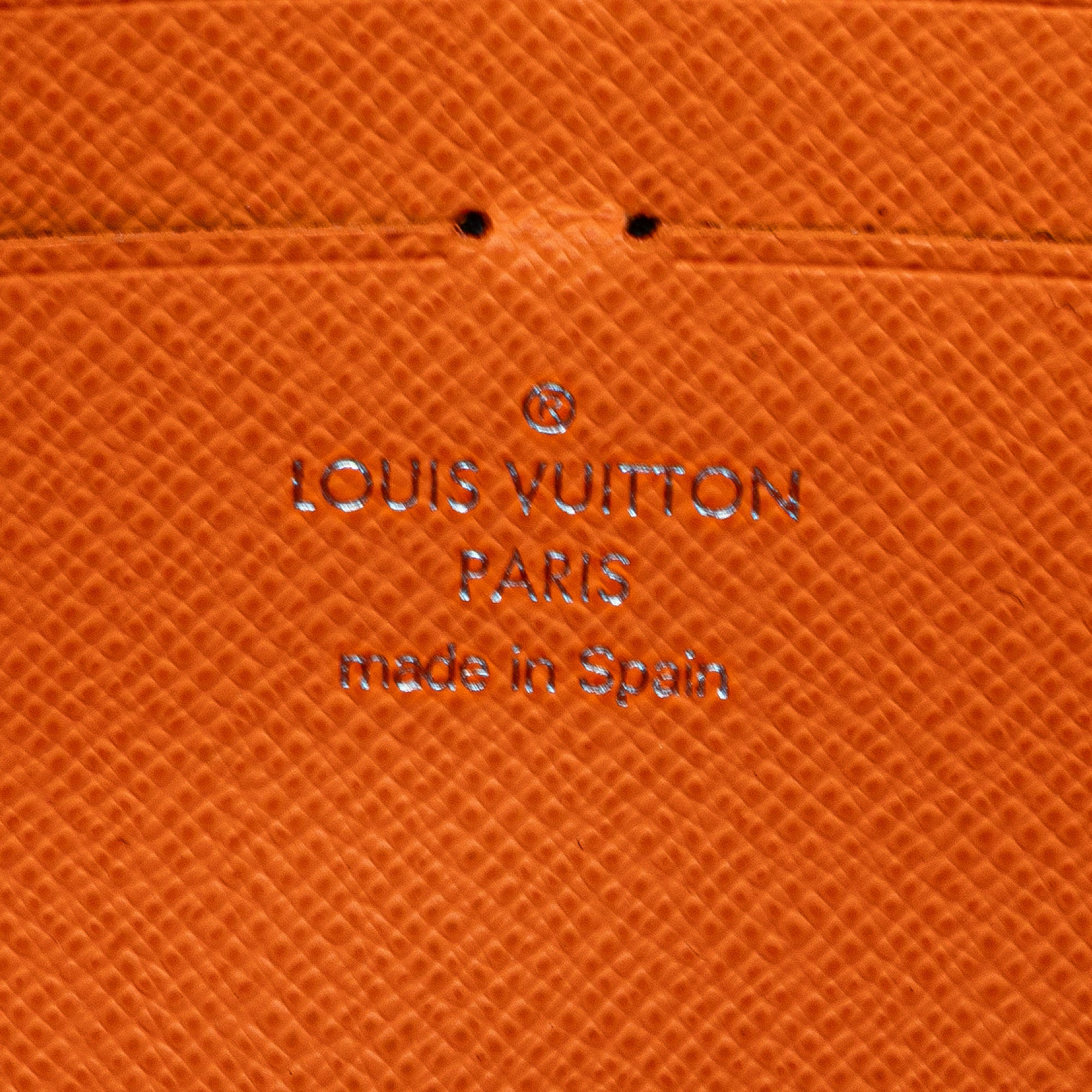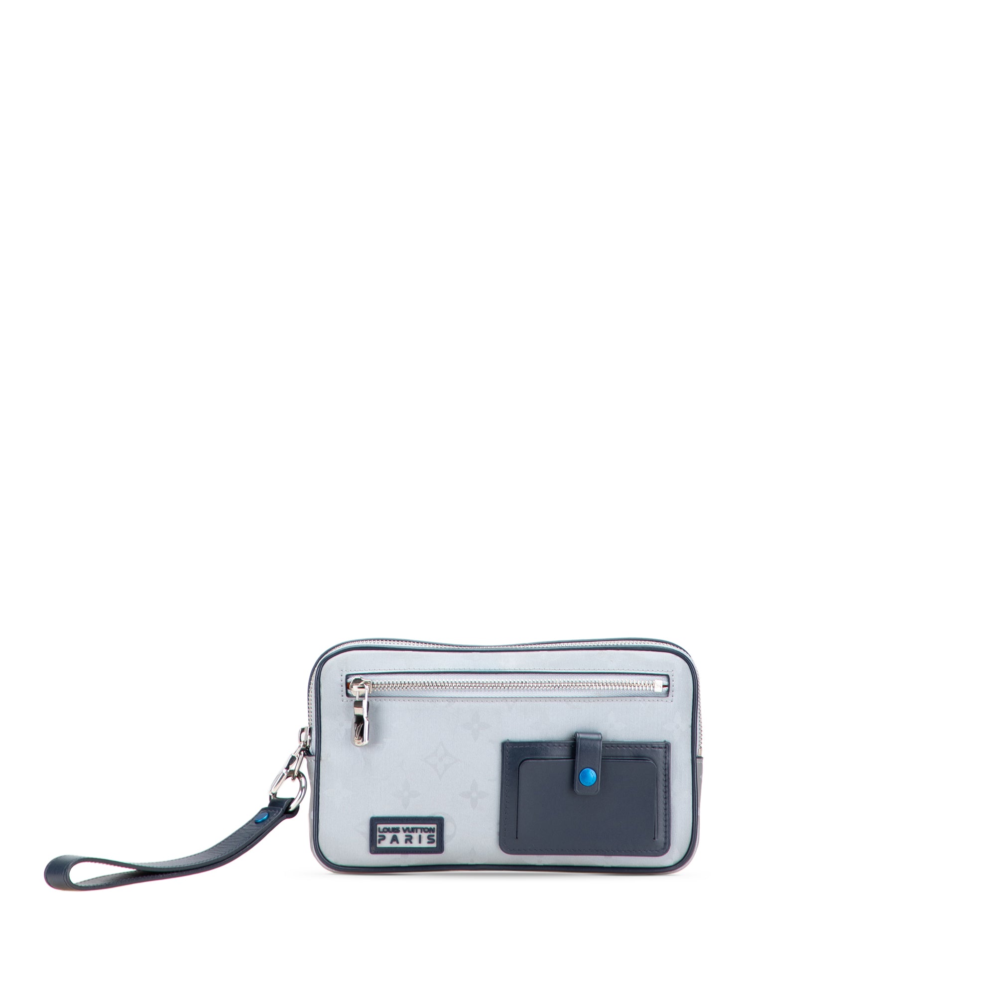 The Satellite Alpha clutch features a monogram canvas body with leather trim, a flat leather wrist strap, a top zip closure, exterior pockets, and interior slip pockets. Retail Price: 1235.00
