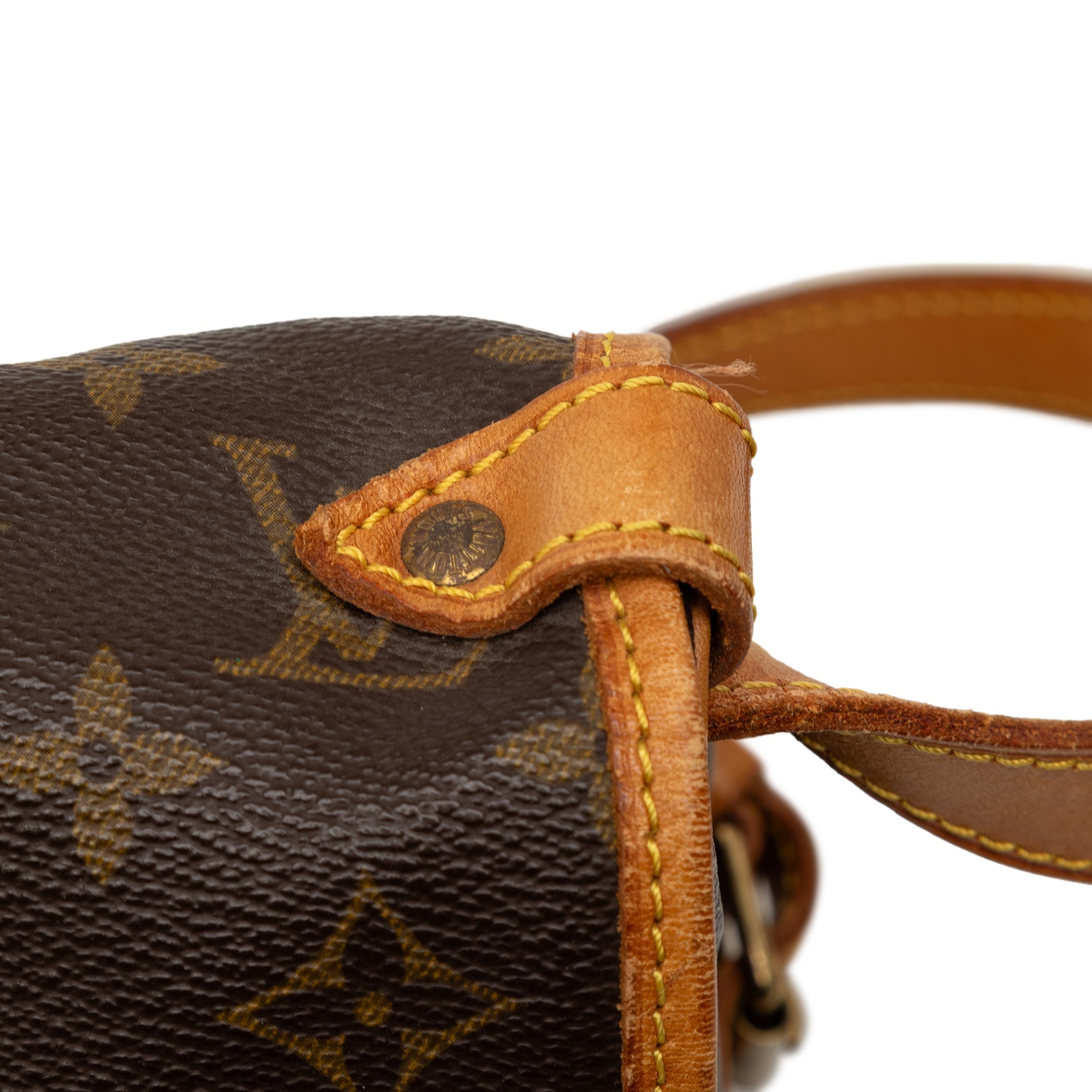 The Saumur 25 features a monogram canvas body with vachetta leather trim, an adjustable flat vachetta leather shoulder strap, double open compartments with front flaps and belt buckle closures. Retail Price: 1350.00