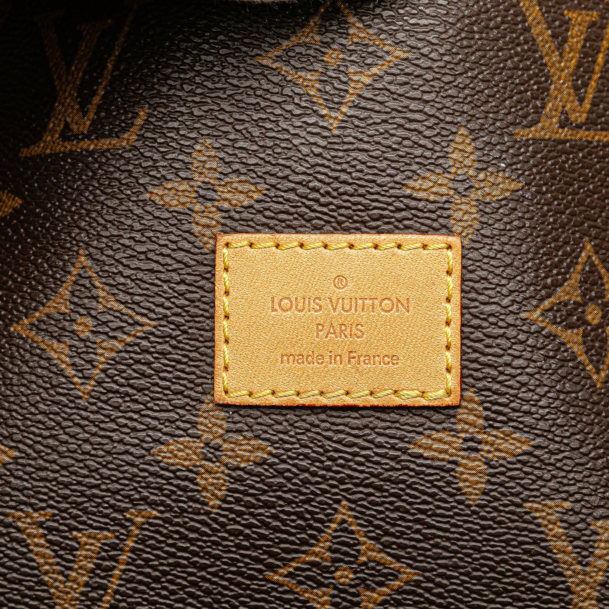 The Saumur 30 features a monogram canvas body with vachetta leather trim, an adjustable flat vachetta leather shoulder strap, double open compartments with front flaps and belt buckle closures, and an interior slip pocket. Retail Price: 1245.00