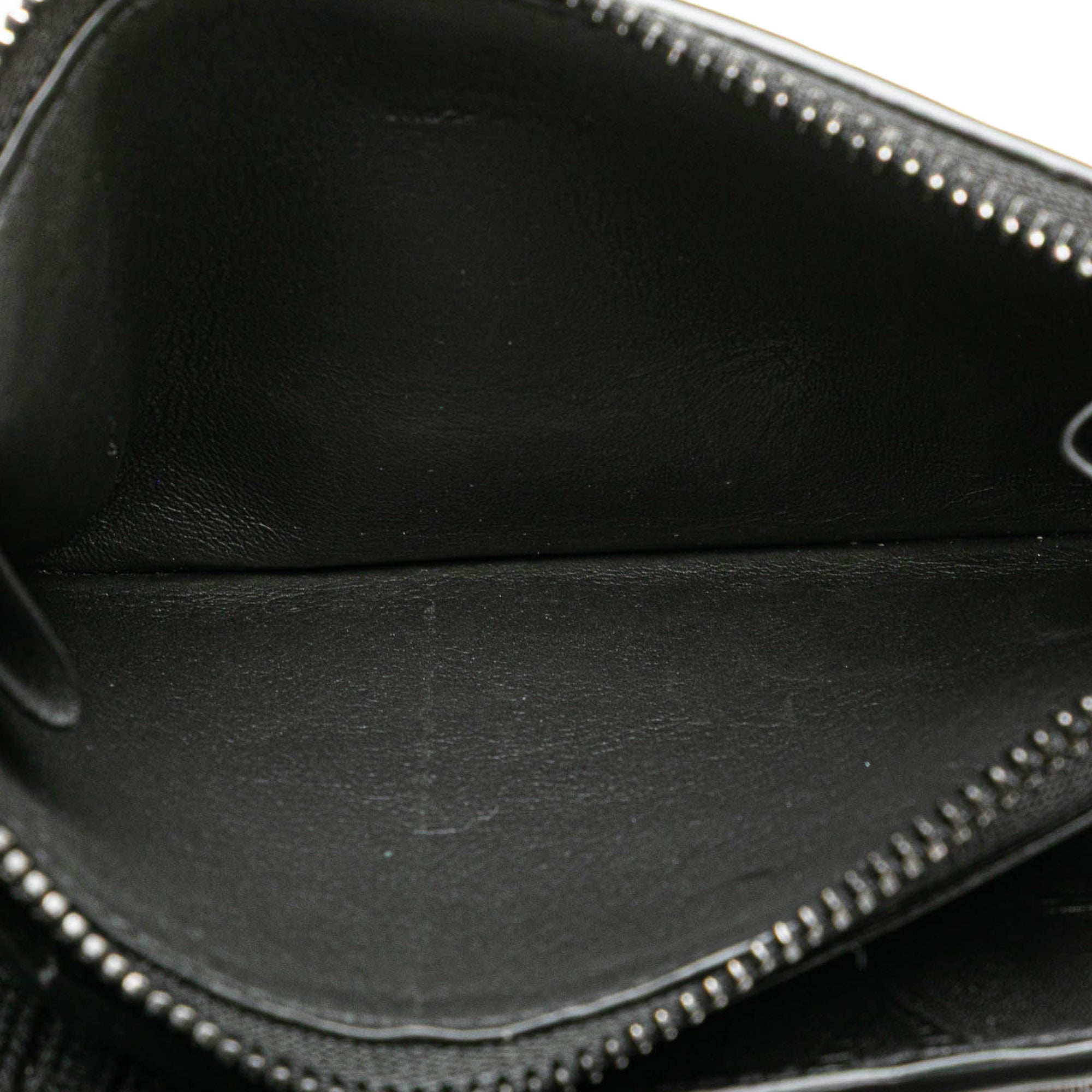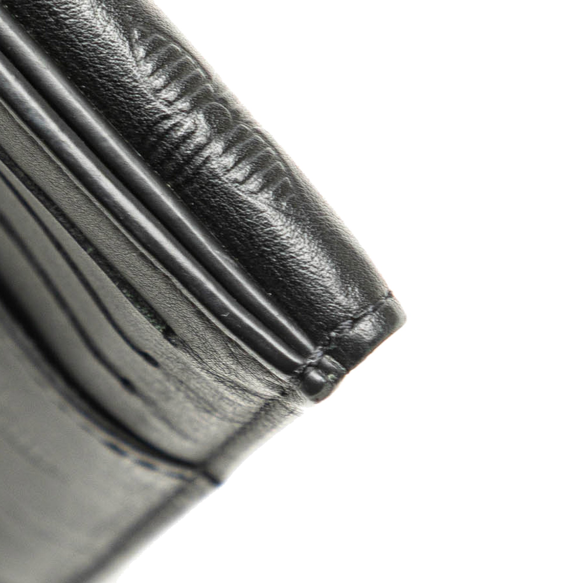 This wallet features a leather body, a front flap with a snap button closure, a top zip closure, exterior back card slots, and interior slip pockets. Retail Price: 720.00