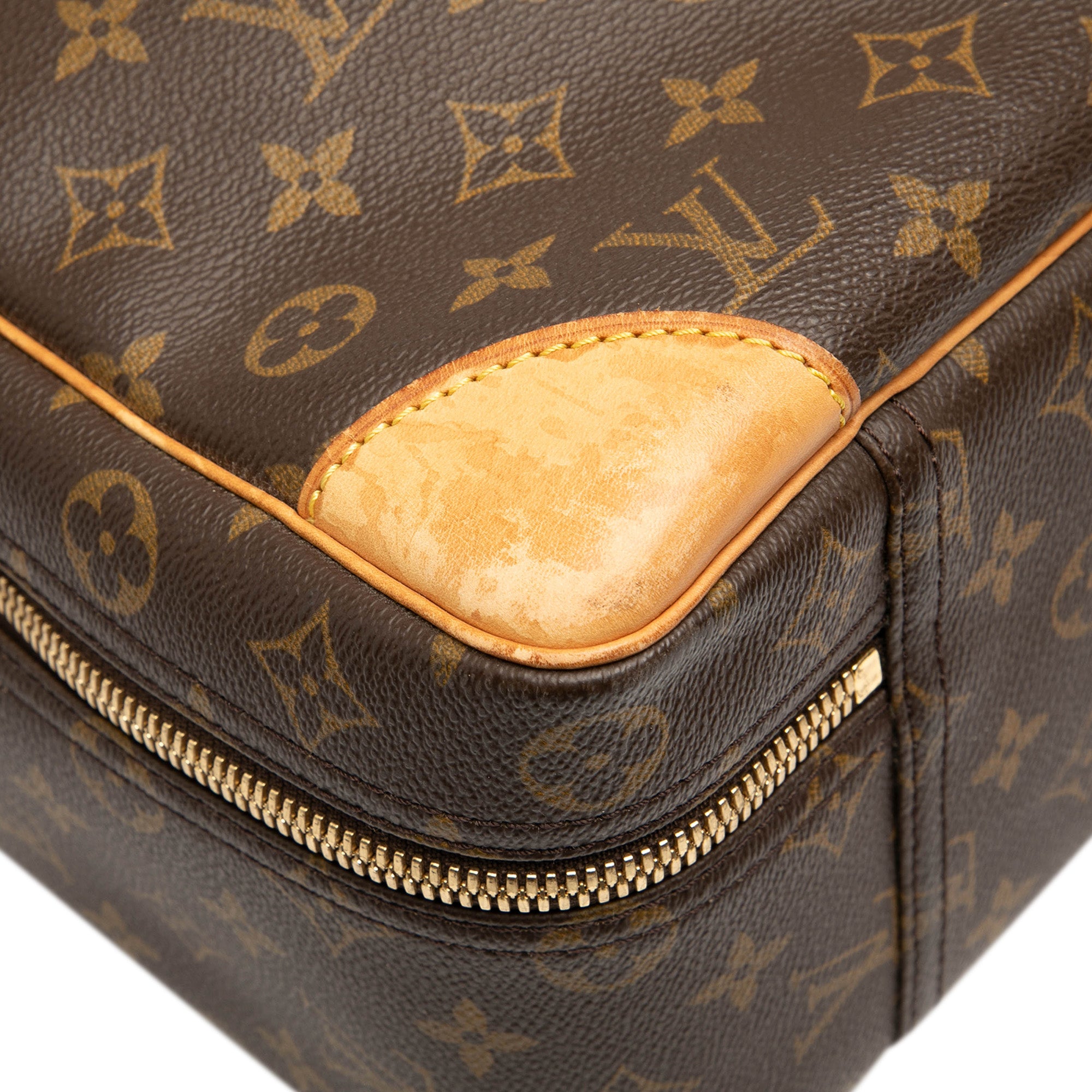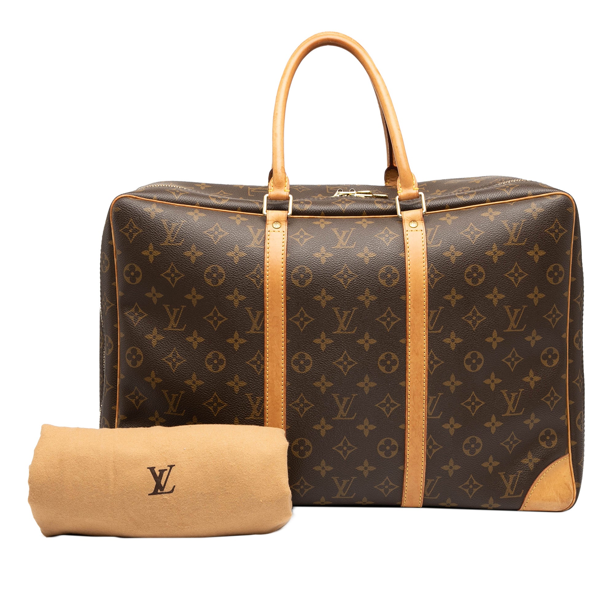 The Sirius 45 features a monogram canvas body with vachetta leather trim, rolled vachetta leather handles, a zip-around closure, and an interior slip compartment. Inclusion: Dust bag. Retail Price: 1960.00
