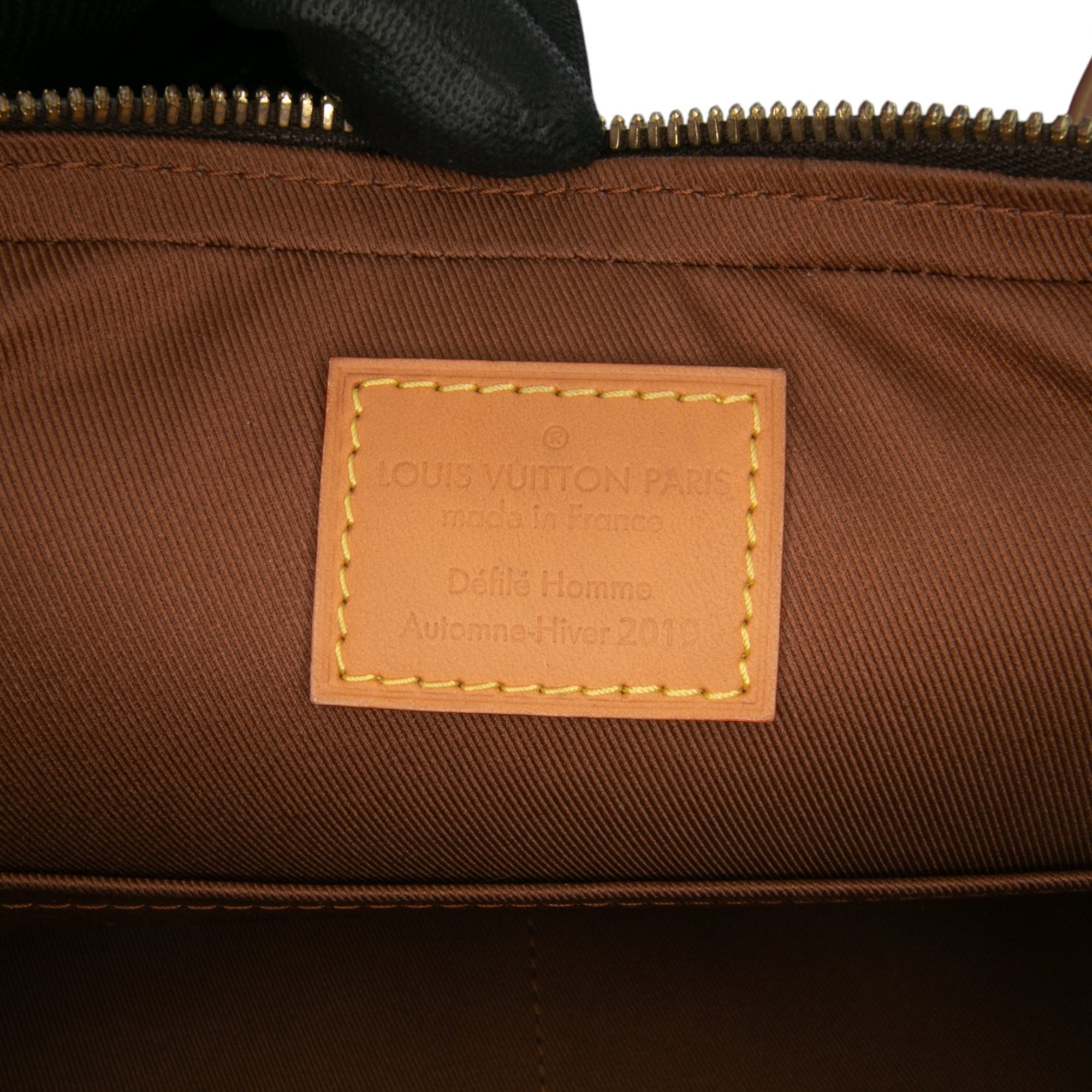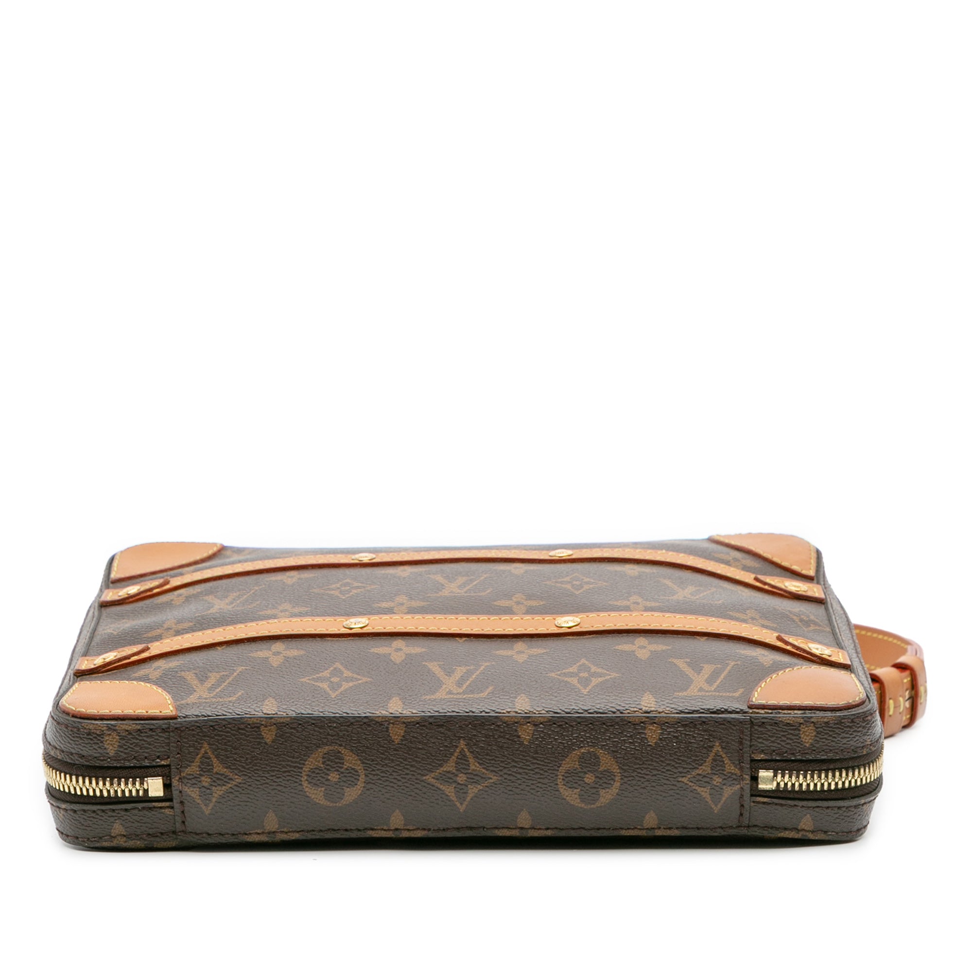 The Soft Trunk features a monogram canvas body with vachetta leather trim, a flat vachetta leather strap, a zip around closure, and interior slip pockets. Retail Price: 2665.00