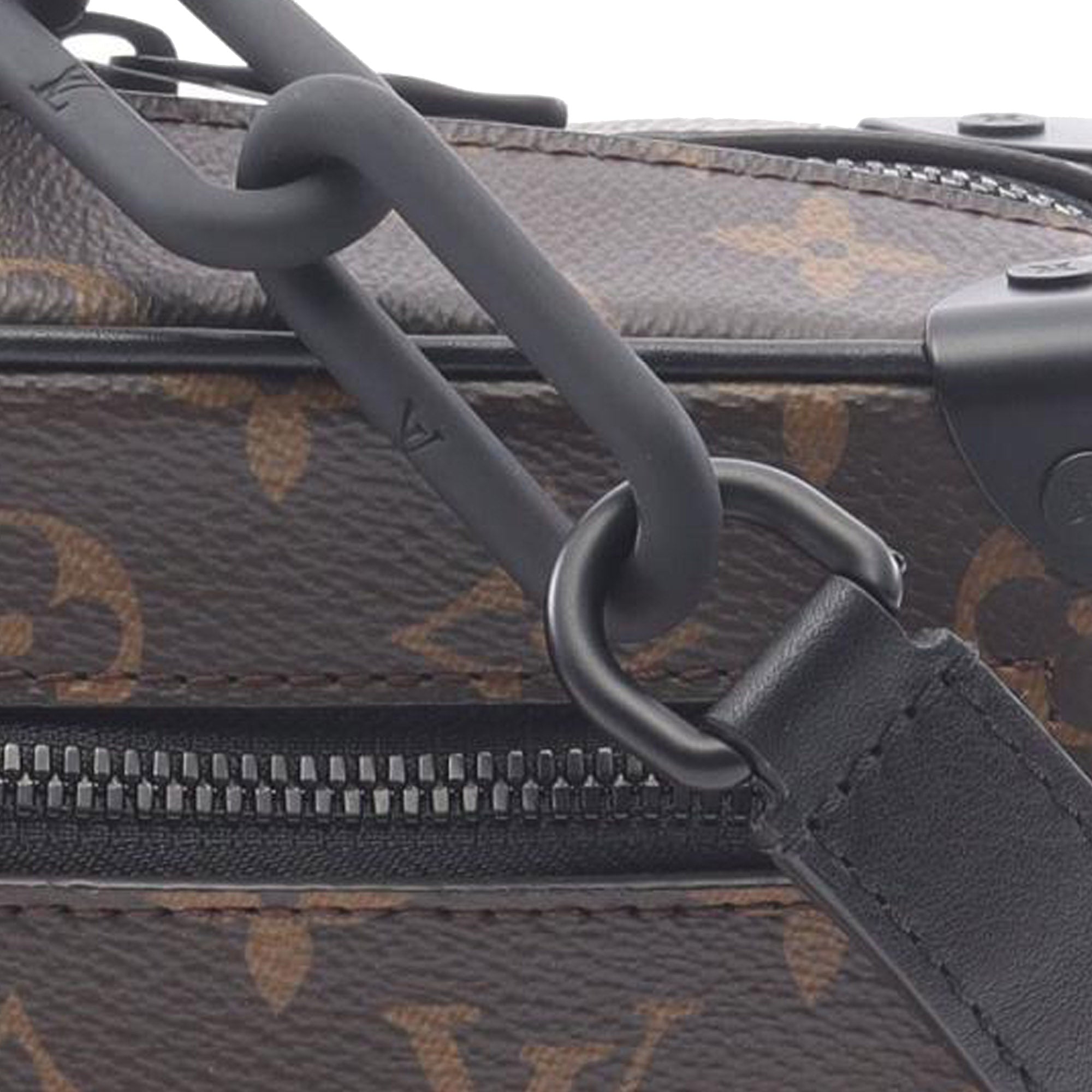 The Mini Soft Trunk features monogram canvas body with leather trim, a flat leather and chain strap, a top zip closure, an exterior front zip pocket, and an interior slip pocket. Retail Price: 2810.00
