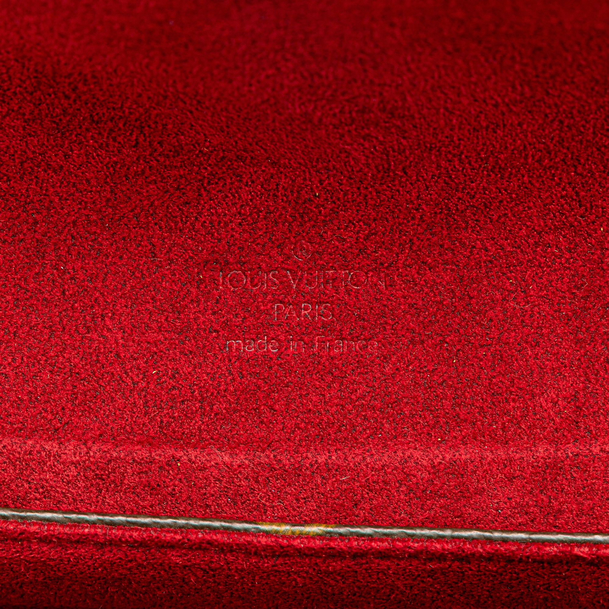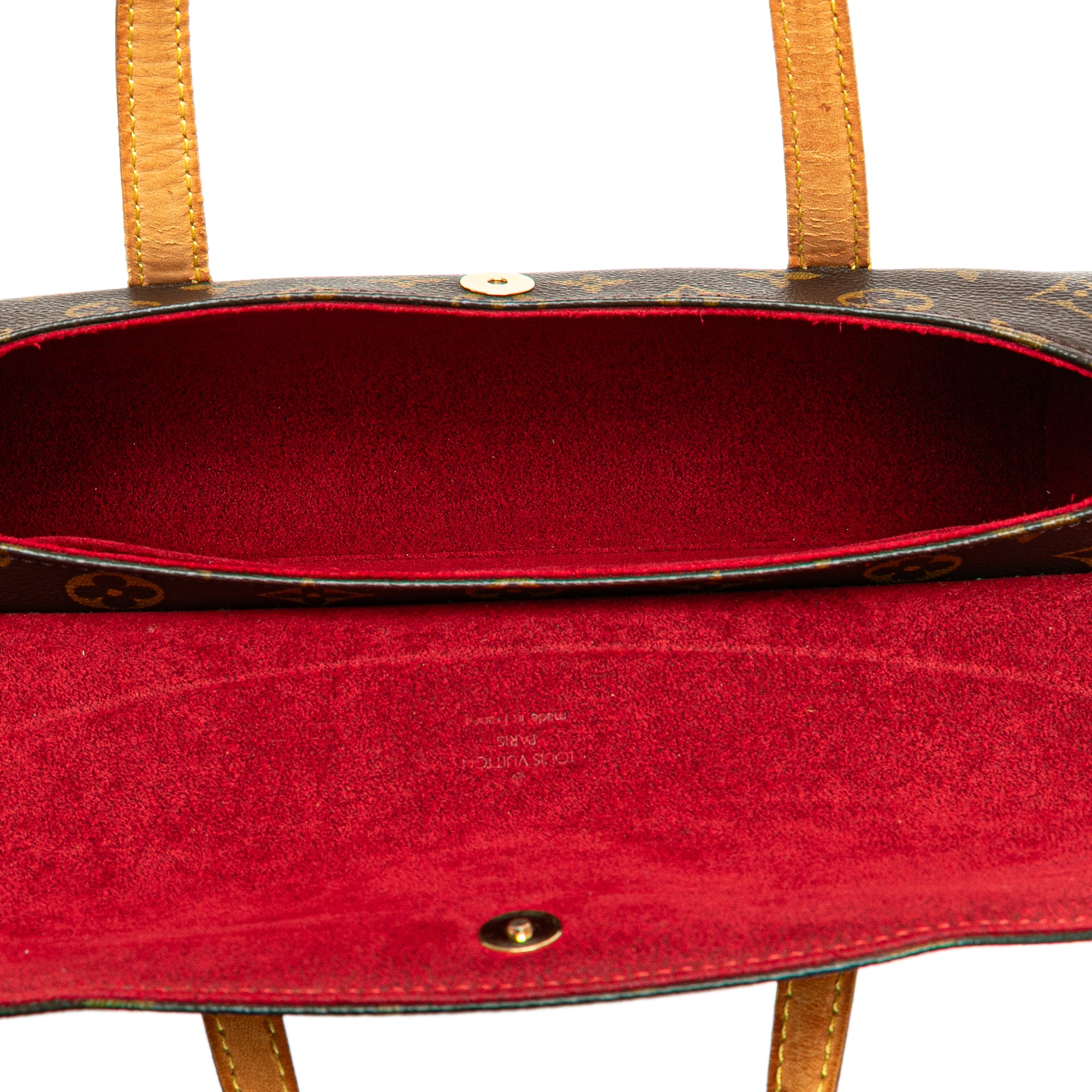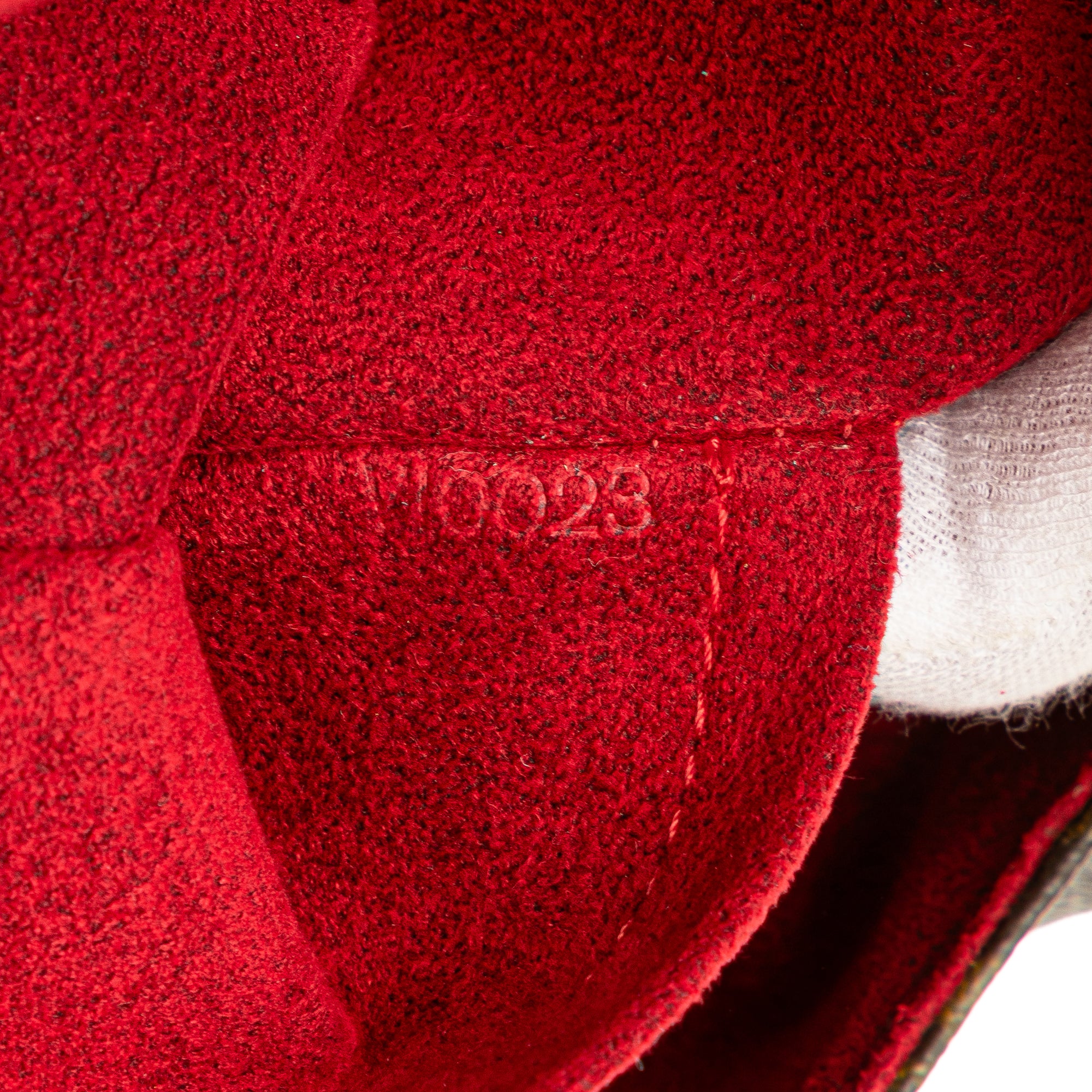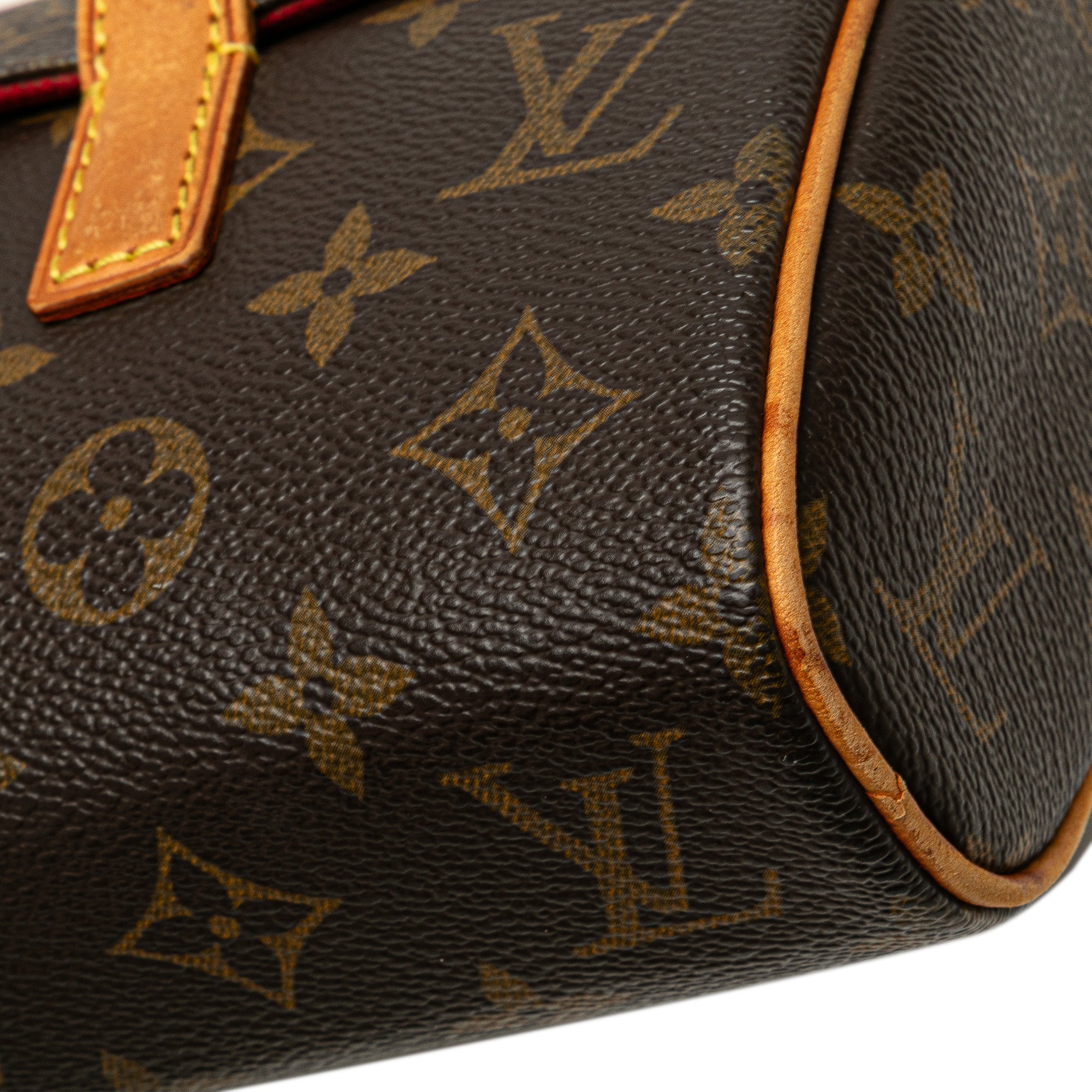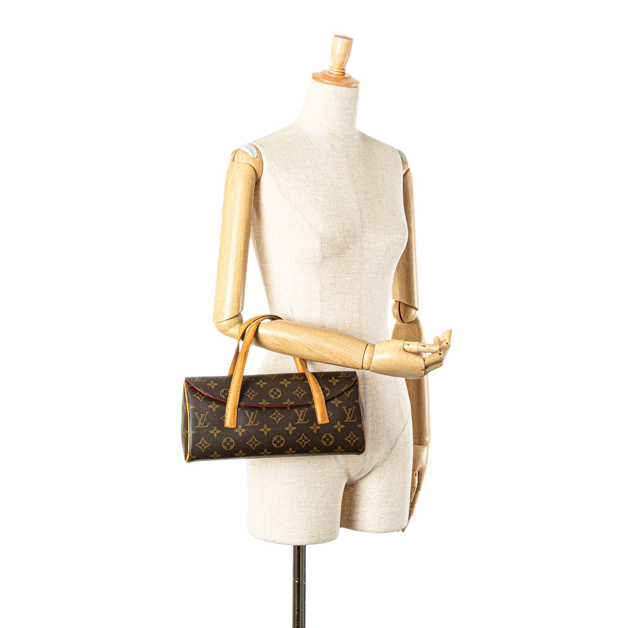 The Sonatine features a monogram canvas body with vachetta leather trim, flat vachetta leather handles, a flap with magnetic snap closure, and interior slip pockets. Inclusion: Dust bag. Retail Price: 875.00