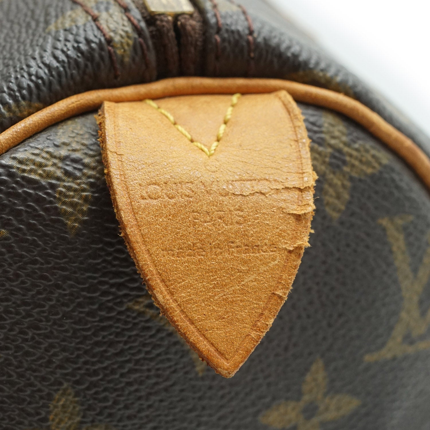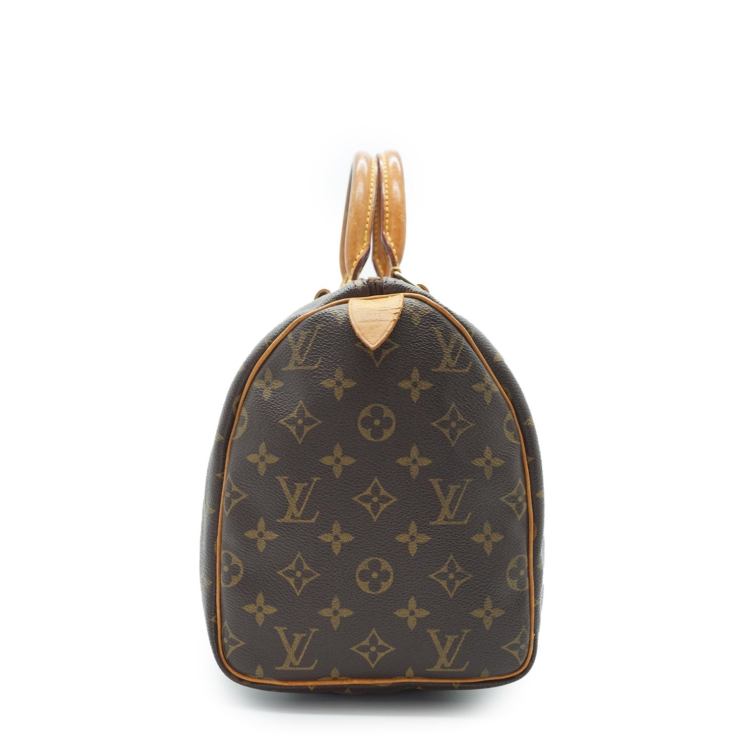 Monogram Speedy 30 Brown Canvas, LeatherDepth: 16.5cmHeight: 21cmWidth: 30.5cmHand Drop: 11.5cmOutside Rank: BInside Rank: BStain: Some water stains on the leather parts (top handle)Discoloration: Some hardware tarnish and discoloration on the leather parts (top handle)Scratch: Some scratches on the leather parts (top handle)Peeling: Some leather cracking overall, with the zipper pull slightly looseWorn: Some signs of wear on the leather parts and hardwareOdor: No odor presentInclude: Padlock, 2 keysComments: The logo stamp is slightly fadingSerial code: TH0072SKU: 7030168