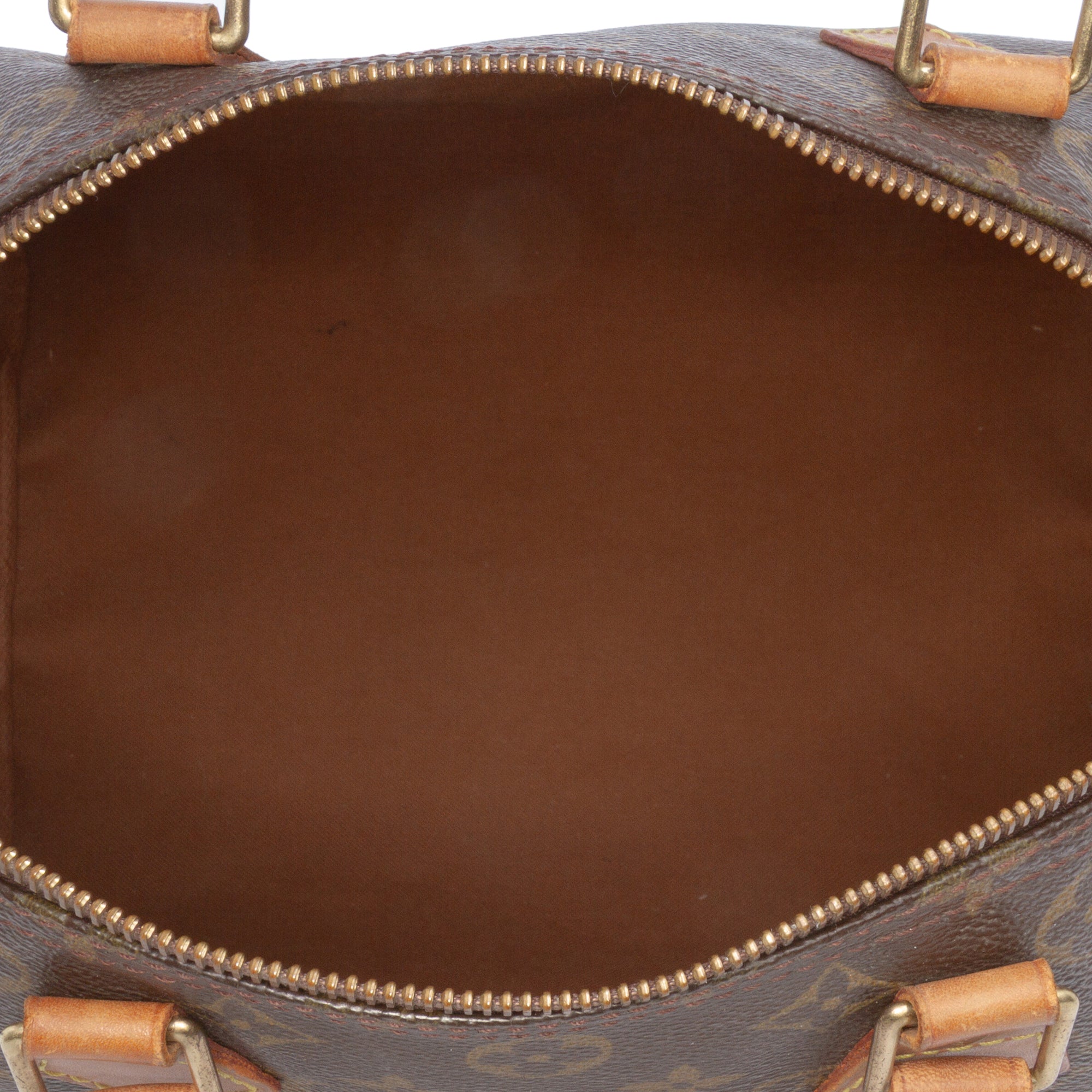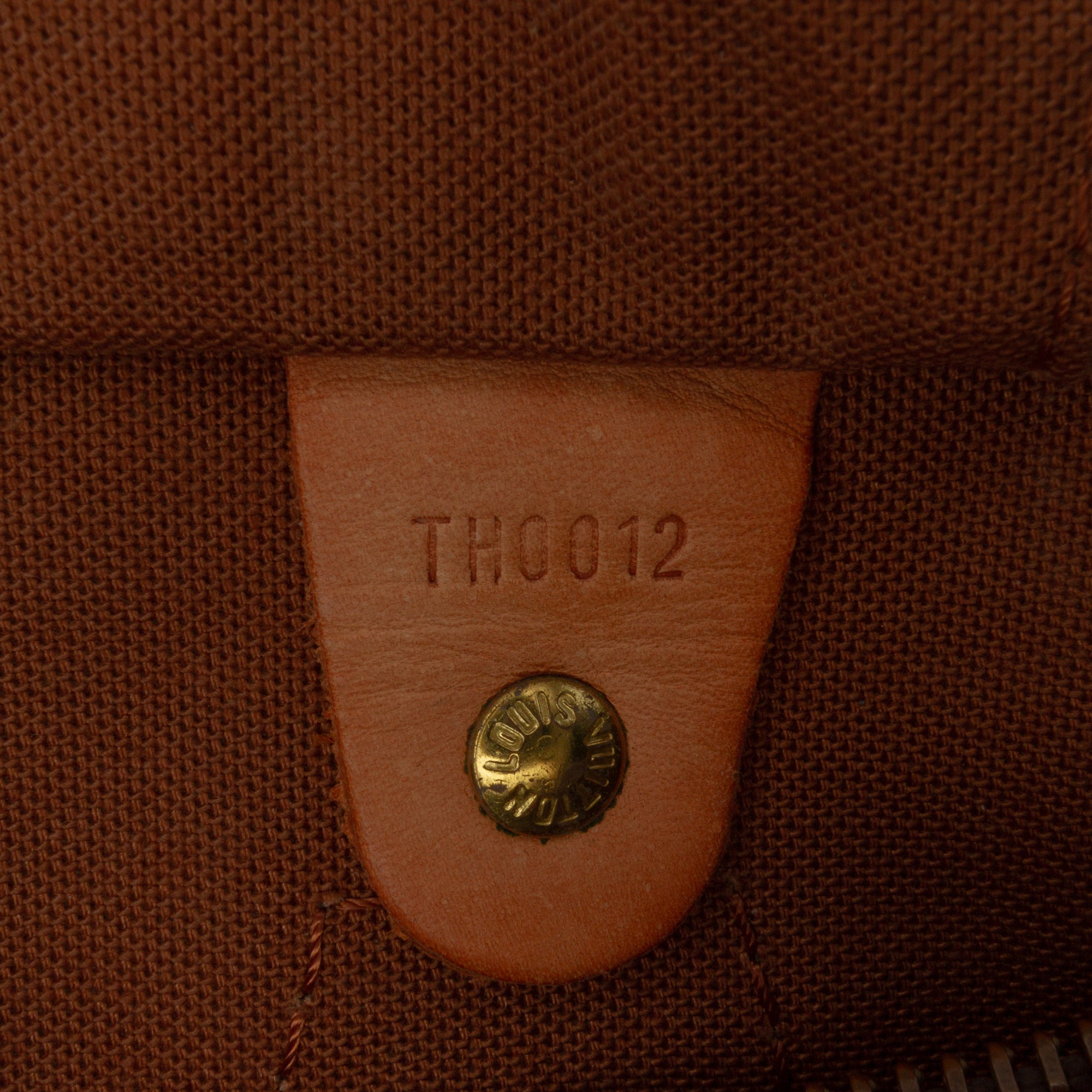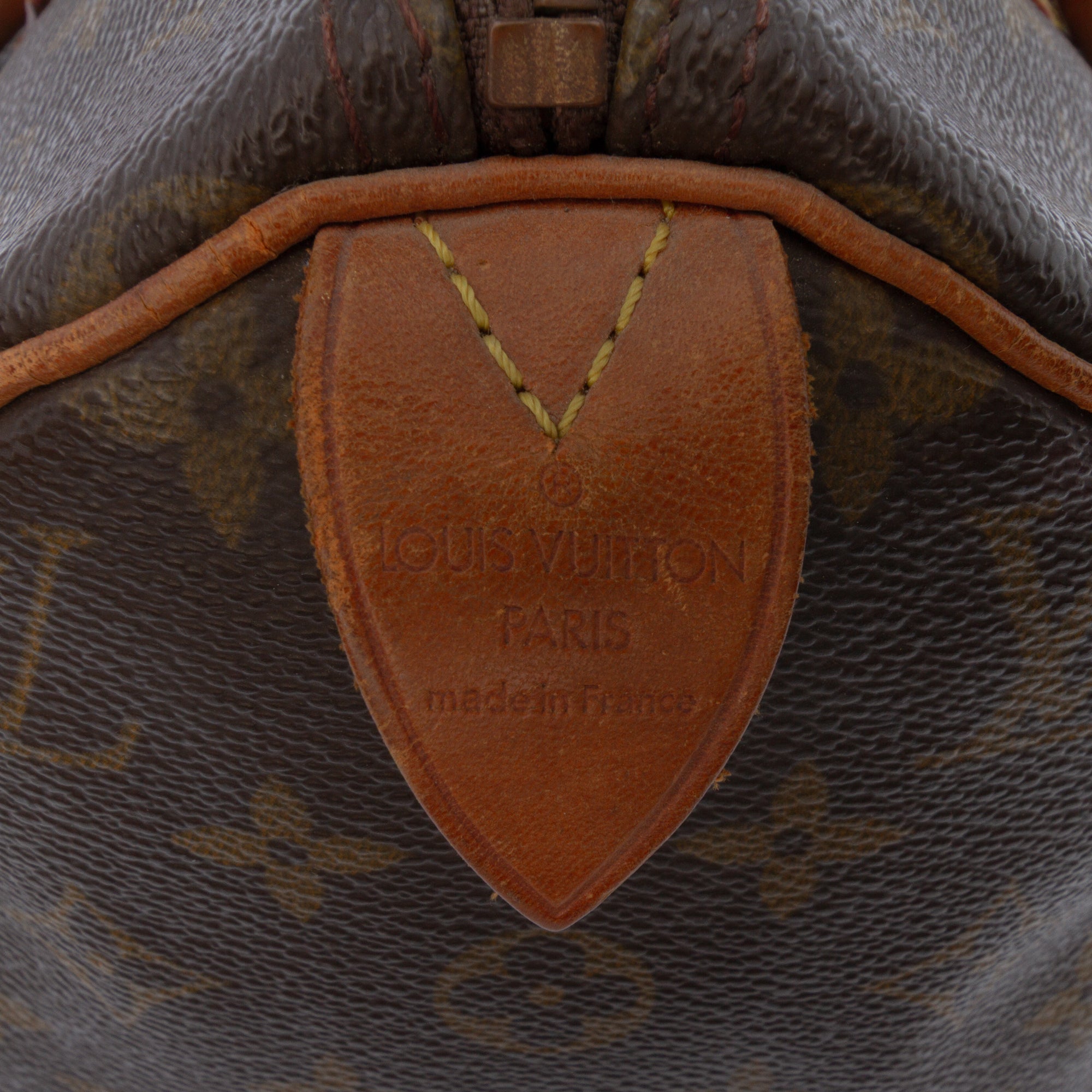 The Speedy 30 features a monogram canvas body with vachetta leather trim, rolled vachetta leather handles, a top zip closure, and an interior slip pocket. Retail Price: 1375.00