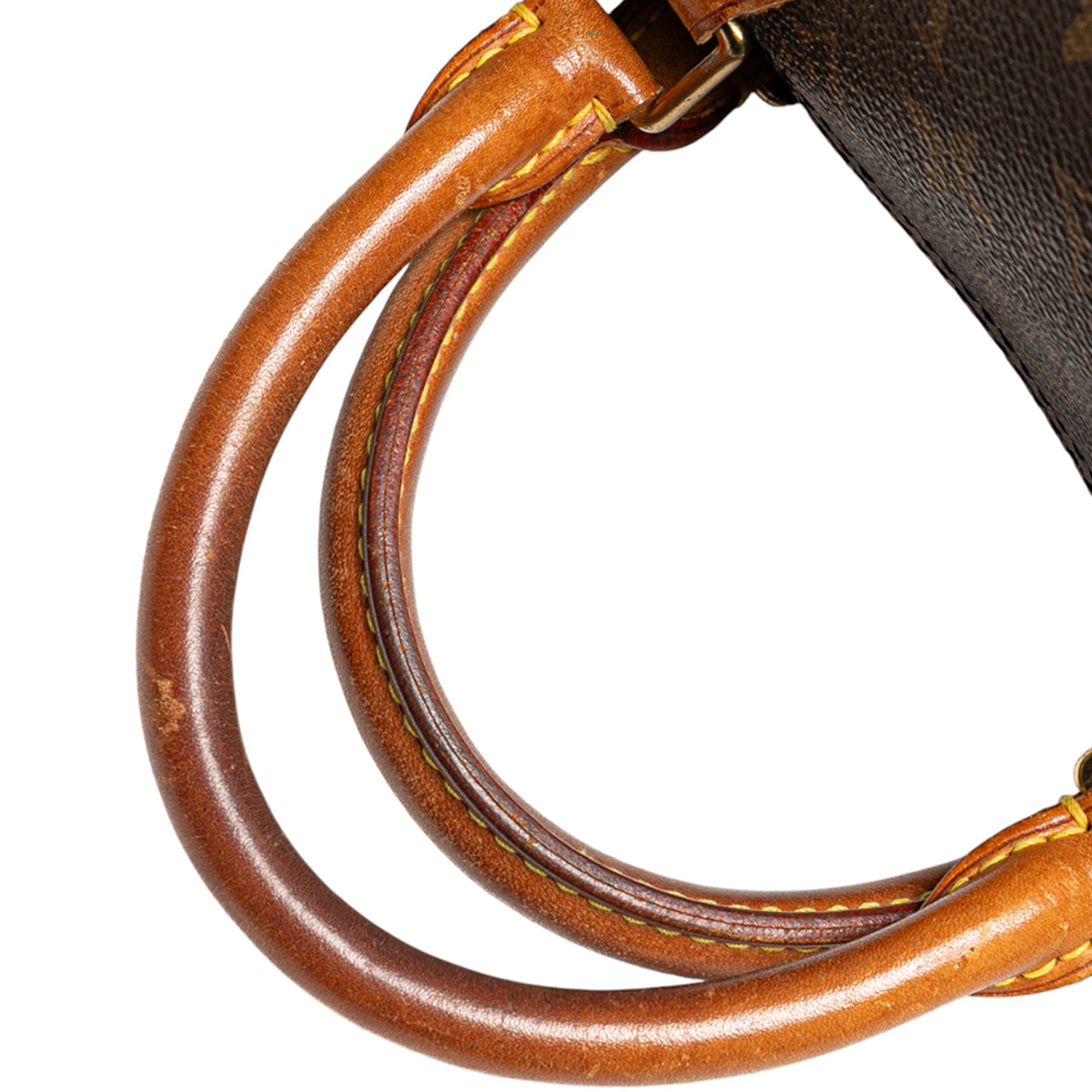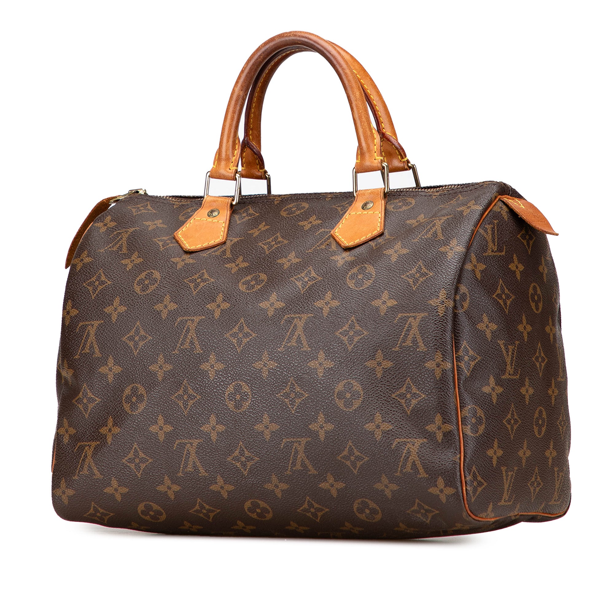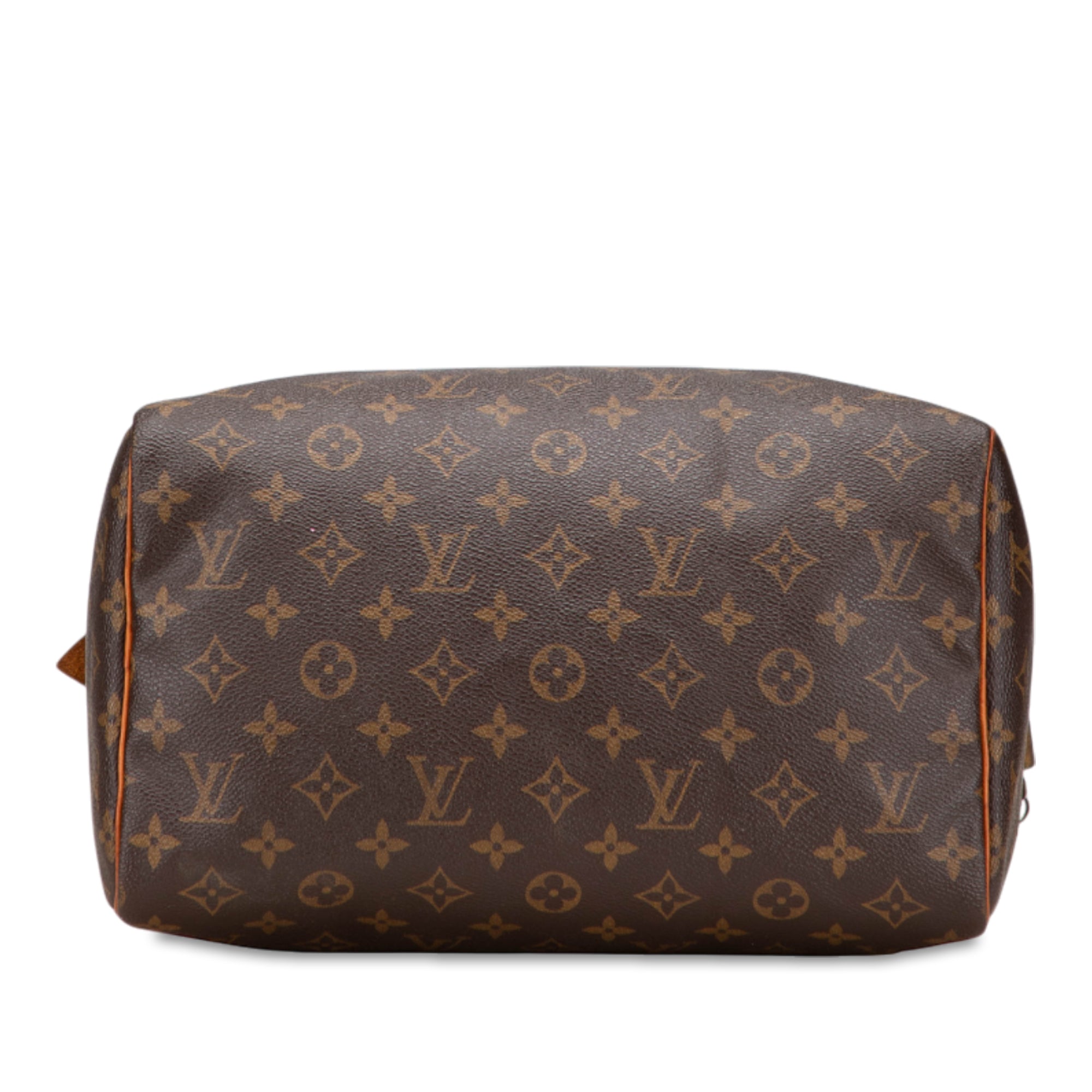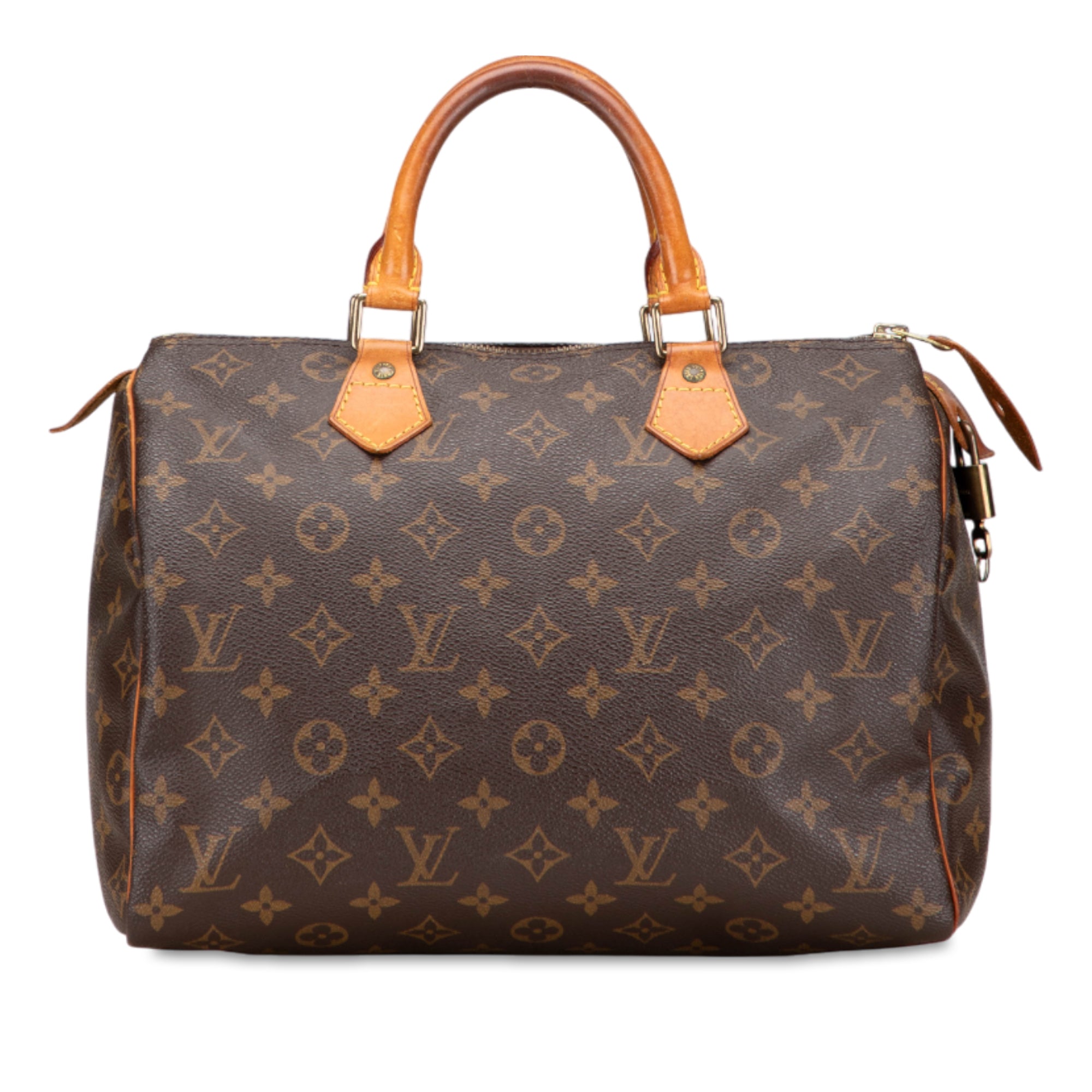The Speedy 30 features a monogram canvas body with vachetta leather trim, rolled vachetta leather handles, a top zip closure, and an interior slip pocket. Retail Price: 1375.00